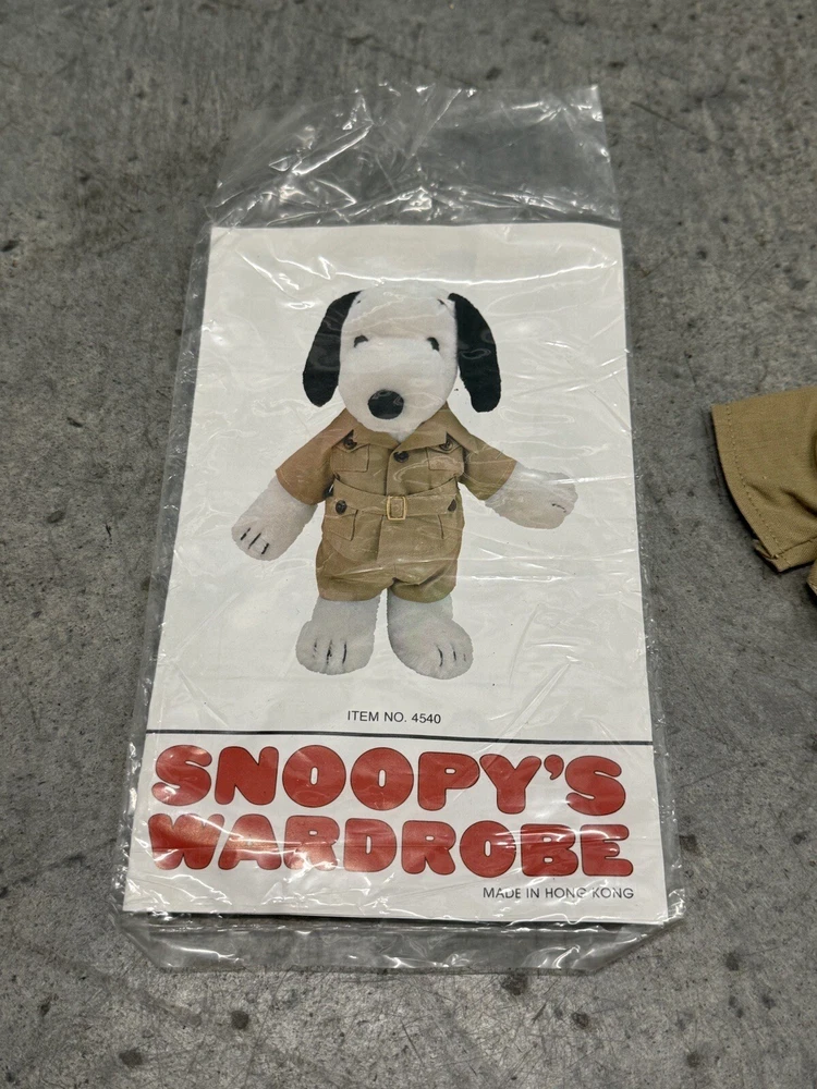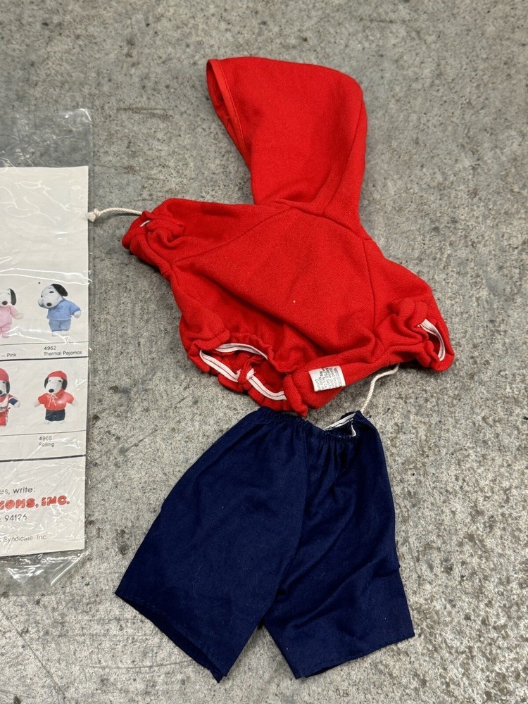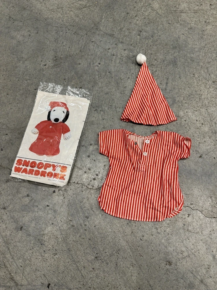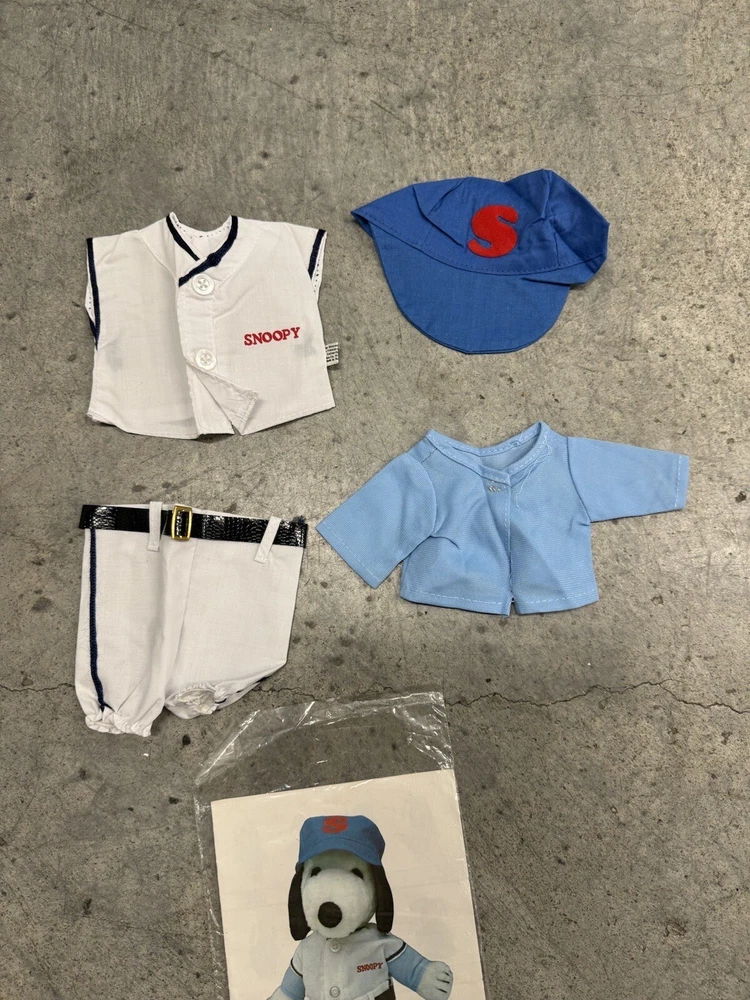 Vintage Snoopy Peanuts Plush 1958 Outfits Snoopy Wardrobe Lot of 6 Costumes. All 6 of the Snoopy outfits are pre-owned and are in good condition, look to have little or usage to them all. The brown / tan colored jacket outdoor outfit is missing the bottom pants to the costume, the rest of the outfits look to be complete. I also noticed the pajamas outfit does have a couple of light stains to them, please the photos to see the areas.