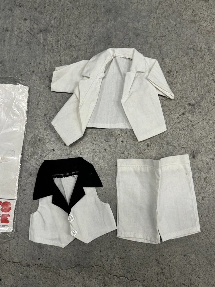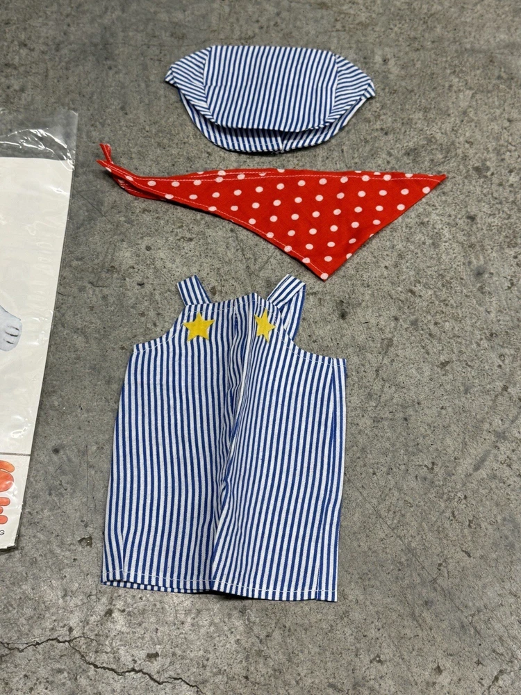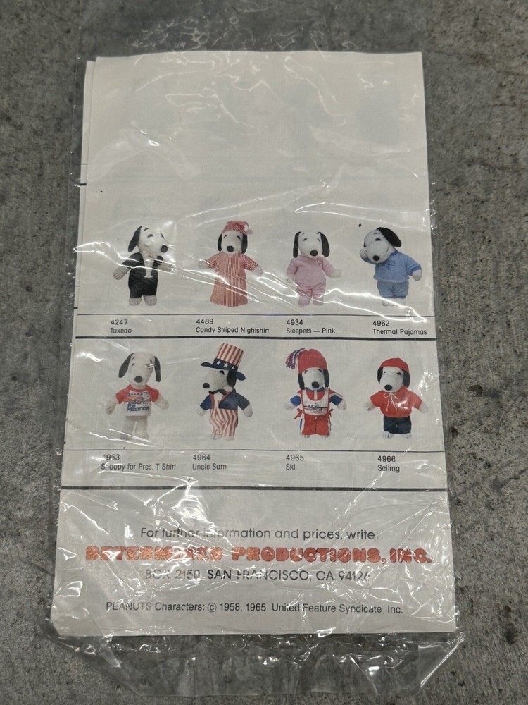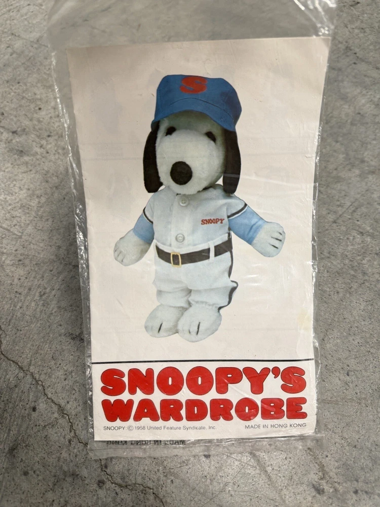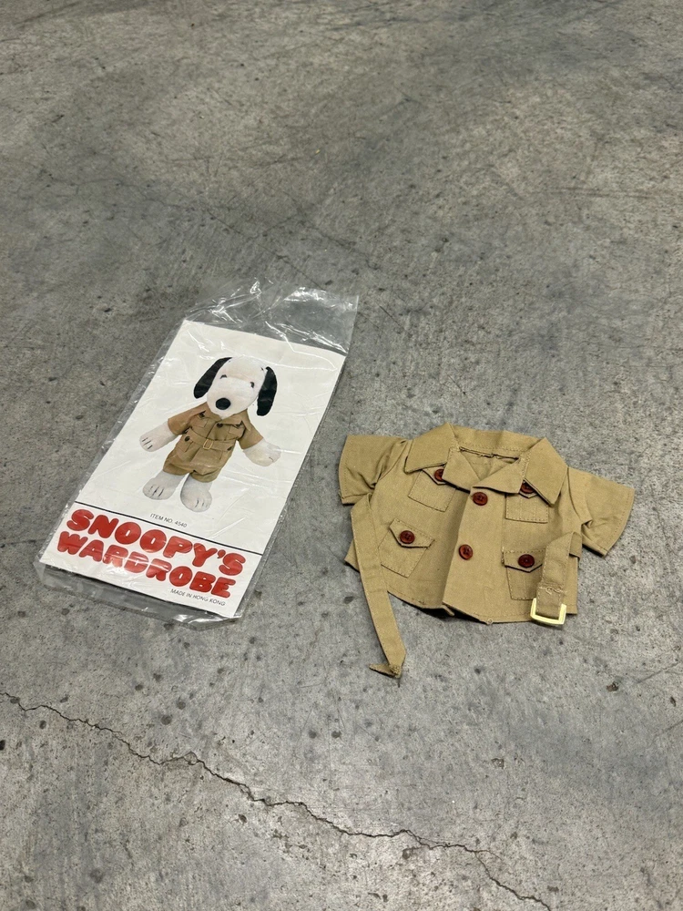 Vintage Snoopy Peanuts Plush 1958 Outfits Snoopy Wardrobe Lot of 6 Costumes. All 6 of the Snoopy outfits are pre-owned and are in good condition, look to have little or usage to them all. The brown / tan colored jacket outdoor outfit is missing the bottom pants to the costume, the rest of the outfits look to be complete. I also noticed the pajamas outfit does have a couple of light stains to them, please the photos to see the areas.