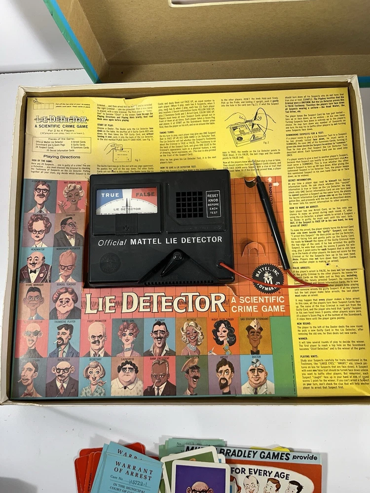 UPC: Does Not apply Game Type: Board Game gtin13: Does Not apply Brand: Mattel Gender: Boys & Girls Game Title: Lie Detector Min. Number of Players: 2 players Year: 1960