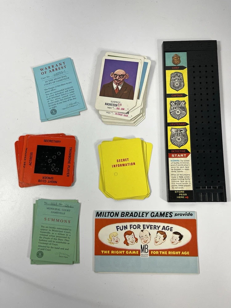 Vintage 1960 Mattel Lie Detector Scientific Crime Game w/ Box Game is missing 1 suspect card, 1 summons card and the 4 score pegs Probe tip has been replaced with aluminum tube. Cards have wear from use