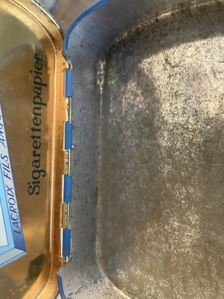 Estate item. It is quite old so there is some rust (please see photos), but the hinges work and there are no dents. It measures 4.5” x just over 3” x 1” The tin features a picture to commemorate the marriage of the Belgian king Badouin and Fabiol