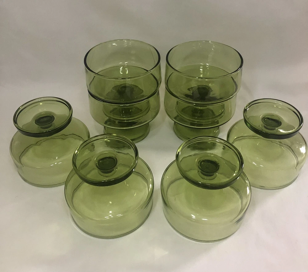 These are eight lovely little mid century dessert cups made by Anchor Hocking. The Finlandia line is a stunning avocado green glass set, smooth and free from imperfections. Each one is 3” tall with a 3.5” diameter cup sitting upon a footed base. They do stack inside one another if needed.