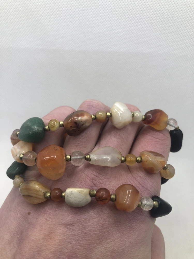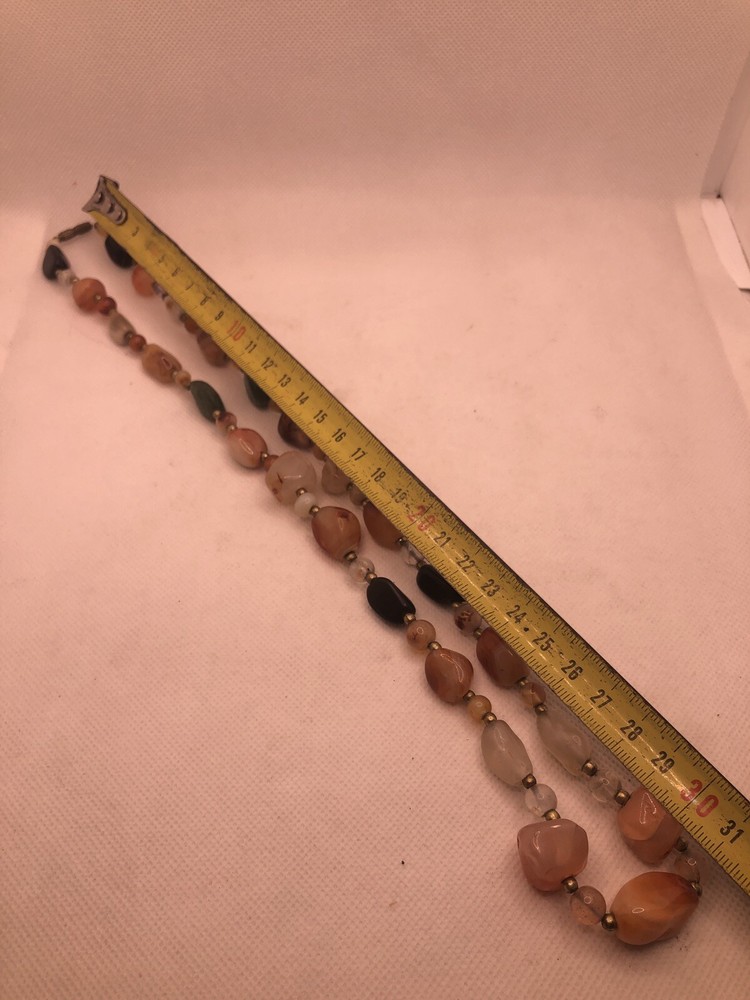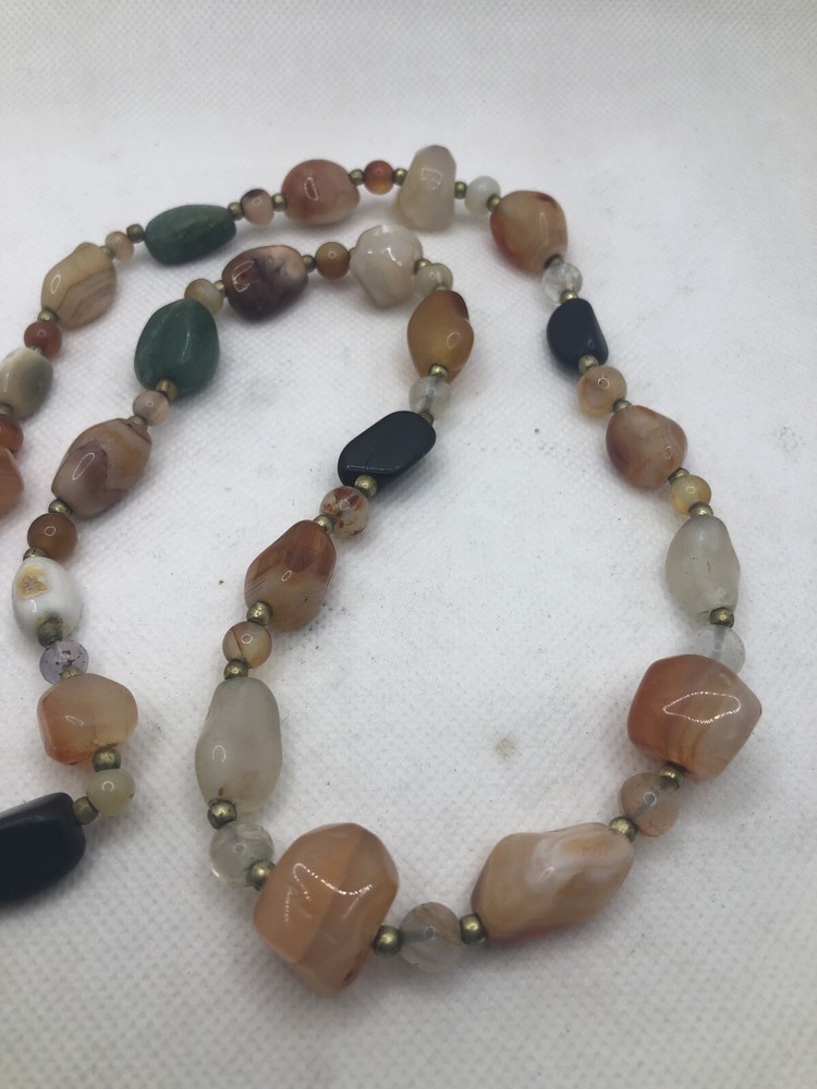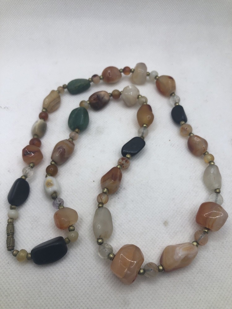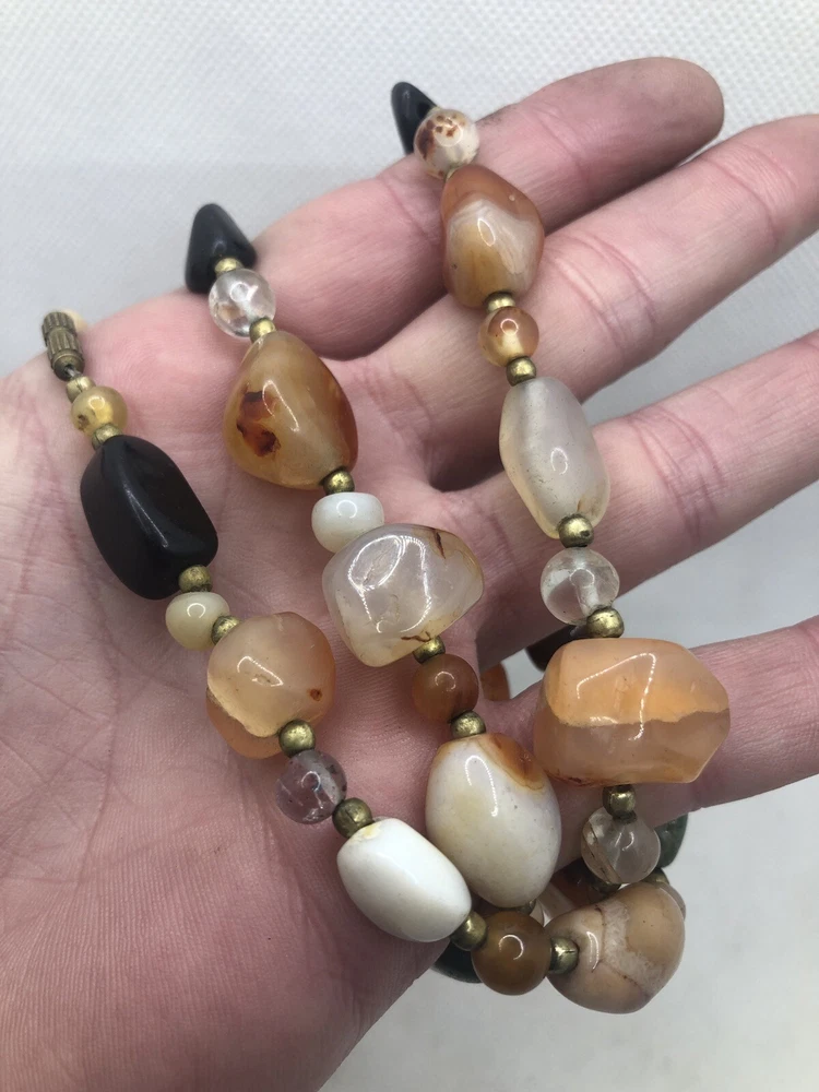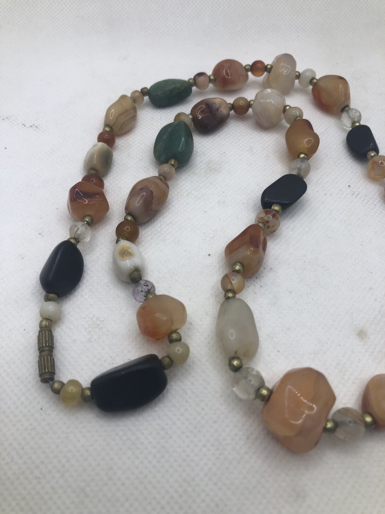 This beautiful vintage necklace is a unique piece of artistry, featuring a blend of gemstones such as Carnelian, Agate, and Quartz, with secondary stones like Jadeite, Onyx, and Quartz. The necklace has a beaded style with a barrel closure and is adorned with oval and round-shaped stones in multicolor, including brown, peach, green, black, and beige tones. Perfect for occasions like Christmas and birthdays, this handmade necklace boasts a bohemian, hippie, and Boho theme, making it a great addition to any jewelry collection. The necklace is an original piece from the 1960s-70s and is in excellent condition, making it a must-have for vintage jewelry enthusiasts.