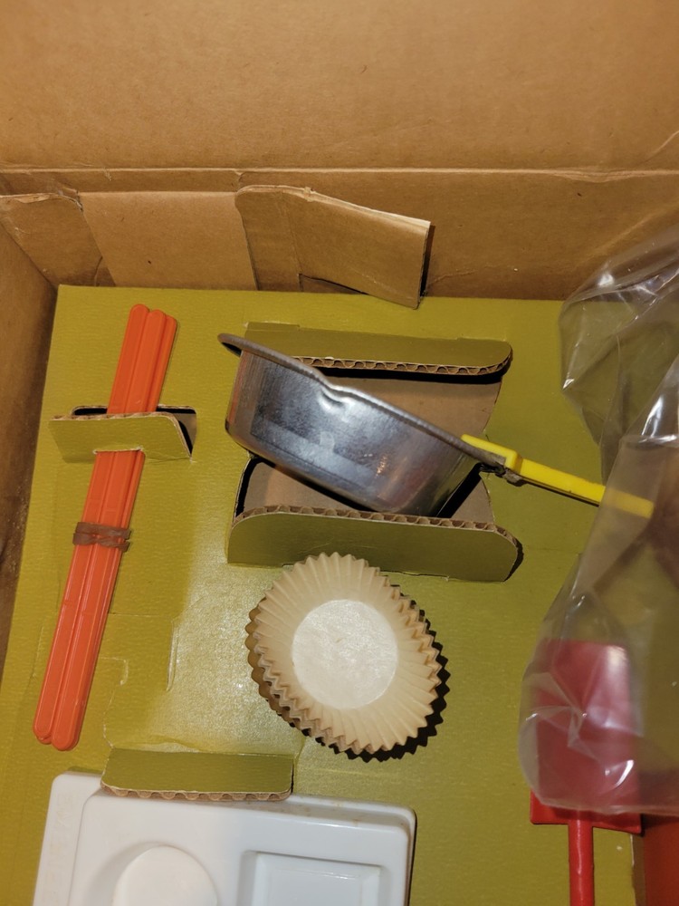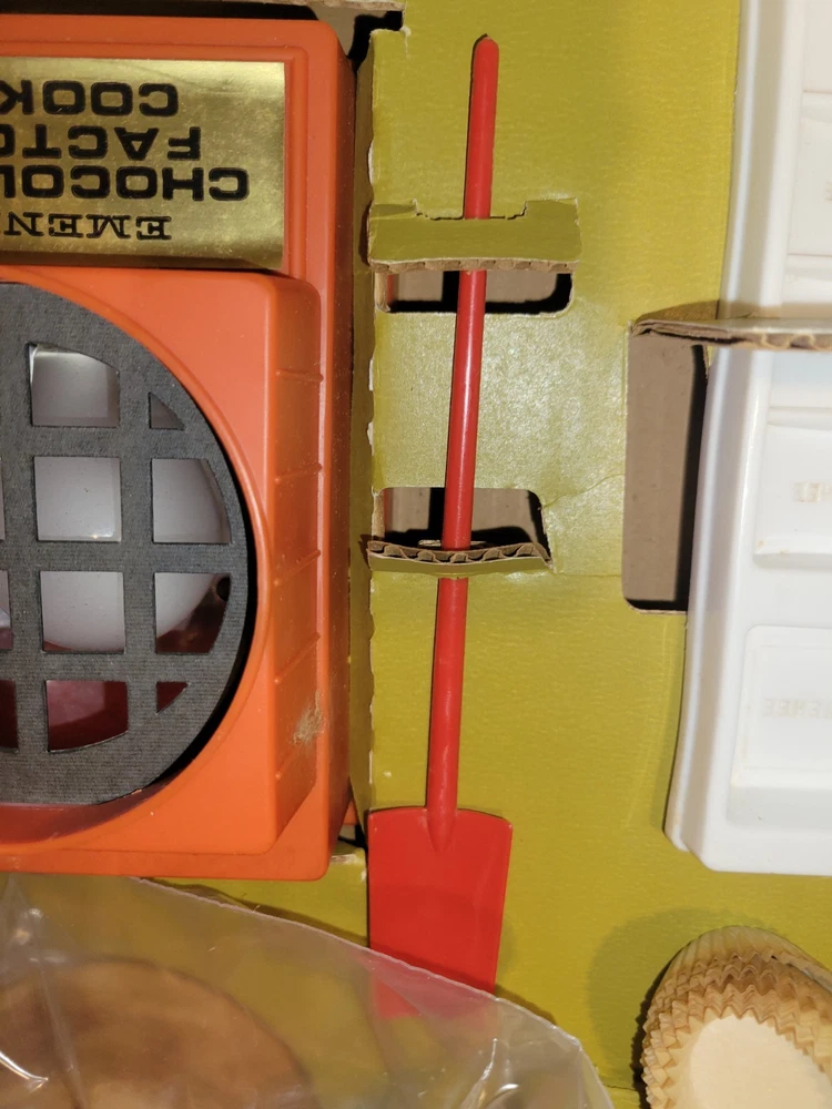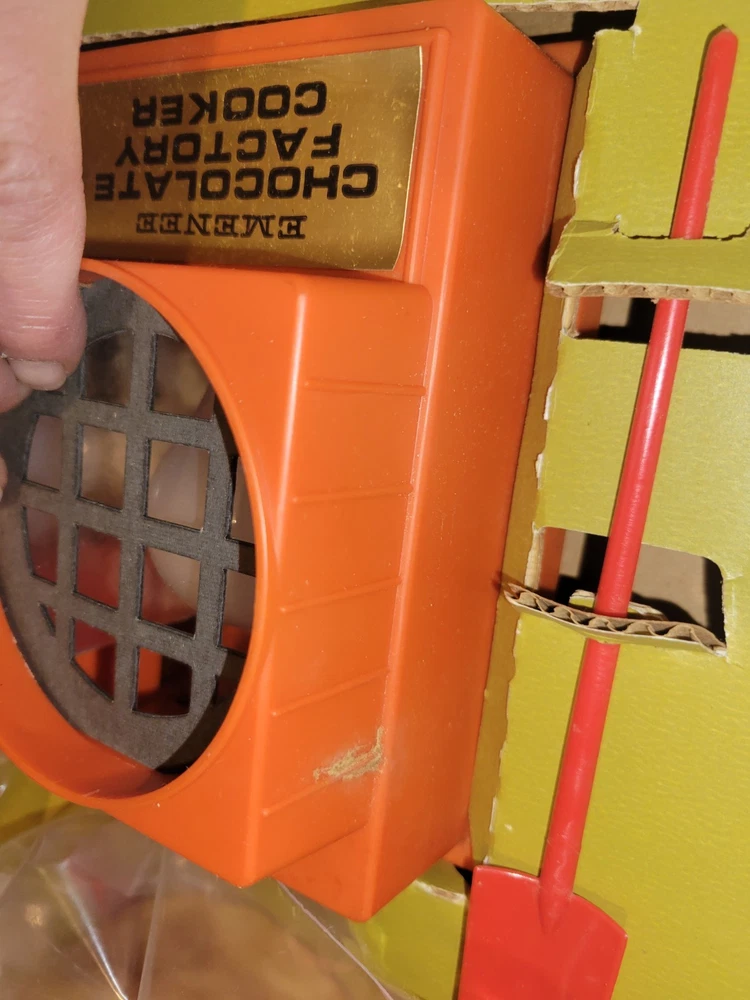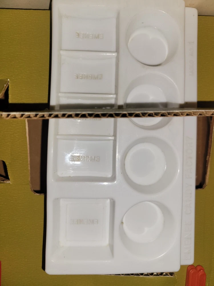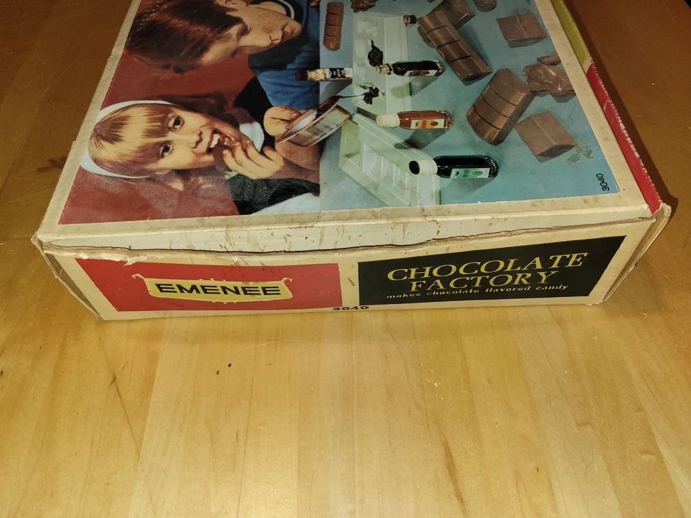 This vintage EMENEE Chocolate Factory is such a cool find! The unit works perfectly and looks amazing with its original box and instructions—nearly complete. The included sealed bag is a fun time capsule, though I wouldn’t recommend tasting it. It’s a fantastic display piece that brings back nostalgic vibes. Happy to answer any questions—thanks for the smooth transaction!