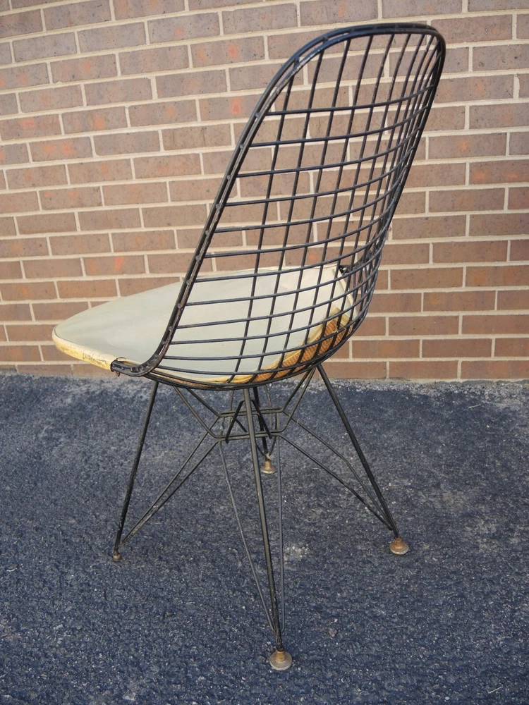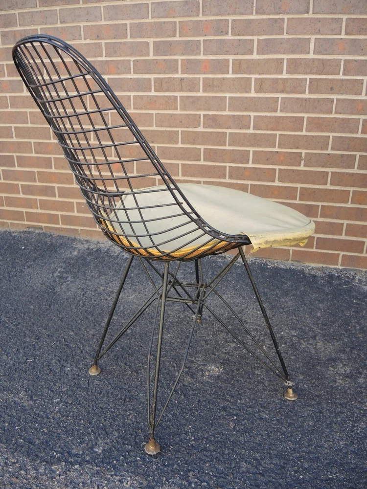 Being offered from a recent local estate is this Vintage 1960's Eames Herman Miller DKR-2 Wire Eiffel Bikini Chair with original Venice CA label. The chair is in original condition, missing one boot glide and upholstery seat back. Some wear from use. Please refer to the pictures for details.