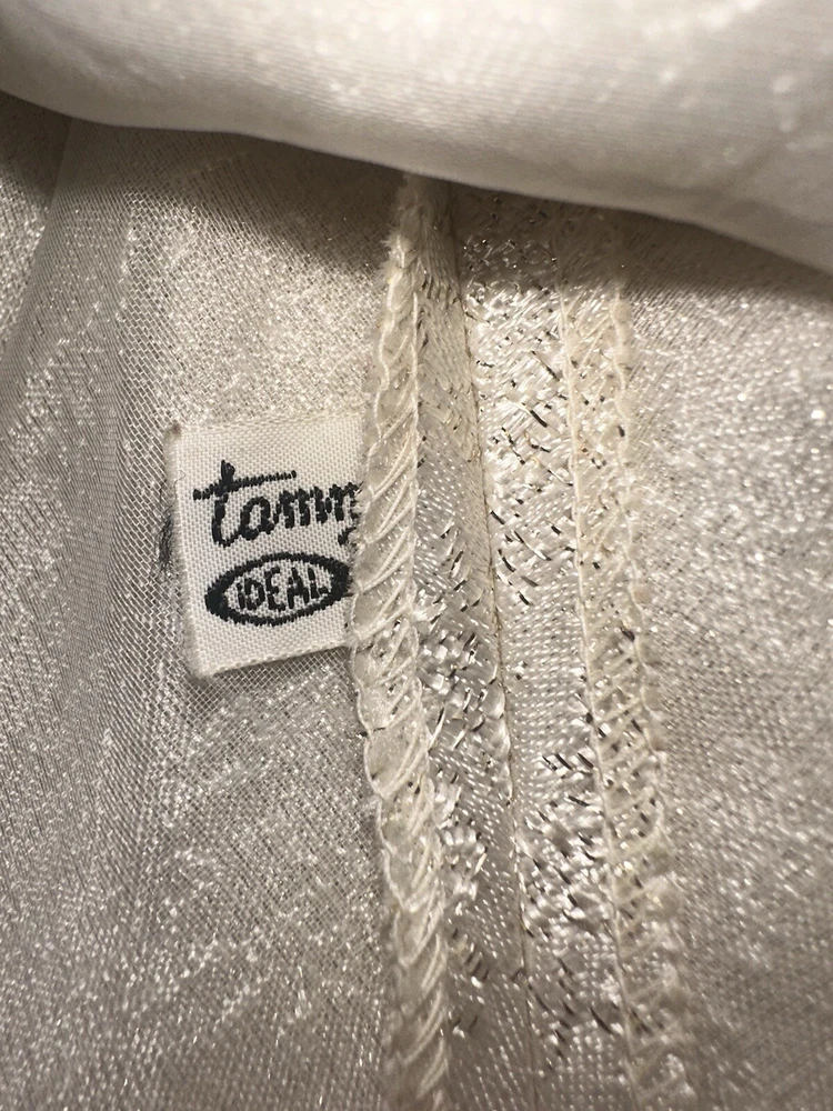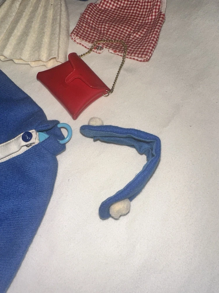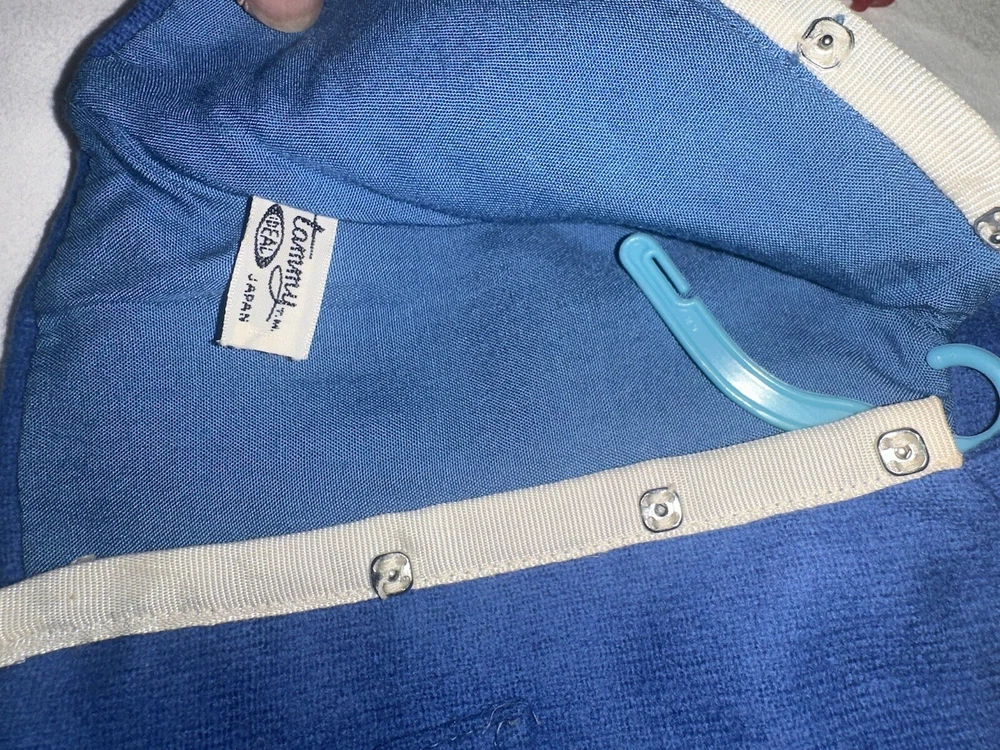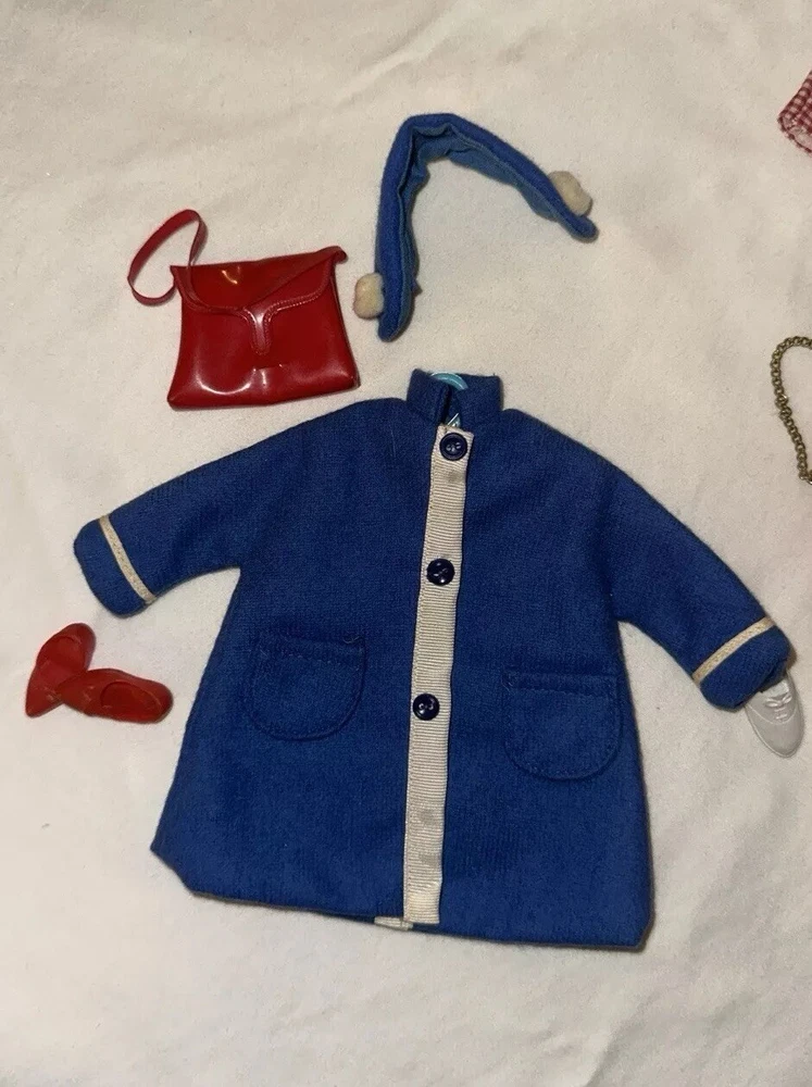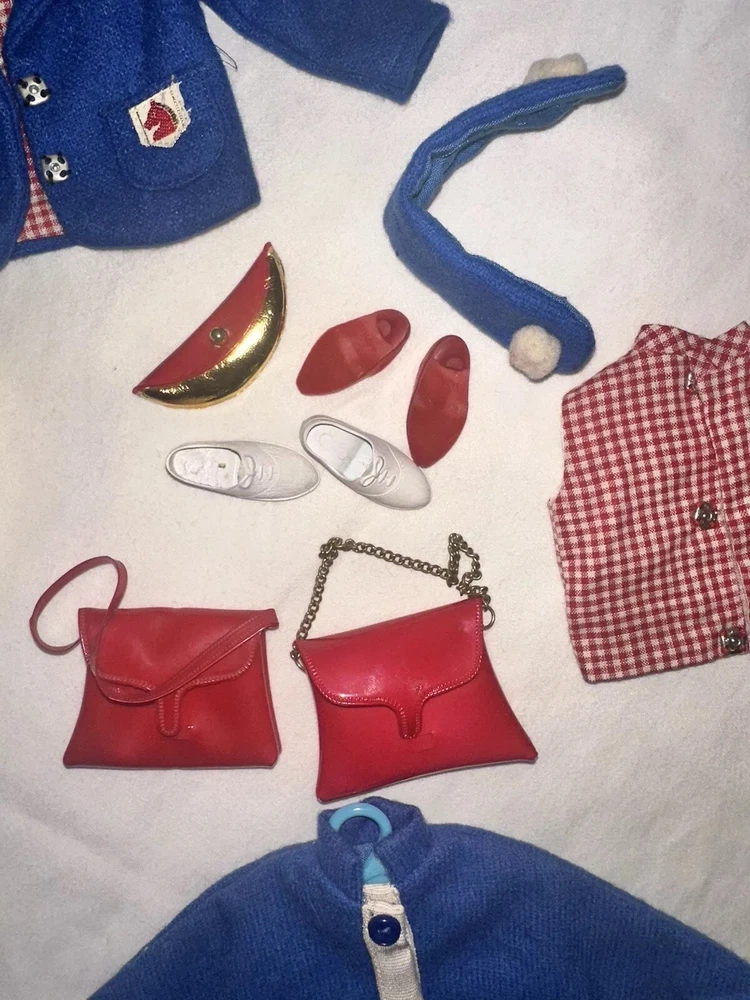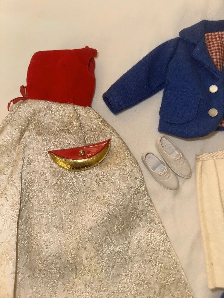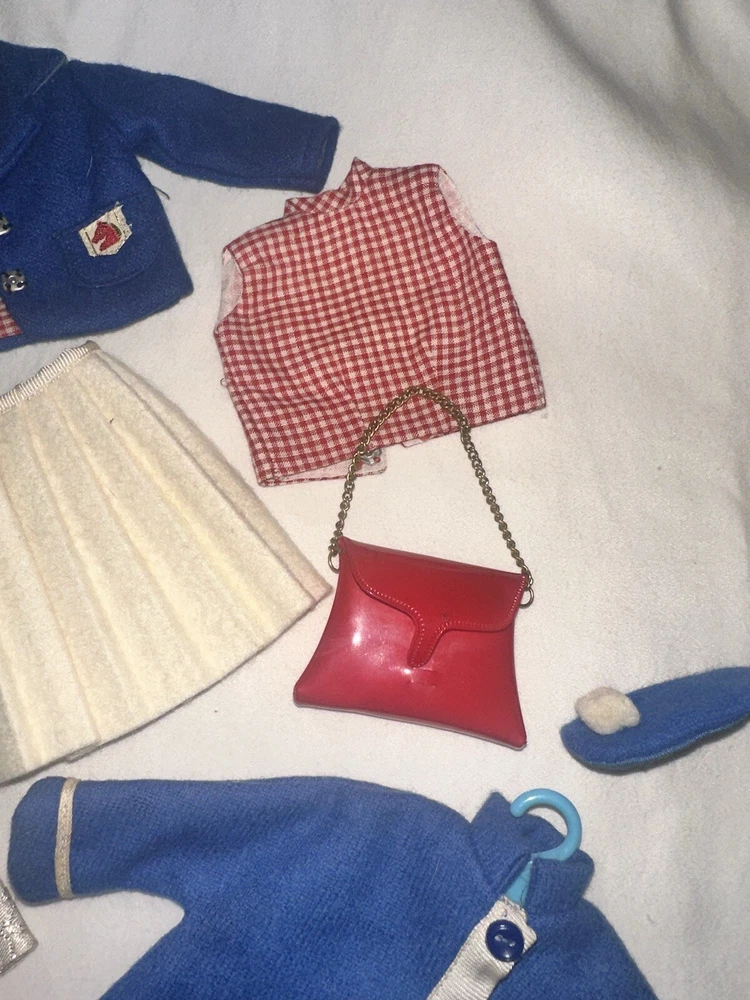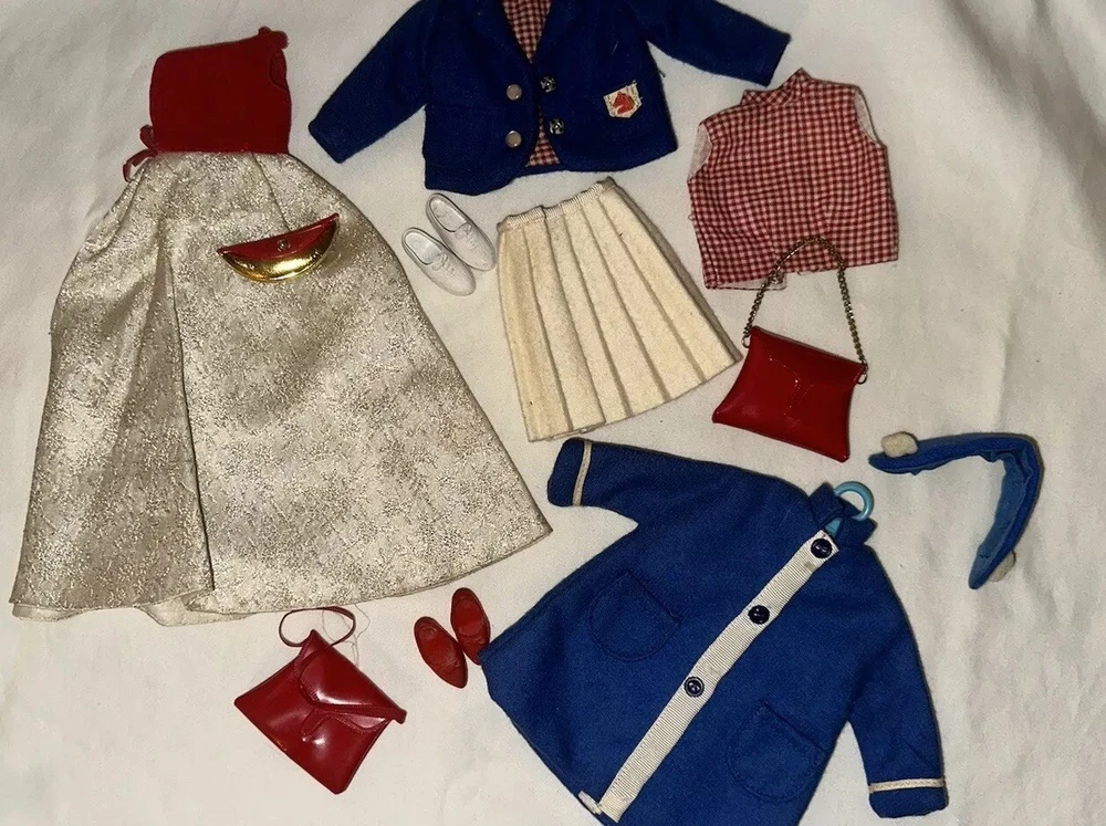 Embrace the charm of yesteryear with this exquisite collection of vintage Tammy doll clothes and accessories. A perfect find for collectors and enthusiasts, this lot includes 10 pieces that exude the quintessential spirit of the 1960s. From a chic coat jacket to a flattering dress, each item is crafted with care in multicolored cloth, reflecting the era's fashion trends. Made by Ideal in 1967 and manufactured in Japan, these original items are a testament to the quality and style of the time. Designed for both Barbie and Tammy girl dolls, the set comprises a skirt, purse, shoes, headpiece, and two outfits, suitable for special occasions and party events. Each piece in this unit, sold as a lot, is a delightful nod to the past, ready to enhance your collection or bring joy to a new home. All in good used condition, Comes from a smoke free home
