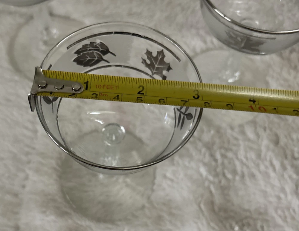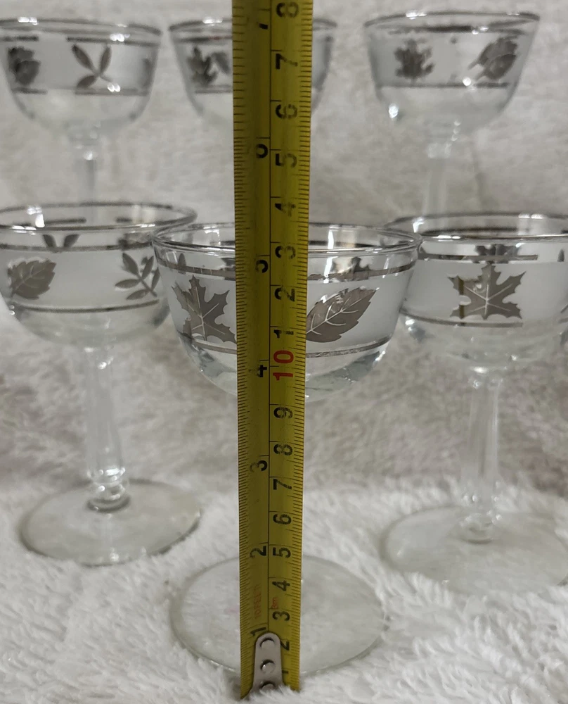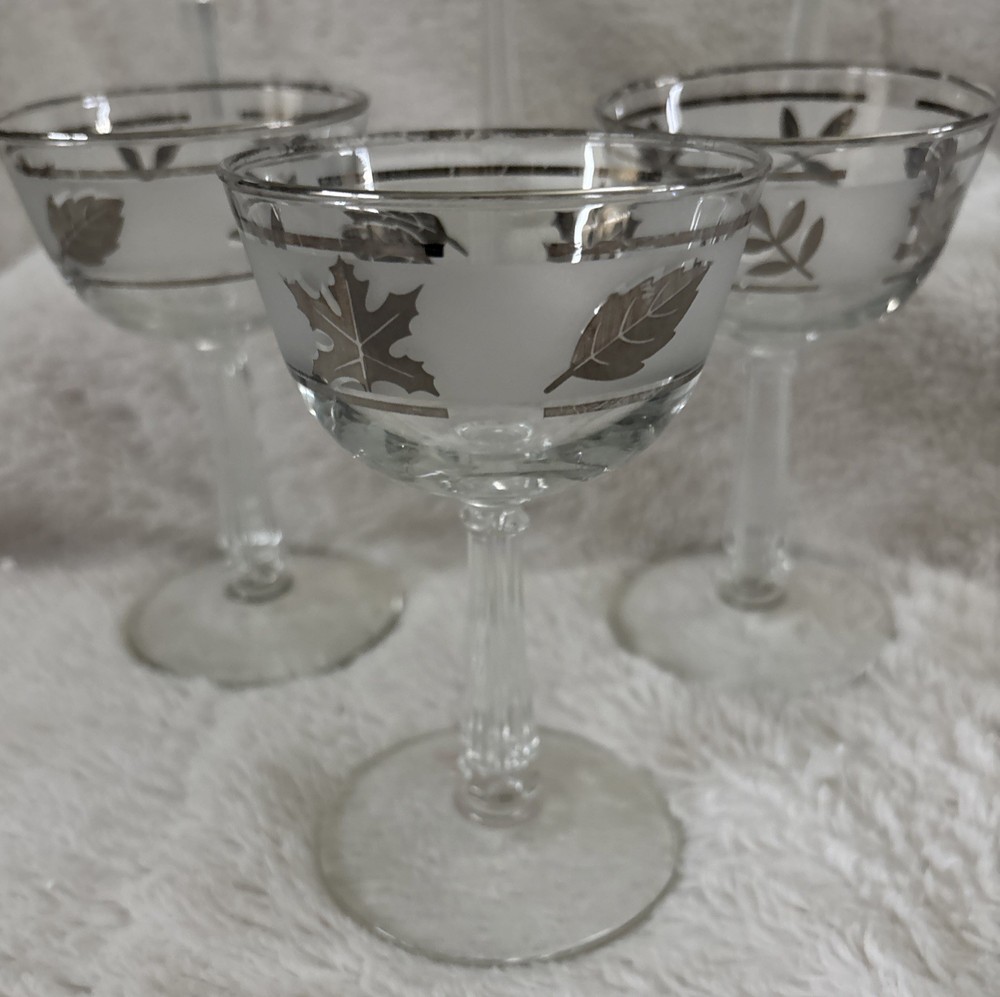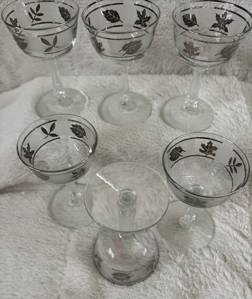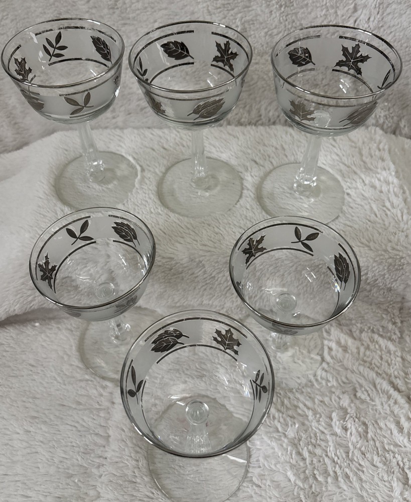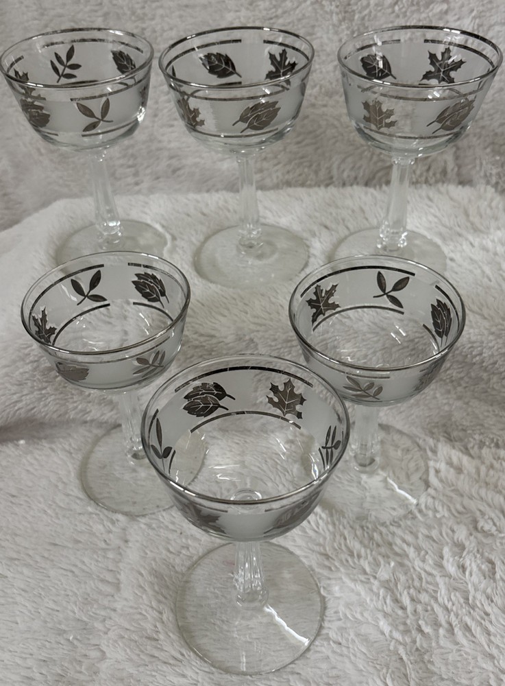 Add a touch of vintage charm to your drinkware collection with this set of six Libbey Coupe Silver Leaf frosted champagne-cordial glasses. The glasses feature a glossy and matte finish with a silver leaf pattern that gives them a mid-century modern style. These elegant glasses are perfect for all occasions, whether you're serving champagne or cordials to your guests. Can also be used for desserts