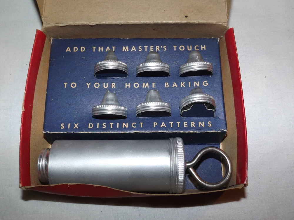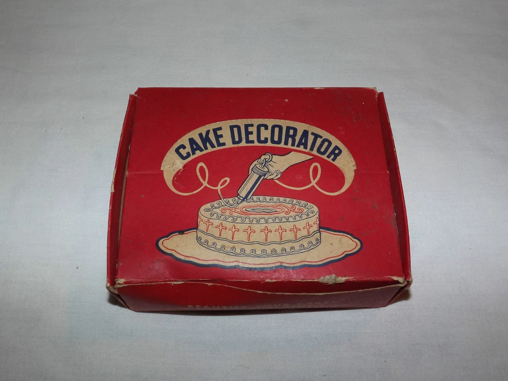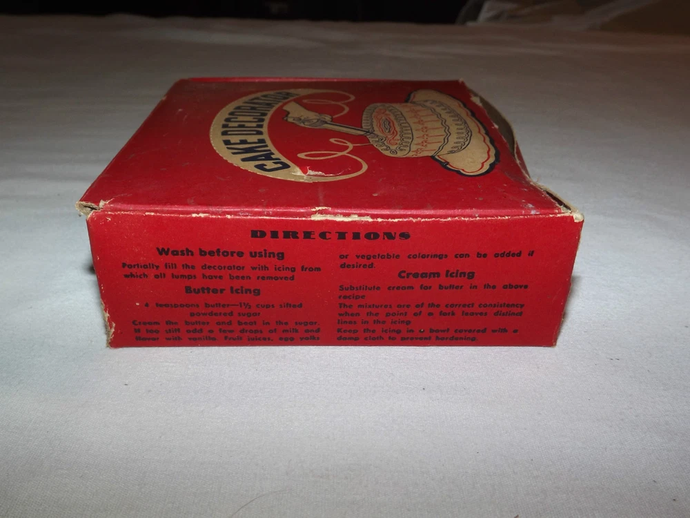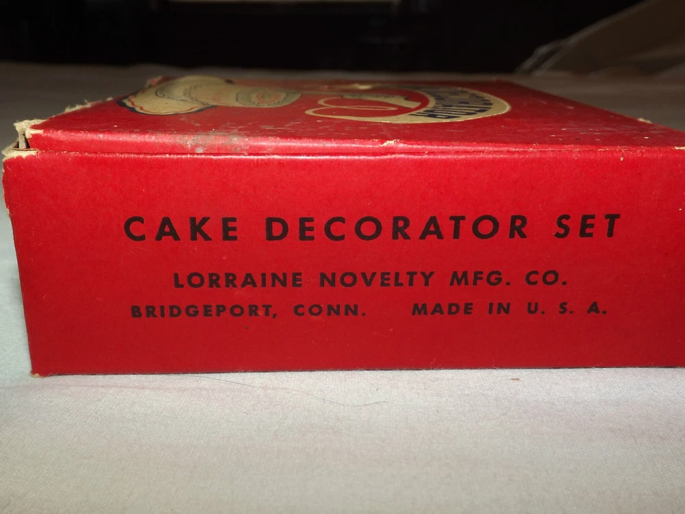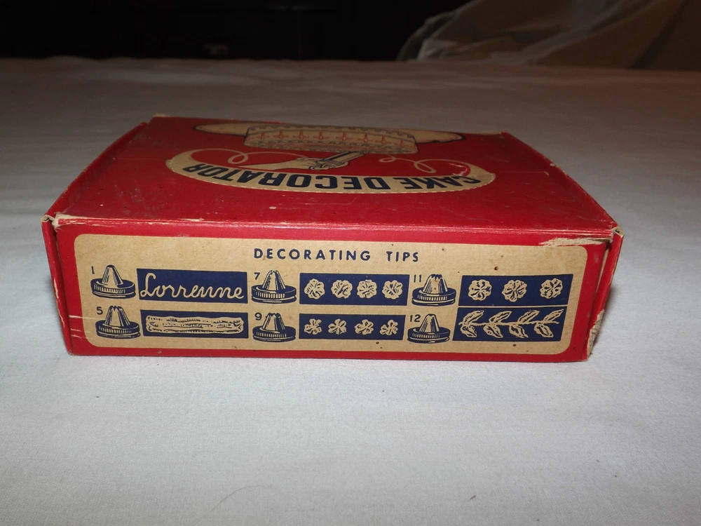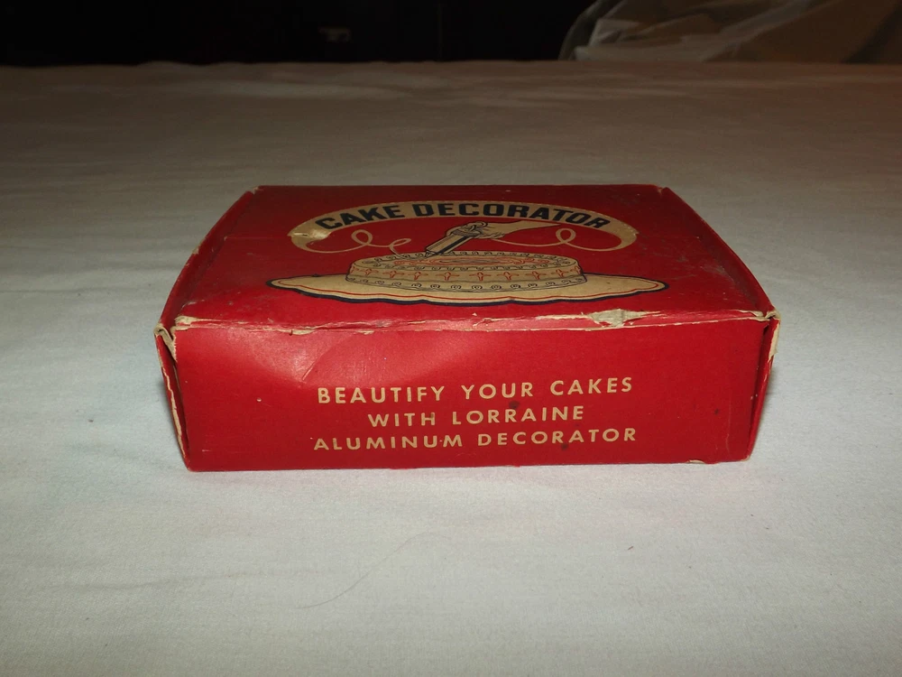 YOU ARE BIDDING ON........ VINTAGE 1960S LORRAINE ALUMINUM CAKE DECORATOR IN BOX with CHRISTMAS RECIPES......... .....SHOWS MINOR USAGE WEAR..BOX SHOWS A LOT OF HANDLING WEAR..HAS TEARS/AGE DISCOLORATION...PLEASE VIEW PHOTOS FOR CONDITION.***PLEASE E-MAIL IF YOU HAVE A QUESTION OR WANT AN ADDITIONAL PICTURE....PLEASE VISIT MY EBAY STORE FOR ADDITIONAL VINTAGE ITEMS..THANK YOU***416912