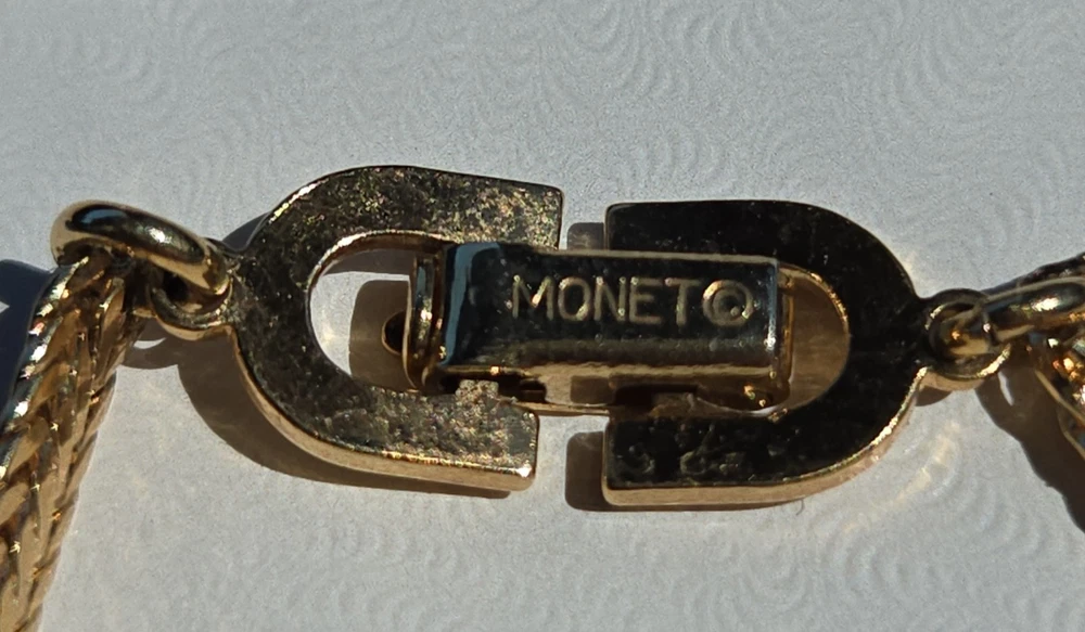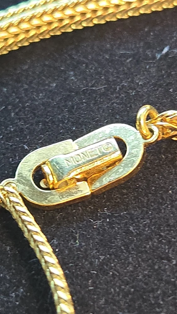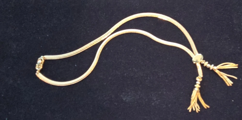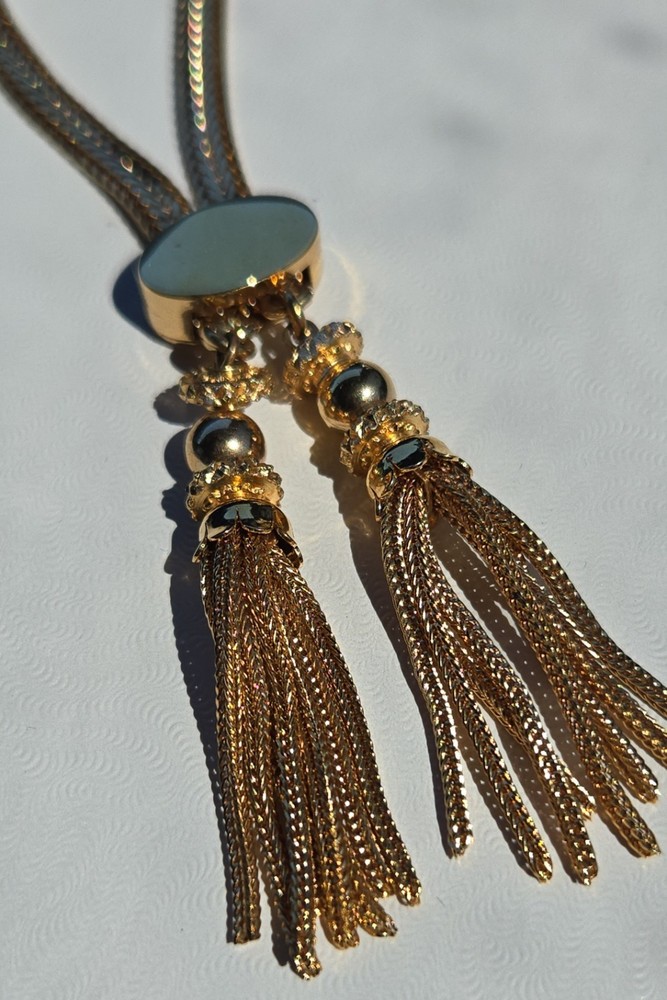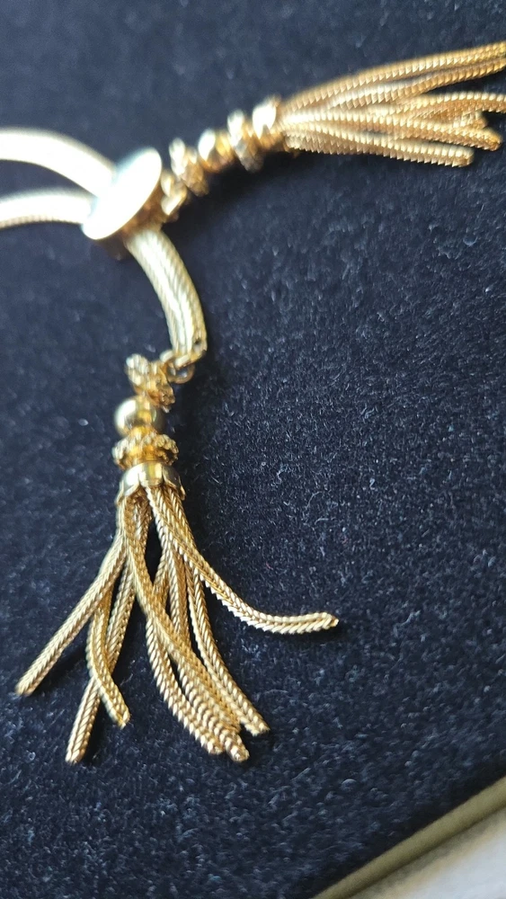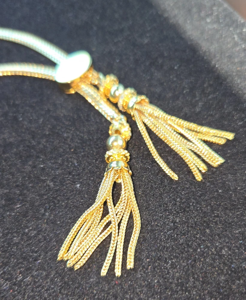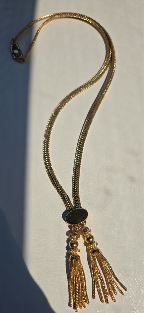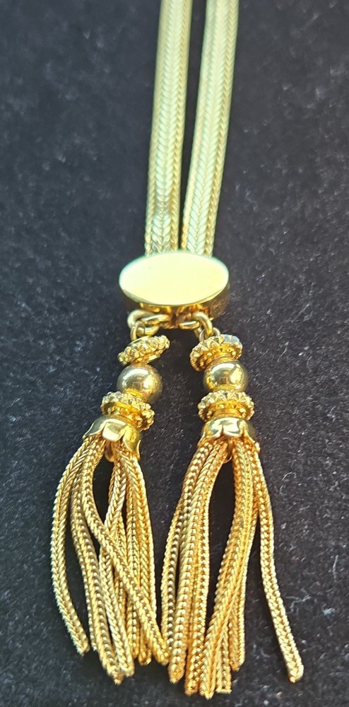 This is the iconic Monet “Pamela” slide tassel bolo necklace from the 1960s, crafted in rich gold plating with the quality and elegance Monet is known for. - Double chain design with adjustable slide/bolo clasp - Two ornate tassel drops with textured beads and caps - Signed “MONET” on the clasp (see photos) - Adjustable length — wear as a choker or matinee style - Excellent vintage condition: clasp works smoothly, gold finish bright, no missing strands Approximate measurements: - Total length: 24" (adjustable) - Tassel drop: 3" each A beautiful and collectible Monet piece for your vintage jewelry wardrobe or collection.