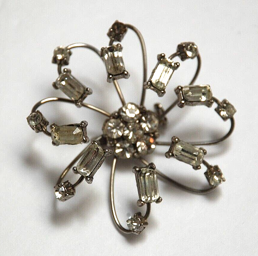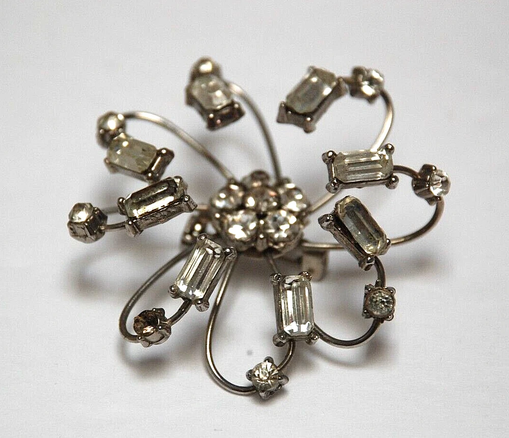 1960's Costume Jewelry Octopus Arm Rhinestone Brooch Pin Missing Stone Repair. It measures 2 1/4" in diameter round. I don't see it signed anywhere. There is one small rhinestone missing. You don't actually notice that it's missing until you look close up. Three or four of the arms that flare out are a little loose. They don't come out or anything. I'm not sure if there is a way to tighten them. Overall, They can be adjusted when the brooch is put on. It's in nice pre owned condition. It's been packed away in storage for over forty years.