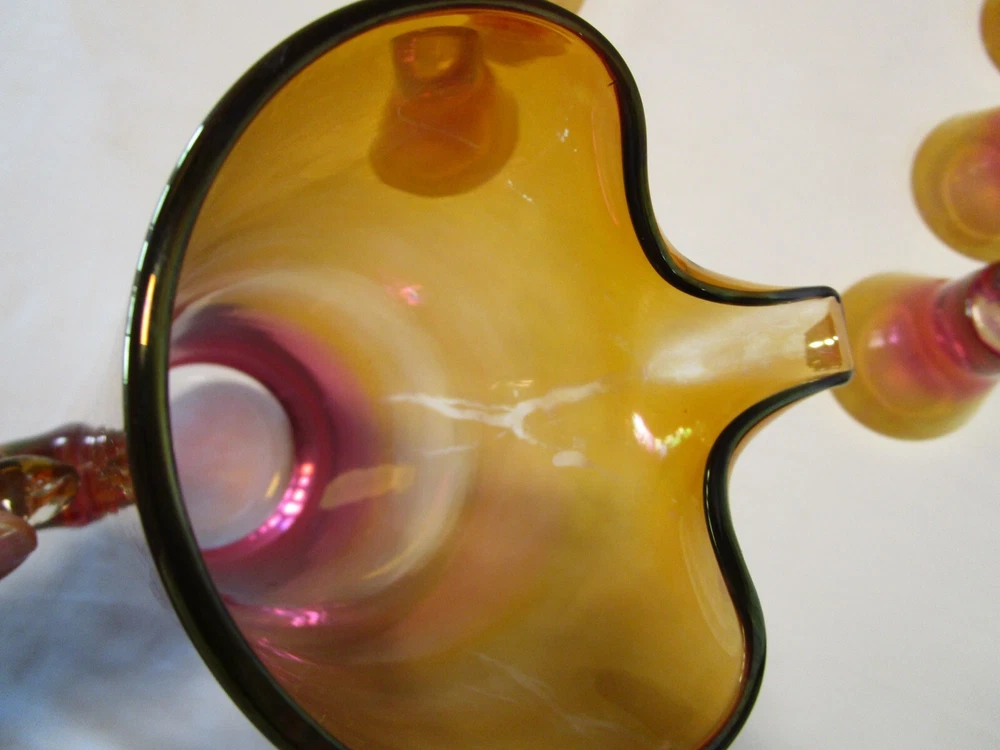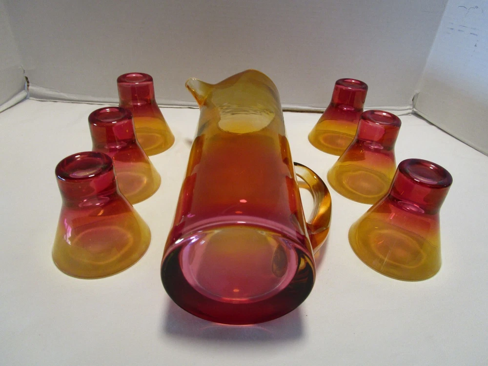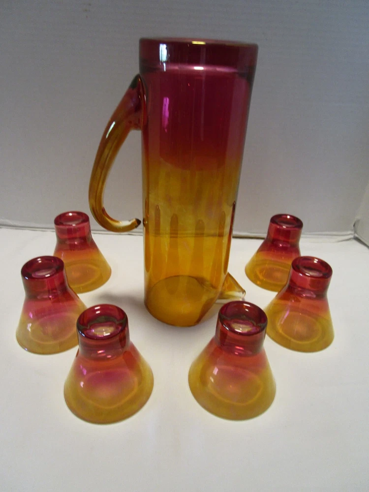 DESCRIPTION- 9/16/12/13/ book # 584 Vintage Mid Century Modern Barware 7 Piece martini cocktail pitcher set Ombre amberina orange /red/ yellow tones. The set is rarely found complete like this and still in good condition. Probably made in USA. The pitcher has a pitched lip, curved open handle, straight sides. - it does have some color drippings by the spout -see last pictures. It is 11” tall x 7” across the handle and spout, it is 3.75” across the body It is designed to hold up to 48 Oz. It comes with 6 matching glasses with weighted base flared sides martini cocktails glasses. Each glass is 3.25” tall x 3.25” across the rim 2.5” the footed base, each holds 5 Oz. brim full Great vintage used condition- no chips or cracks- ready to be display or use. Please zoom and view on all pictures for more details as they are part of the description. I DO MY BEST TO DESCRIBE EVERY LISTING BUT I AM NOT AN EXPERT AND ITEMS ARE SOLD “AS IS”. My idea of great/good may be different than yours, so EXAMINE PHOTOS CAREFULLY since they are binding and a supplement to the word description in case I should miss something. If I fail to mention something, it does not qualify as “item not as described” if it shows in my pictures. EACH PHOTO IS WORTH A THOUSAND WORDS AND THEY ARE OF THE EXACT ITEM YOU WILL RECEIVE. RETURN POLICY: Returns are acceptable ONLY if the item doesn’t match the description, is defective, or grossly misrepresented. THIS MEANS I DO NOT ACCEPT RETURNS for FIT, SIZING, COLOR ISSUES, OR BUYER'S REMORSE. Please zoom and view ALL pictures for more details as they are part of the description. Email me with any questions you may have. Please note: Buyer pays ALL return shipping and fees. If you use an eBay shipping label, it will be deducted from your refund amount. FEEDBACK I do not leave feedback until the end of a transaction. Transaction is considered over once I receive feedback from you confirming that you have received it and expressed satisfaction with it. If you are unsatisfied with your purchase, please contact me before leaving a neutral or negative feedback- so I can fix the issues.