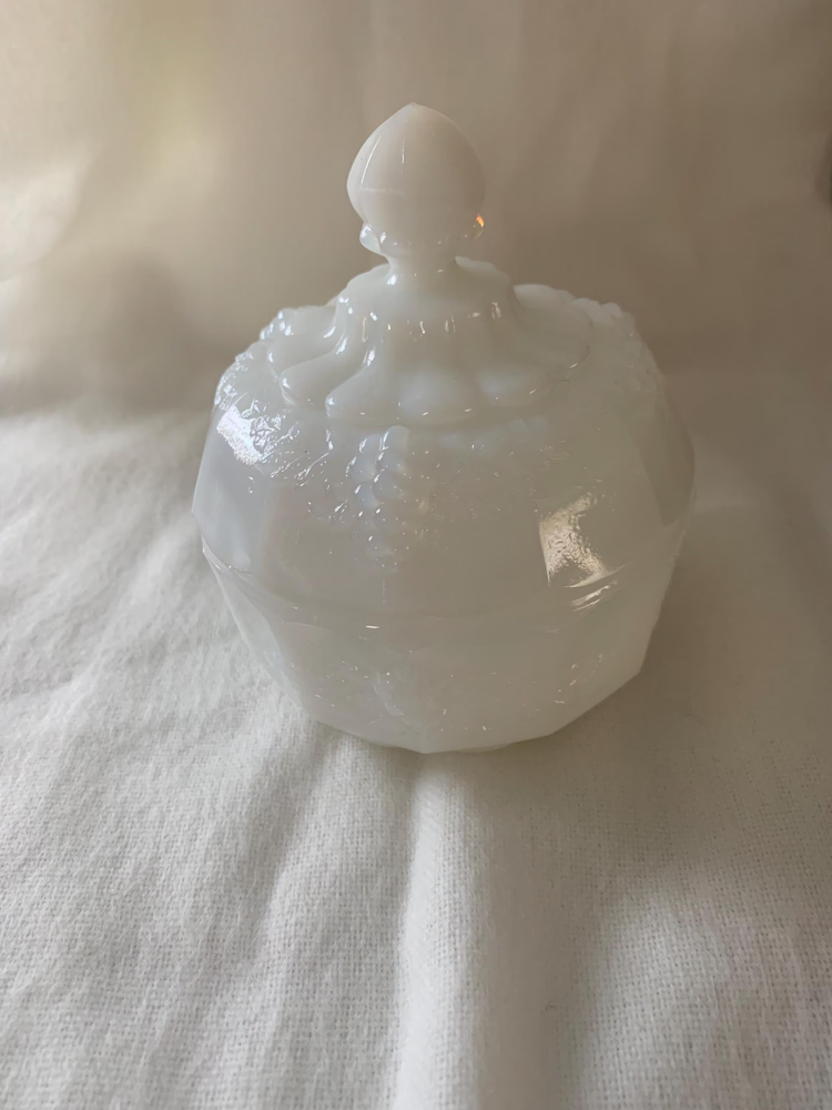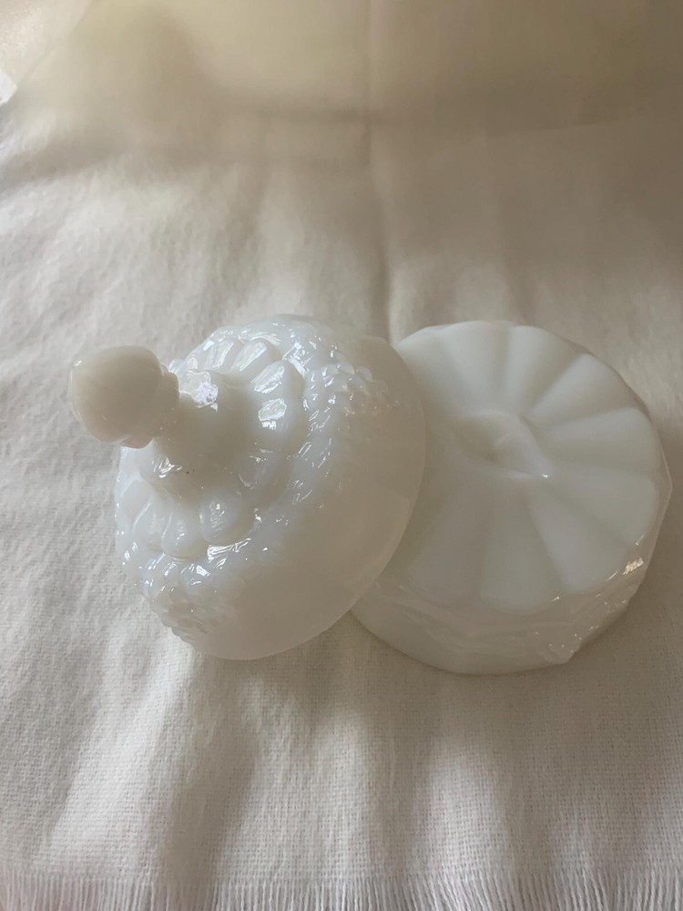 Elevate your serving collection with the Westmoreland Milk Glass Nut Candy Dish, featuring the classic and charming Grape Panel pattern. This vintage piece from the 1960s, crafted from white milk glass, brings a touch of time-honored elegance to any table setting. The dish, designed with a single compartment, is perfect for presenting nuts or candies to guests while adding a delightful decorative element to your home.The dish is an authentic original, part of the renowned Paneled Grape product line, and comes unboxed. It’s a standalone item, not handmade or part of a set, and has been manufactured with a production style that typifies the milk glass era. Whether for use or display, this model seamlessly blends functionality with the refined aesthetic of its time.