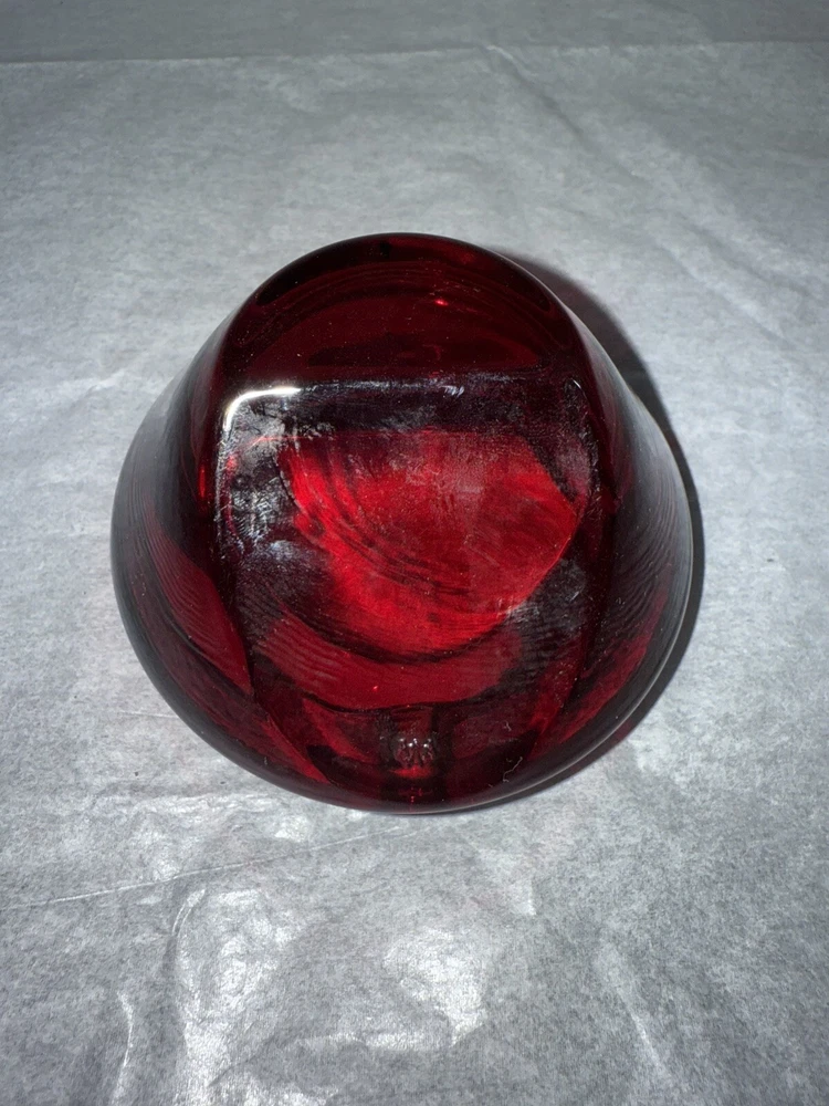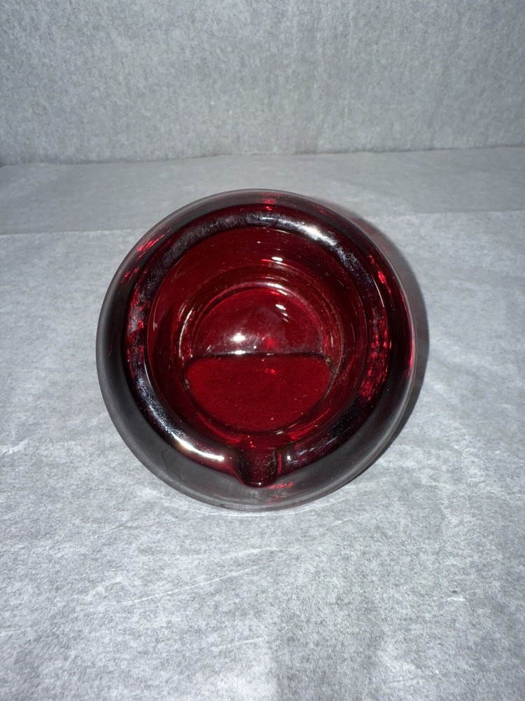 This is a vintage Westmoreland glass ashtray from the 1960s, made of ruby red glass in an Art Deco style. The ashtray is in the shape of a cylinder and features lampwork production technique. It is suitable for holding cigarettes and was manufactured in the United States.