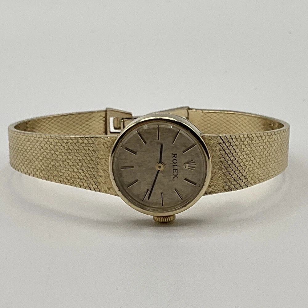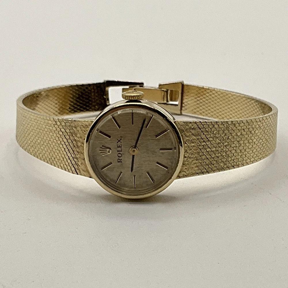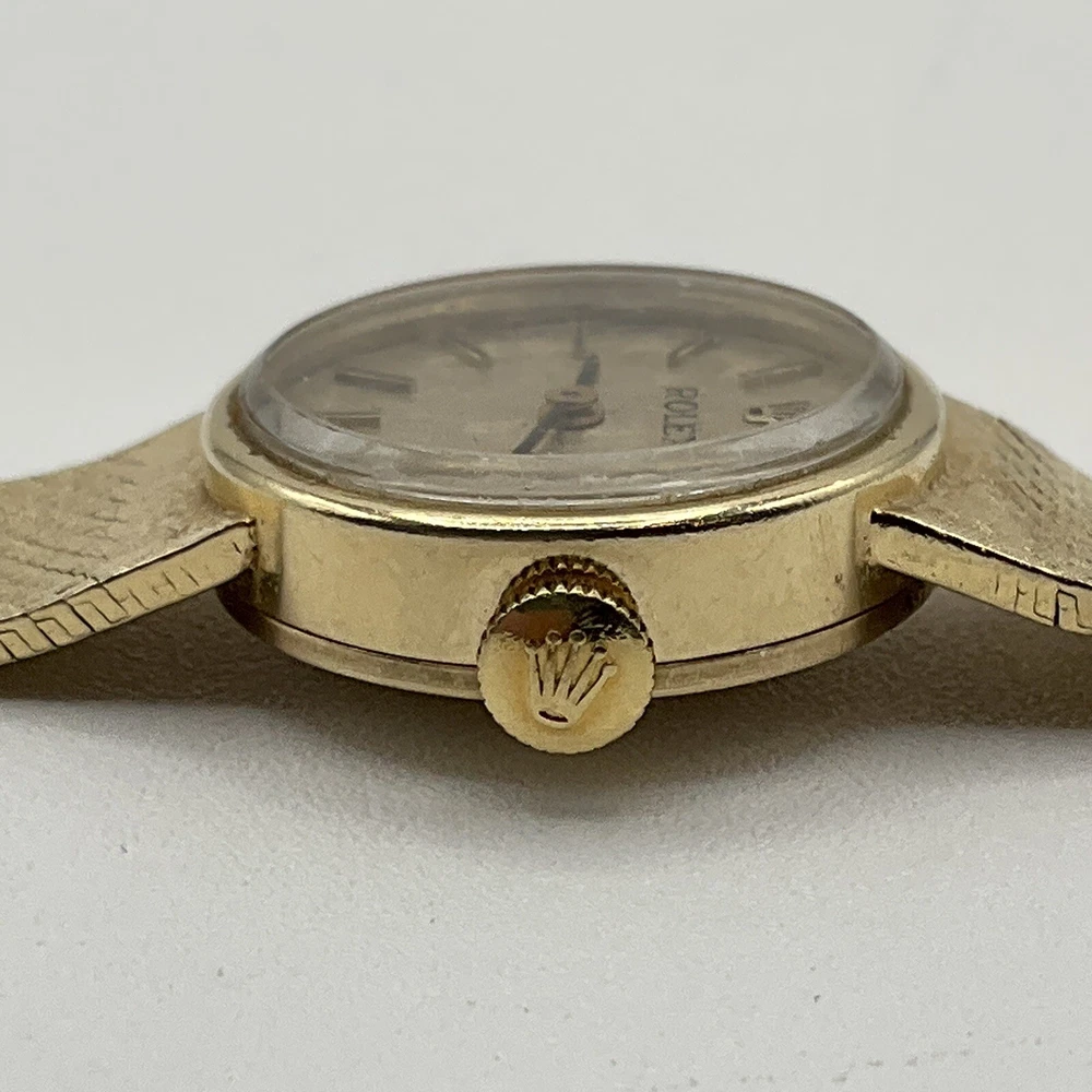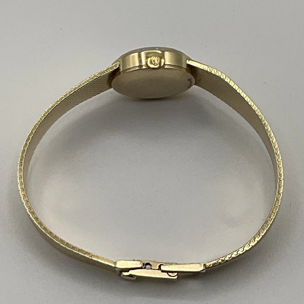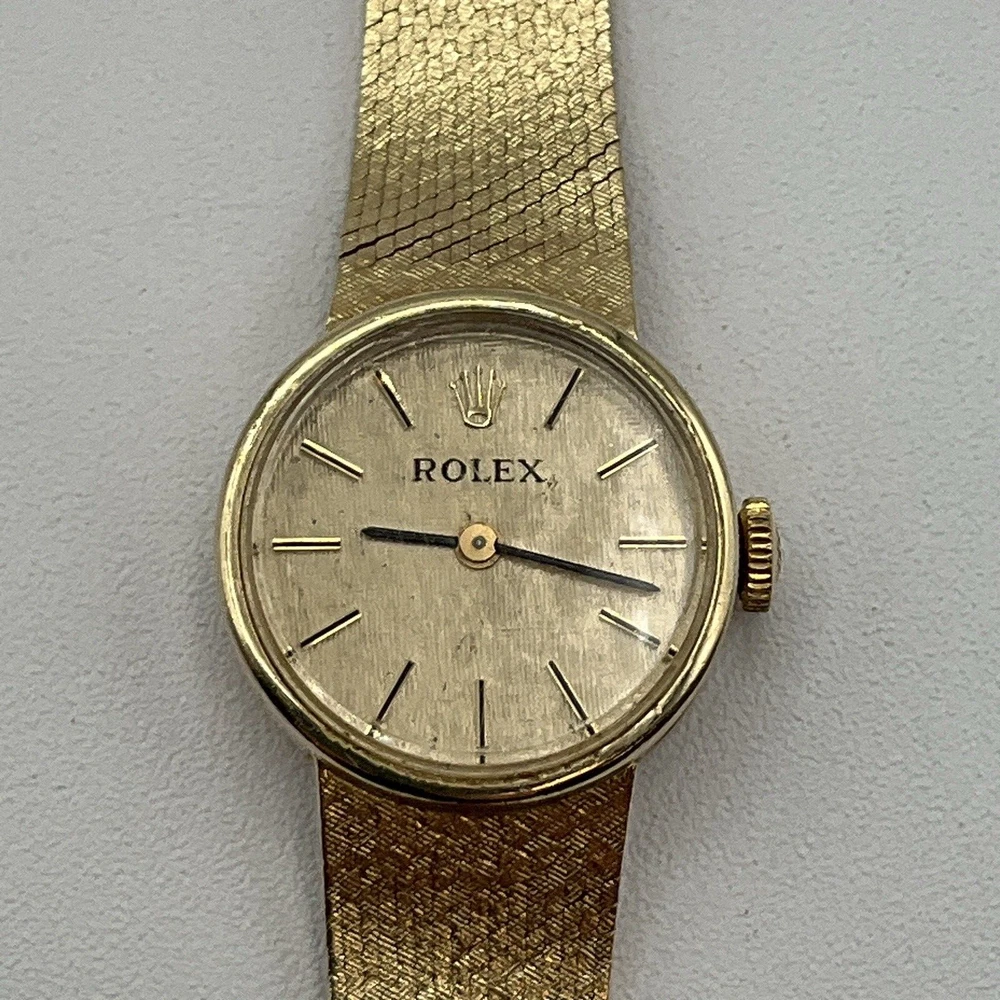 Previously owned beautiful women's 1960's Rolex cocktail watch. Its 14k gold and weighs 29.6g. On the inside of the case back its marked with the reference number 8378. We believe it was last serviced June 1989 by the black mark of 6-89P. It has a 1400 movement and 18 unadjusted jewels. The watch has a mechanical manual wind and seems to loose 10 minutes within a 24 hour period. It will need to be serviced. The case measures almost 20mm. The band does have some what of a bend to it in some spots but when worn its not as noticeable! It will fit a small wrist and has a circumference size of 6.25". A beautiful watch that will make for a great gift or treat your self! Please see all pics. About Us Customer service is our #1 priority! If for any reason you are dissatisfied with your purchase we offer a 30 day money back guarantee unless otherwise noted in the listing (AS-IS/For Parts - No returns.) We only accept items back in the condition that they were sent to you. Items that are listed AS-IS are not eligible for this money back guarantee. If you are unhappy with your purchase PLEASE contact us BEFORE leaving feedback or contacting eBay so we can work with you to resolve any problems. Shipping When we charge shipping to our customers we only pass on to our buyers exact shipping costs - no added fees. We offer combined shipping for multiple items purchased, so if you purchase more than 1 item from us, please wait for us to combine shipping costs. We require signature confirmation on all items that sell for $750.00 & more per eBay's selling policy. We also insurance all items that sell for $250.00 & more. PLEASE NOTE: WE DO NOT WORK/SHIP ON HOLIDAYS OR WEEKENDS! We use the eBay Global Shipping program for international shipping. DLLR License #991 Please note, we are not an authorized distributor or manufacture's representative of this item. *This product may contain a chemical known to the state of California to cause cancer and birth defects or other reproductive harm* Track Page Views With Auctiva's Counter