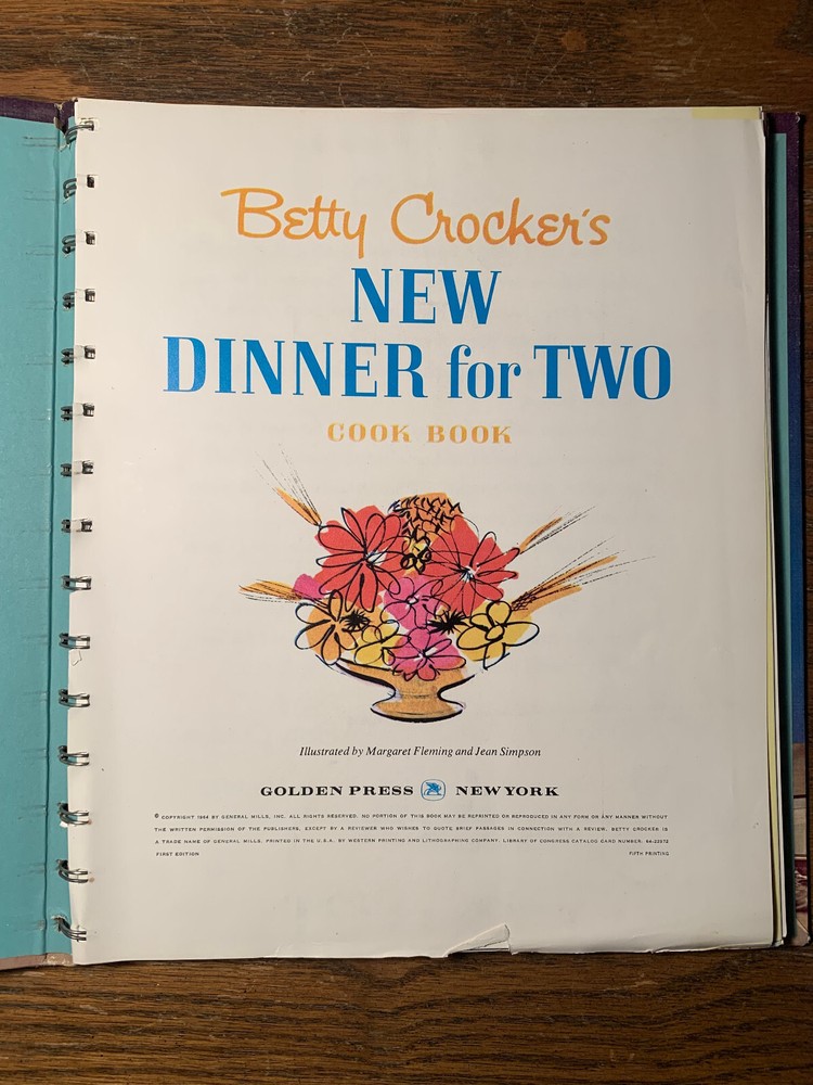 Narrative Type:NonfictionIntended Audience:Adultsgtin13:Does not applyPublisher:General Mills IncTopic:Cooking, BooksOriginal Language:EnglishISBN:Does not applyLanguage:EnglishVintage:YesEdition:First Edition, First PrintingEra:1960sType:CookbookAuthor:General Mills Inc.Genre:CookbooksSeller Notes:“see pictures for condition. first page is coming off spiral (see pictures).”Book Title:Betty Crocker's New Dinner for Two Cook BookFormat:Hardcover, Wire BoundPublication Year:1964Country/Region of Manufacture:United States