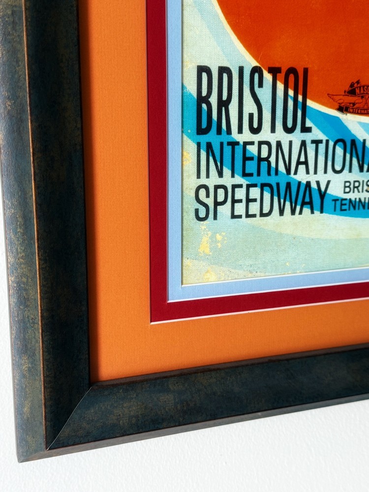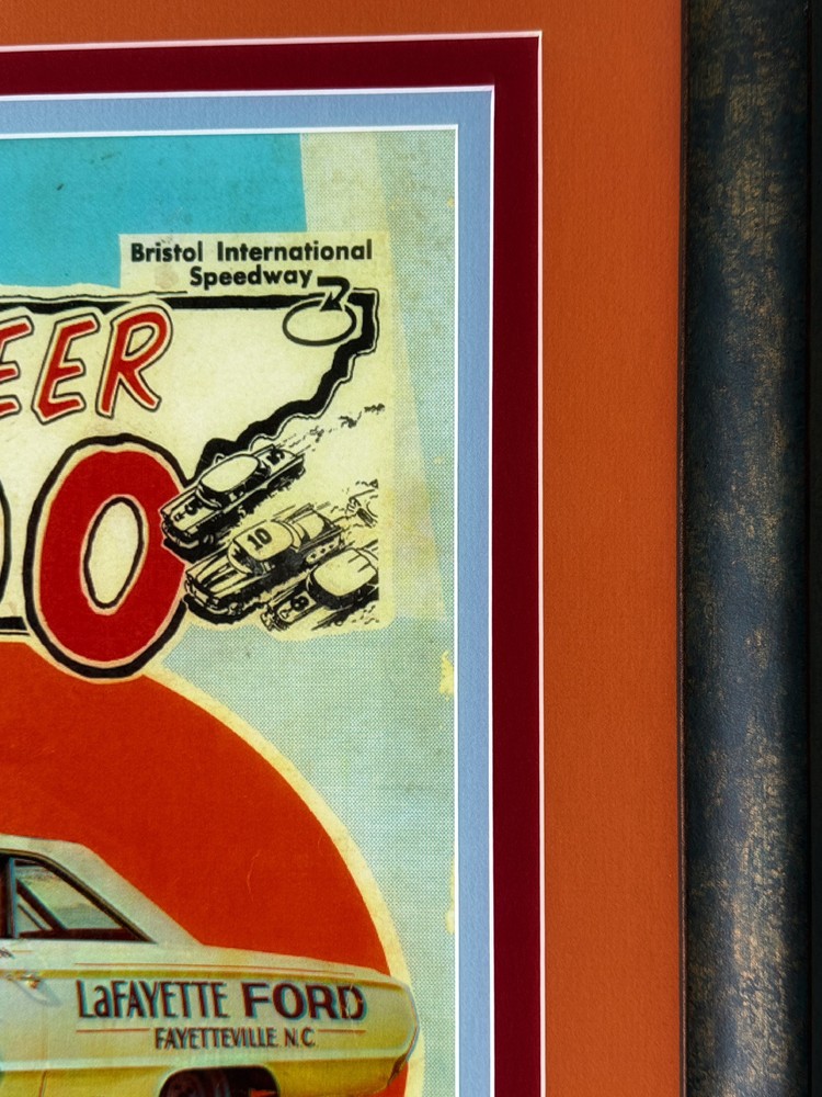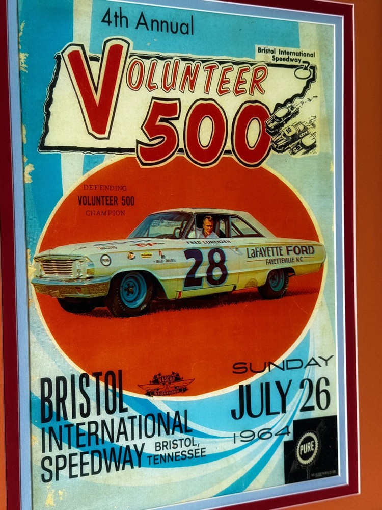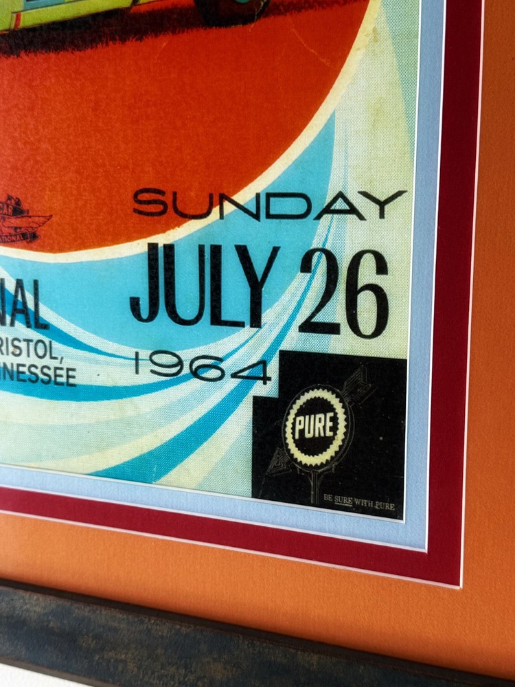 Capture a piece of NASCAR history with this authentic 1964 Volunteer 500 from Bristol International Speedway race poster. A true collector's item, this original lithograph showcases the vibrant advertising art of the era and is a must-have for any serious racing enthusiast or collector of sports memorabilia. The piece celebrates the excitement of the race and is emblematic of the rich legacy of NASCAR. This poster is not only a visually stunning piece of artwork but also a commemoration of the sport's golden days. It's an ideal addition to any collection of racing memorabilia or as a striking decorative element for your home or office. Add a touch of vintage racing flair to your space with this classic NASCAR poster. Professionally framed, triple matted and using museum graded non-glare glass. Measures 26 1/2x 21”