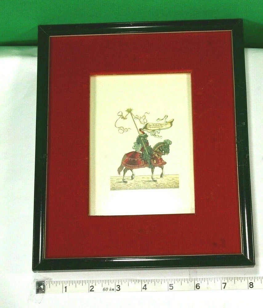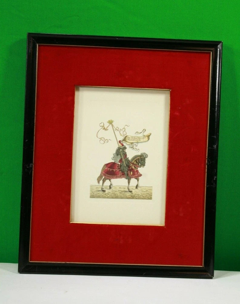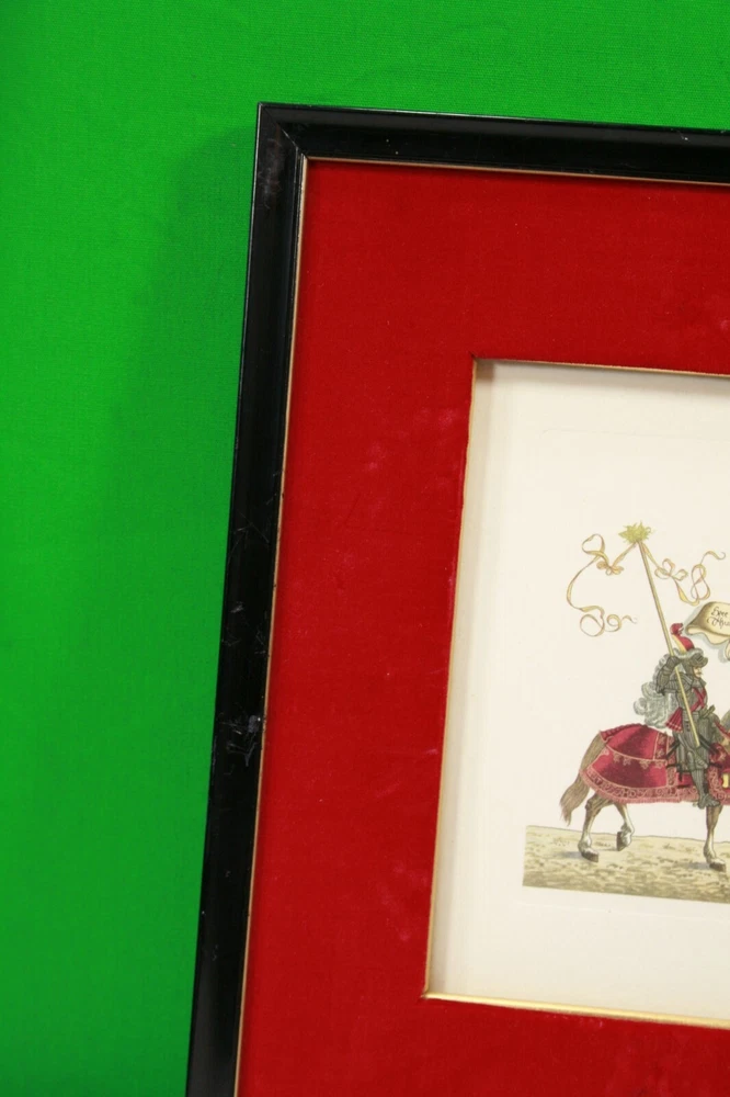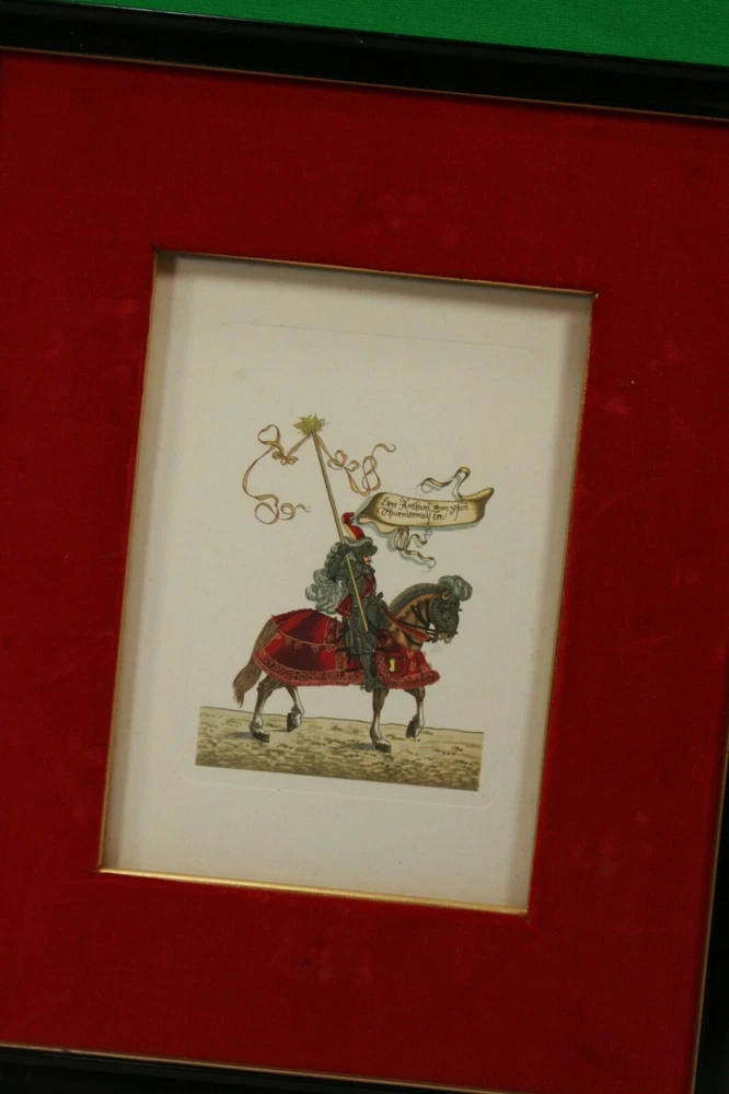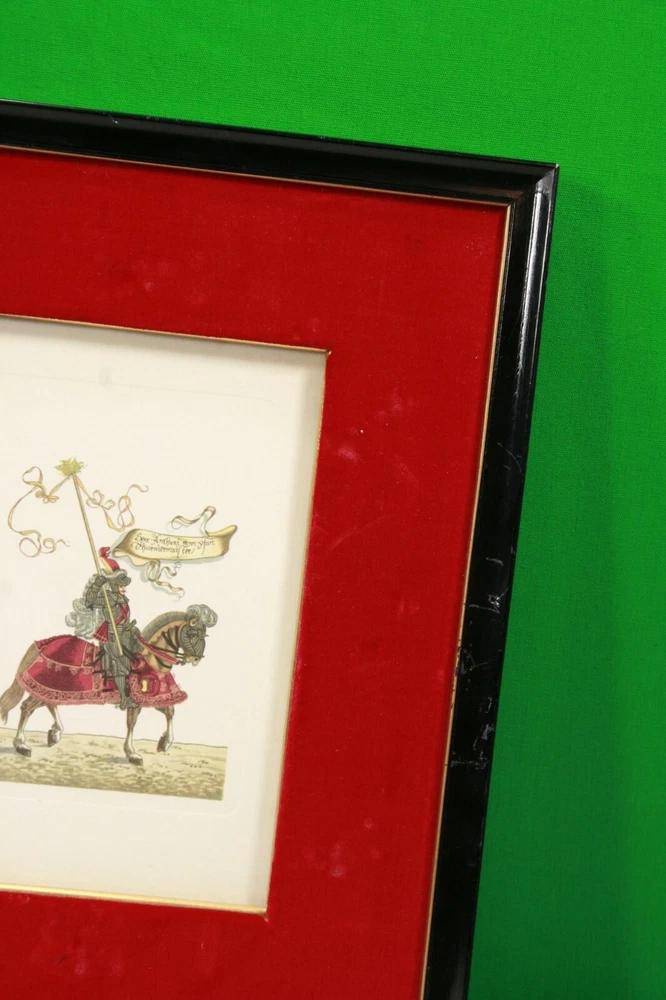 1965 German Ernst Geissendorfer Rothenburg Tauber Germany Based on Series by Hans Burgkmair 'German Knights' 1592 Signs of wear / distress on frame trims Purchased 1965 in Germany Red Velvet Matte Glass Wood Nail Frame Black Paint Card Stock hand-crafted Jousting, Medieval, Horses, Lance, Tournament, German, Knights Hans Burgkmair, Unused Greeting Cards, Handmade Frames, Art Collection