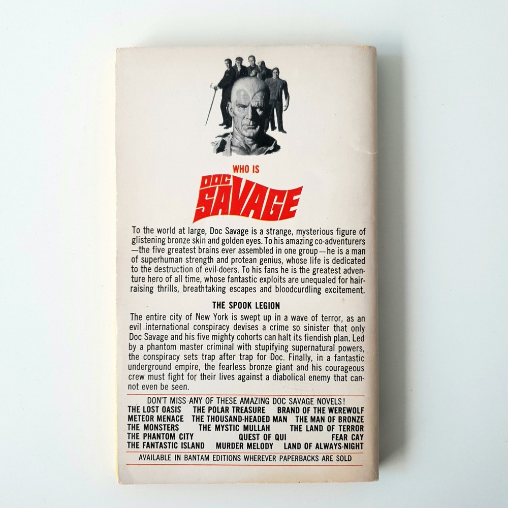 Vintage THE SPOOK LEGION by Kenneth Robeson is a 1967 1st Bantam printing of Doc Savage #16. This English-language vintage paperback book, published by Bantam Books in New York, falls under the Action and Adventure genre. It features the character family of Doc Savage and is part of the Mystery and Thriller topic.