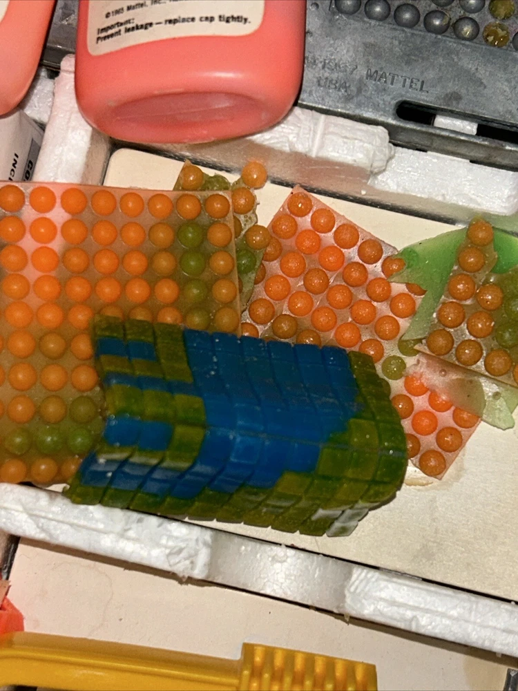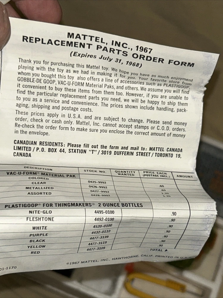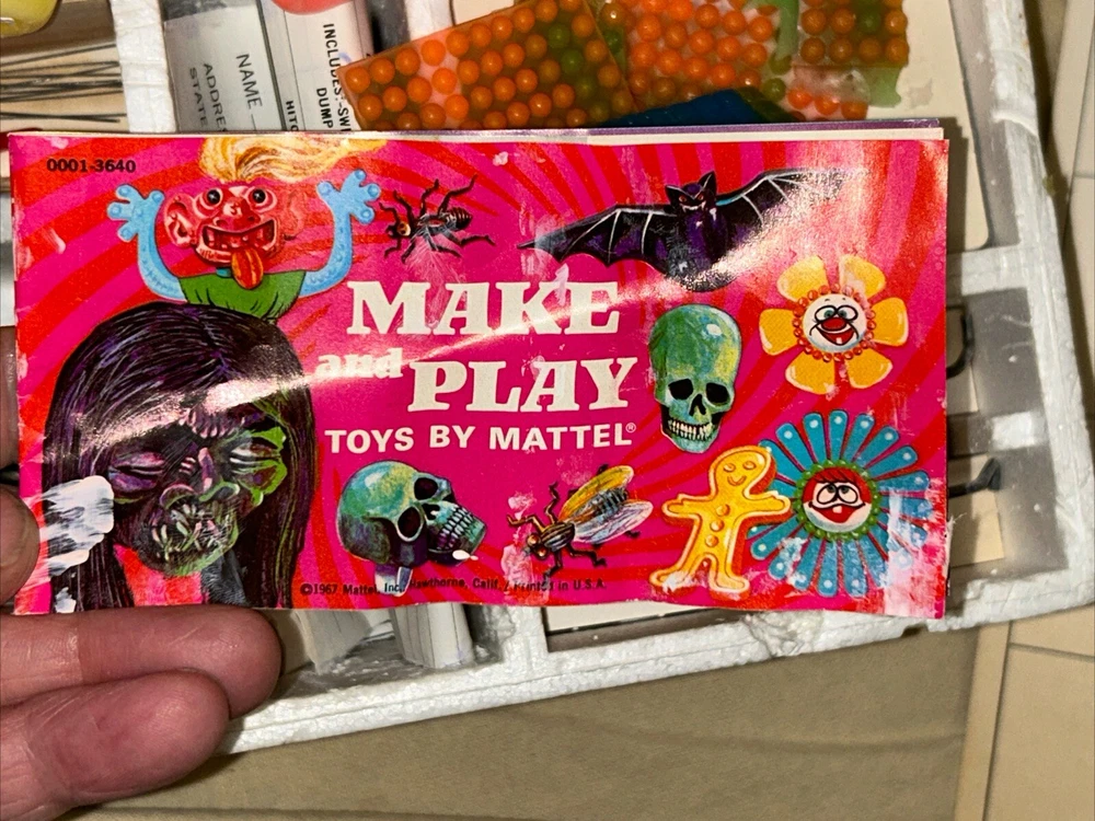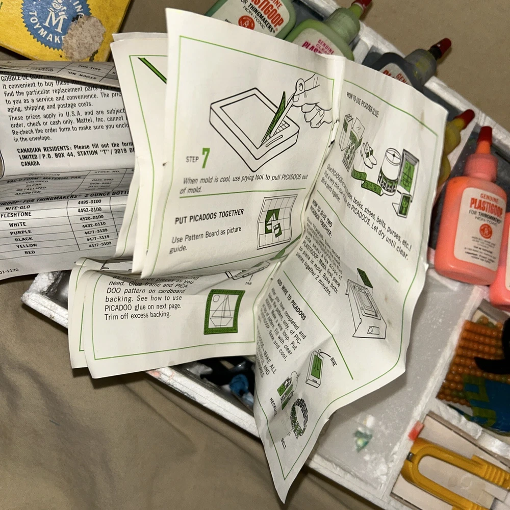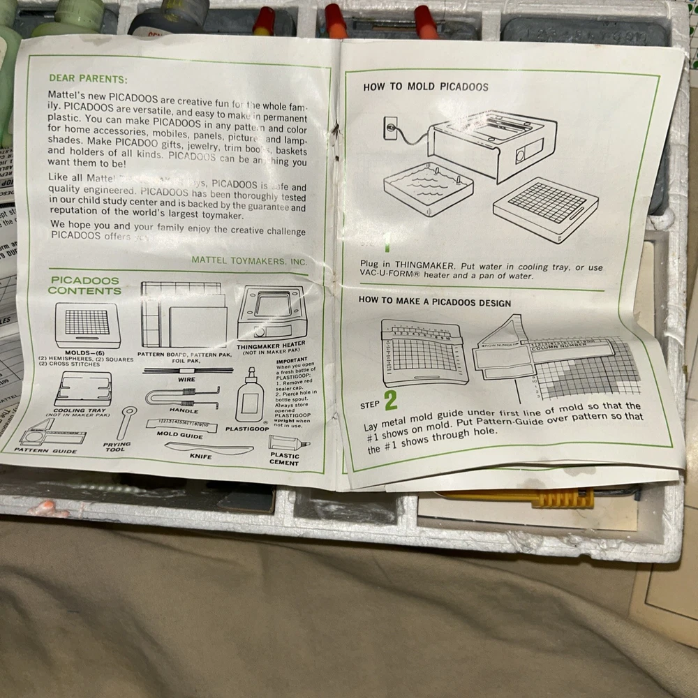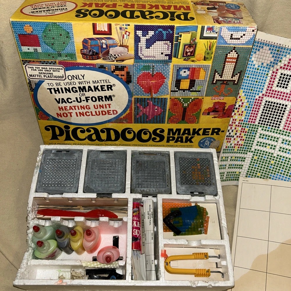 Vintage 1967 Mattel Thingmaker Picadoos Maker Kit in Box with Plastigoop & Molds. Used, includes 6 molds, a couple of tools, wire, and Plasticgoop as seen. All 6 are liquid, not sur how useable, dated 1965 and one dated 1966. Includes cool little catalog, instructions, order form, and patterns as seen. The graph board is stained but I left it in there. The Styrofoam is messy, box lid shows wear, but a nice vintage lot. Please see photos. Please check my other sales.