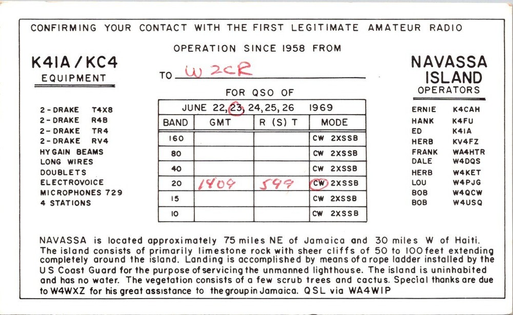 Own a piece of amateur radio history with this original 1969 QSL card from Navassa Island, one of the most elusive DX locations! Sent by K4IA/KC4 during a rare multi-operator expedition. A must-have for ham radio, DX, and Navassa memorabilia collectors.