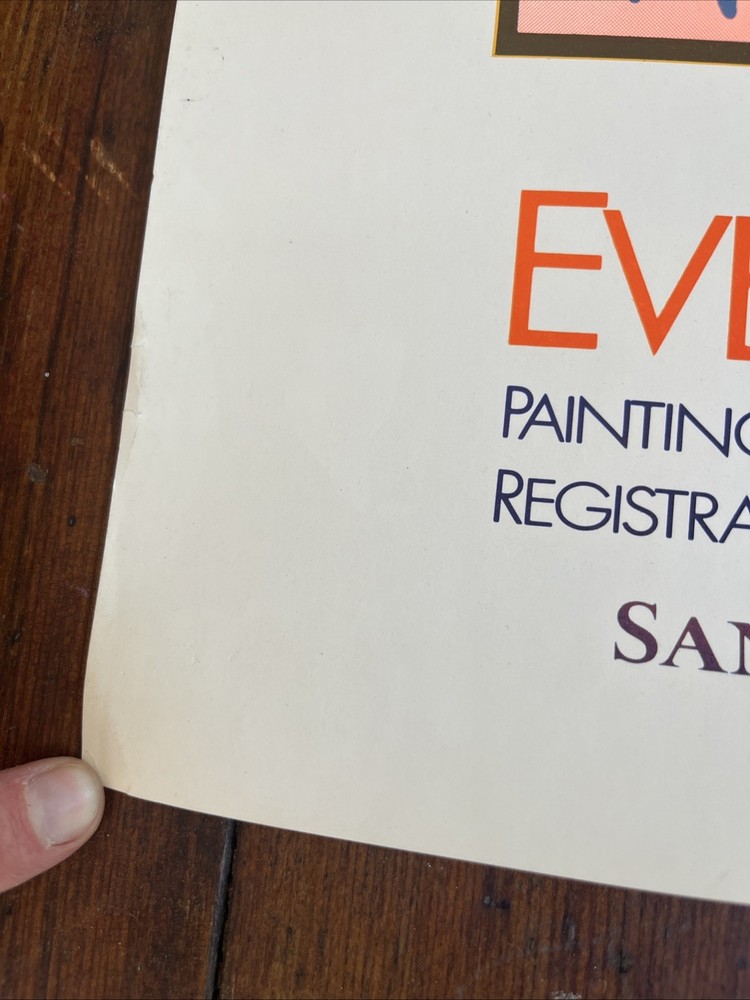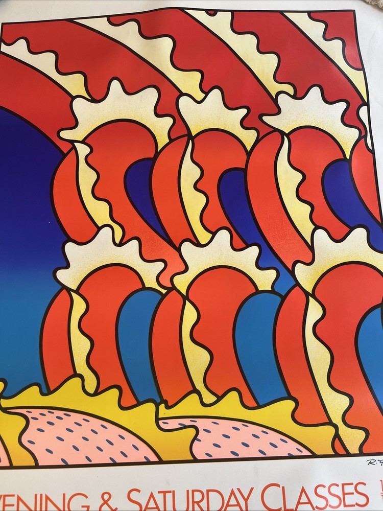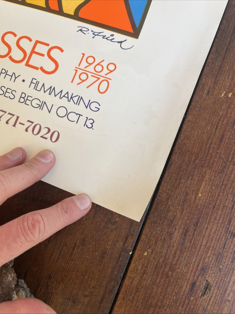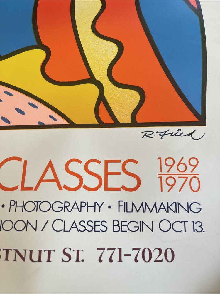 This poster measures approx. 23 in. x 29 ins. Art by Robert Fried. Light handling. No pin holes. Faint water mark at top left side see photos.. Really nice and clean looking poster. This is for Evening and Saturday classes at The San Francisco Art Institute. See photos for condition. 1969/70