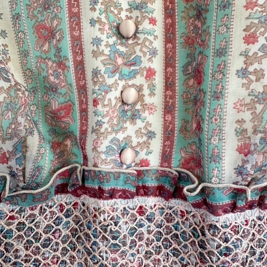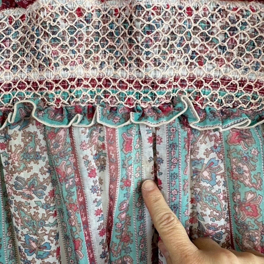 Vintage 1970 Cottagecore Victorian Maxi Dress Prairie Floral Smocked High Neck. Sheer sleeves with smocked detail on the cuffs. Dress is fully lined, except for the sleeves. Metal zipper on the back. Size: NO SIZE TAG. PLEASE SEE MEASUREMENTS TO ENSURE PROPER FIT Approx. measurements: 17" across (pit to pit), 14 waist, 52" long (shoulder to hem) Condition: Pre-owned good. Pre-loved and in gently used condition. Light wear. A few faint stains on the front, just under the chest. Please see all pics for any wear/condition. cottage, cottagecore, prairie, prairiecore, little house on the prairie, florence welch dress, Victoriana, regency, victorian, romantic