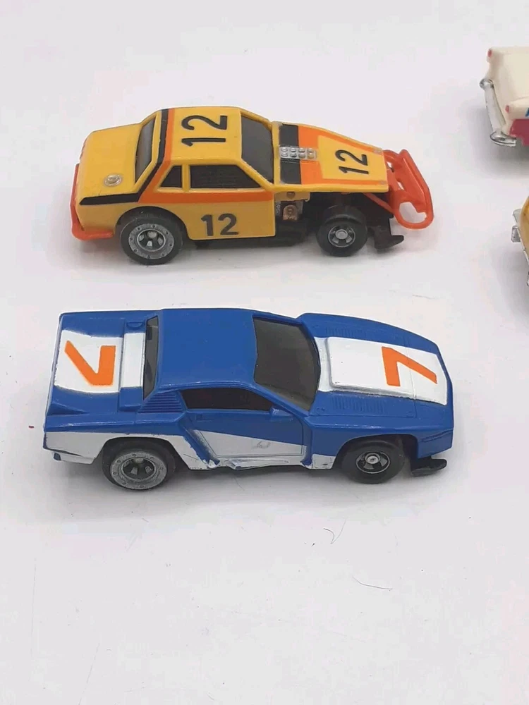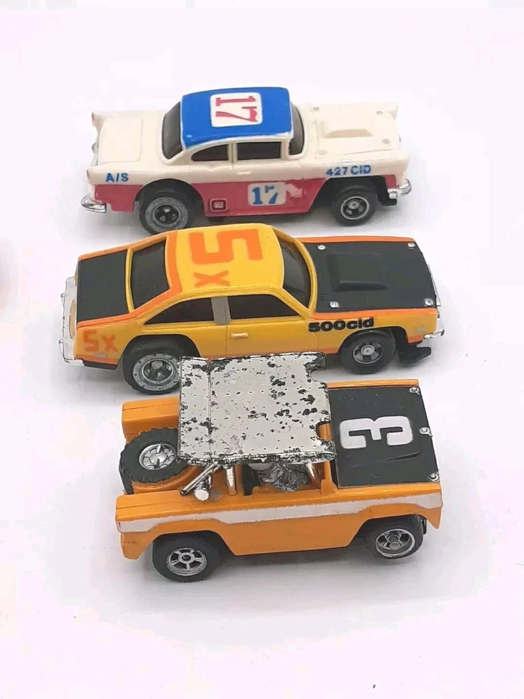 The engines work on all five slots and all with good power. All 5 were 9-Volt tested but not track tested. Whether or not , just assume all five need Rubber and will need to be oiled. No noted damage to any. The ideal race car #12 is missing both exhaust pipes and the Aurora AFX Bronco has paint flaking from the roof. Please view the photos for the best condition description. I do combine shipping and thanks for visiting my store, I certainly appreciate ya!! 👽🦩🛸