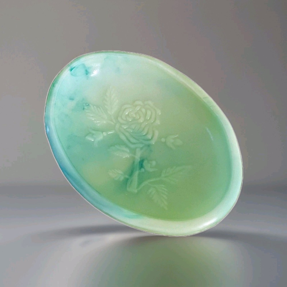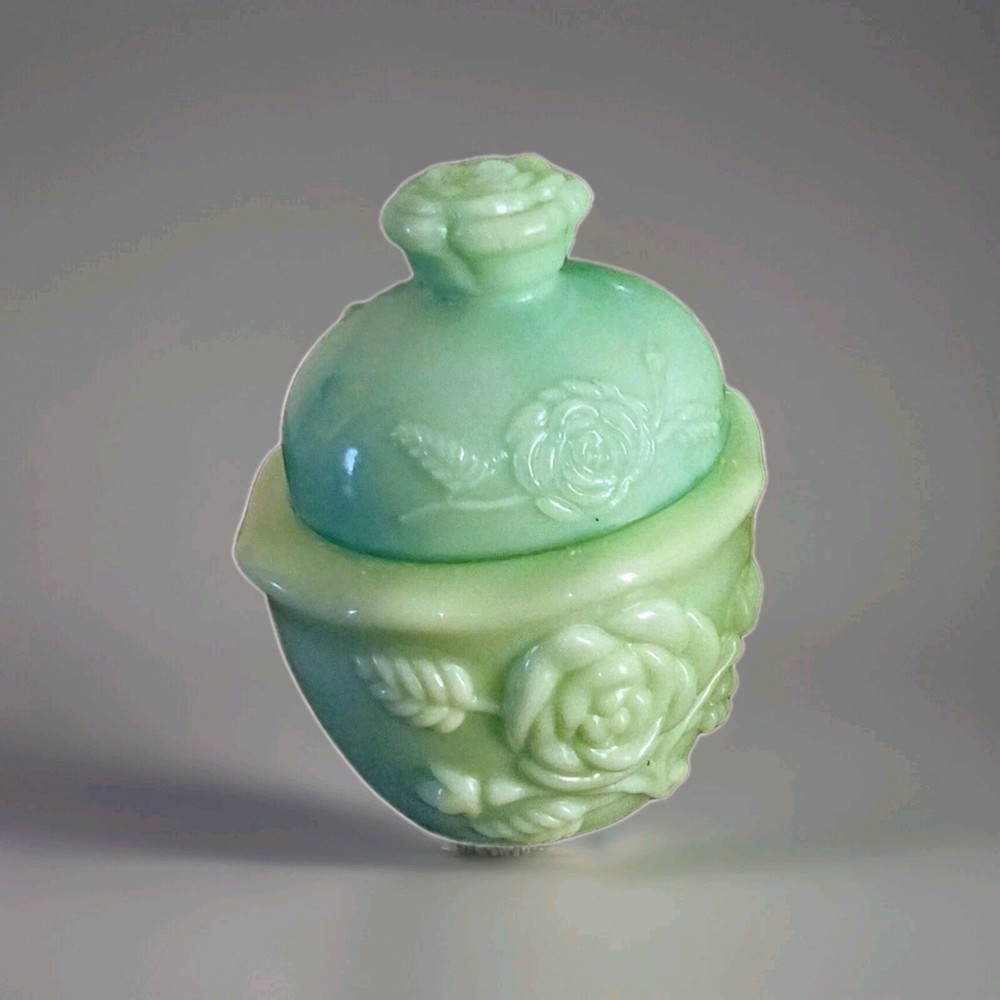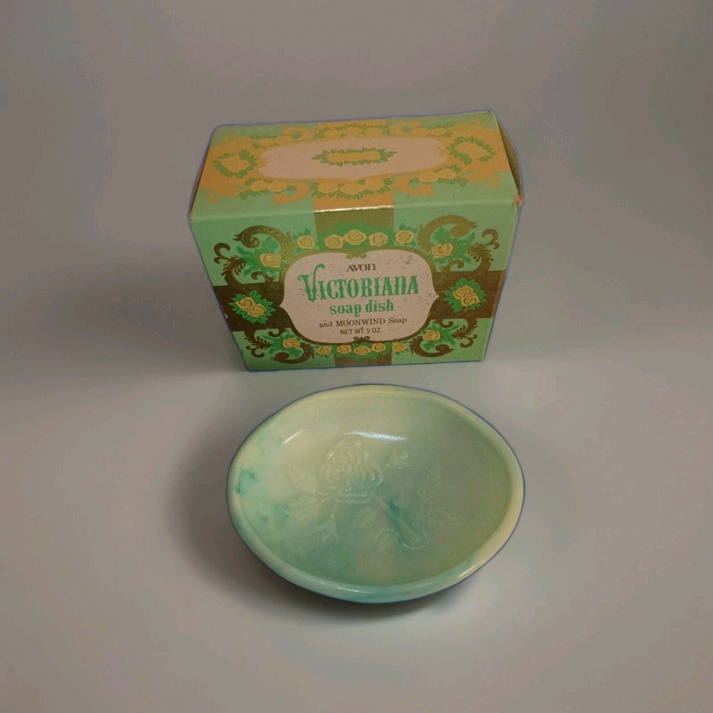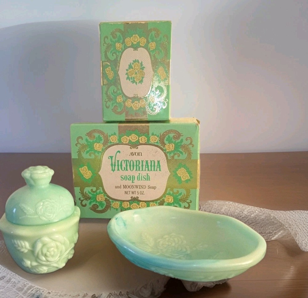 The Vintage 1970s Avon Victoriana Jade Marble Moonwind Soap Dish & Powder Sachet is a collectible set featuring a beautiful green glass design with a rose pattern. Made in the United States, this original piece exudes a classic Victorian style, perfect for adding a touch of elegance to any decor. The set includes two units, a soap dish, and a powder sachet, making it a unique and charming addition to any collection of decorative collectibles from the 1970s.