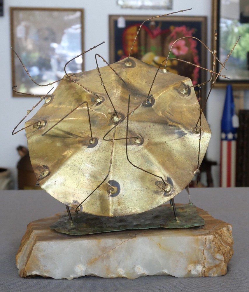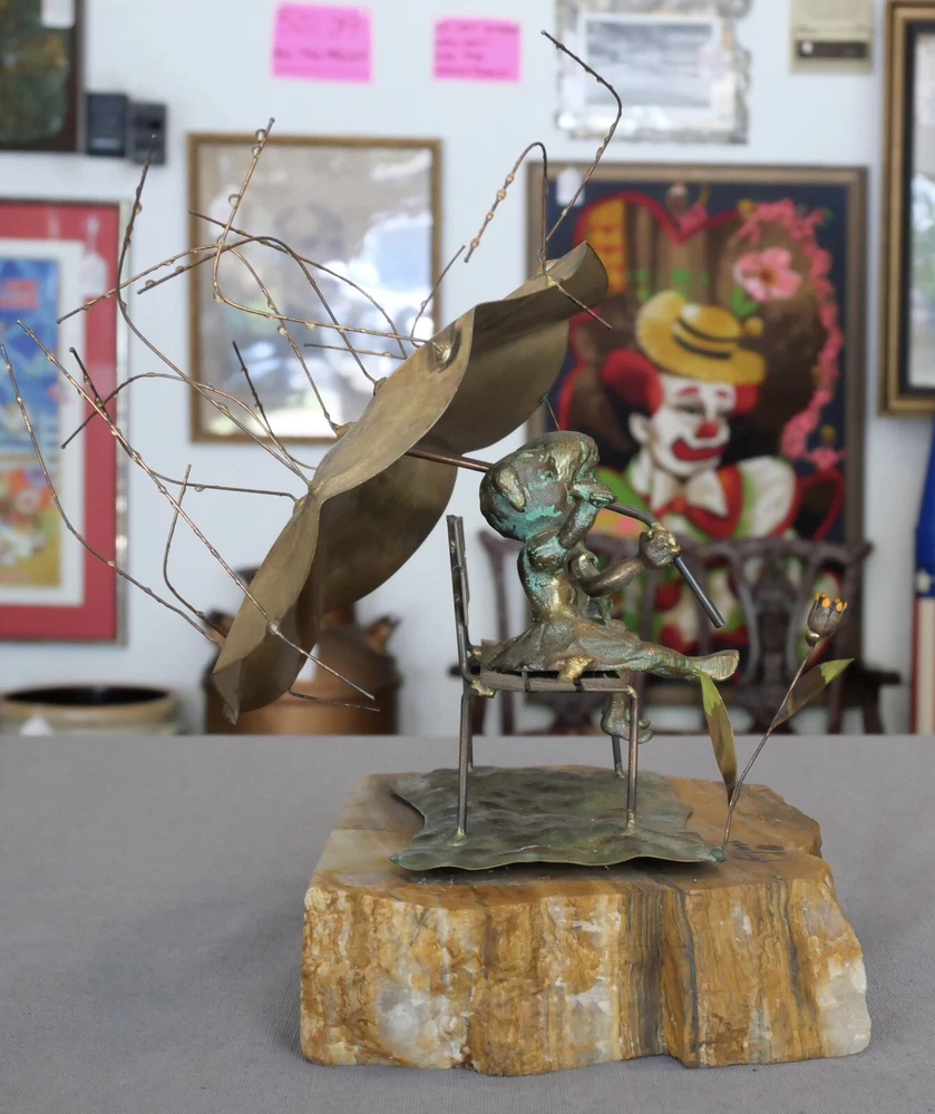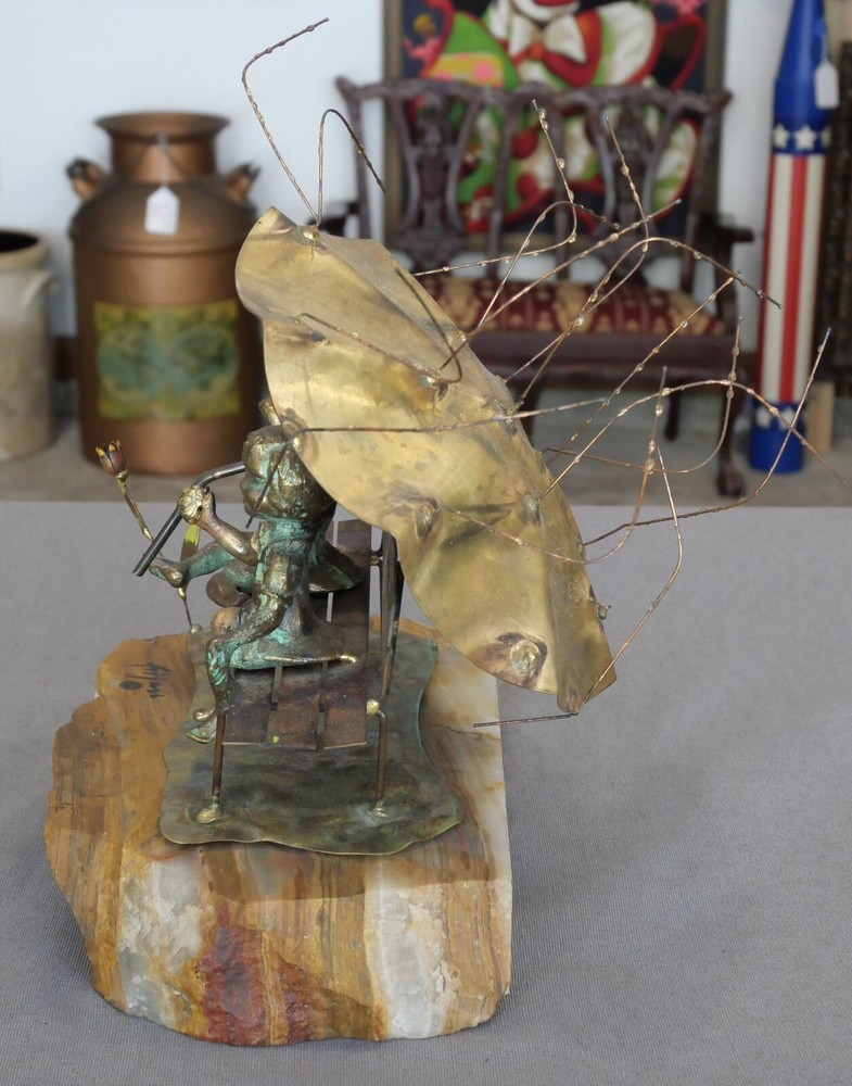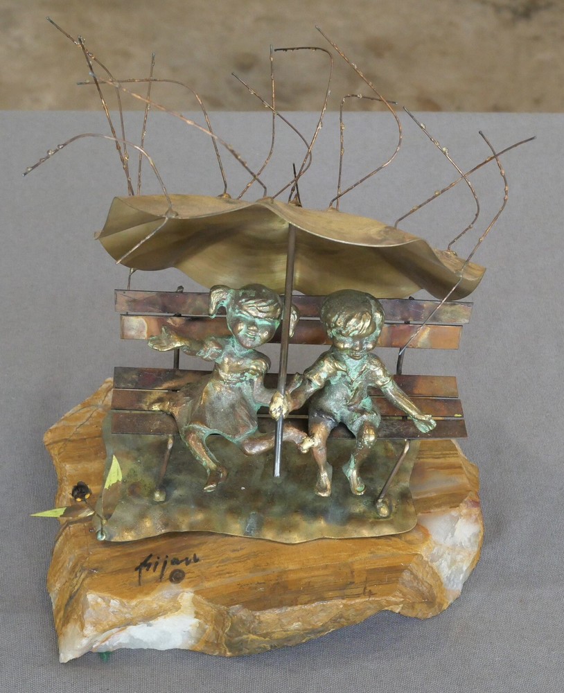 Up for sale is a Vintage 1970’s American Brutalist “Raindrops” Metal Sculpture on Quartz Base by Bijan Bahar! It contains elements of bronze, copper, and brass. It measures 9 3/4” tall. The piece is in excellent overall condition with minor signs of wear consistent with its age and use. Please message us if you have any questions. Thanks! Add a vintage touch to your space with this 1970's "Raindrops" brutalist metal sculpture that depicts two children sitting on a bench holding an umbrella in the rain. Created by acclaimed artist Bijan Bahar, this unique piece will make for a stunning accent in any room. The metallic design and quartz base combine for a truly captivating work of art.