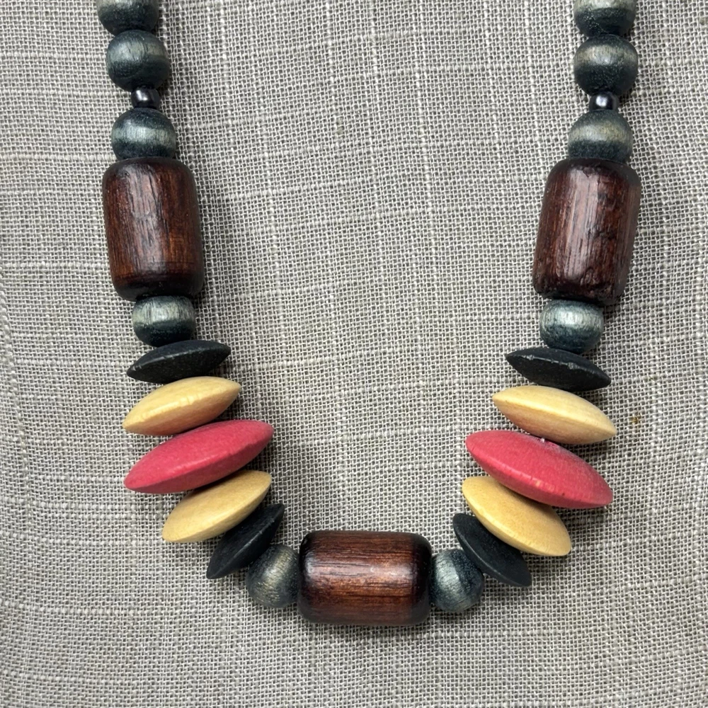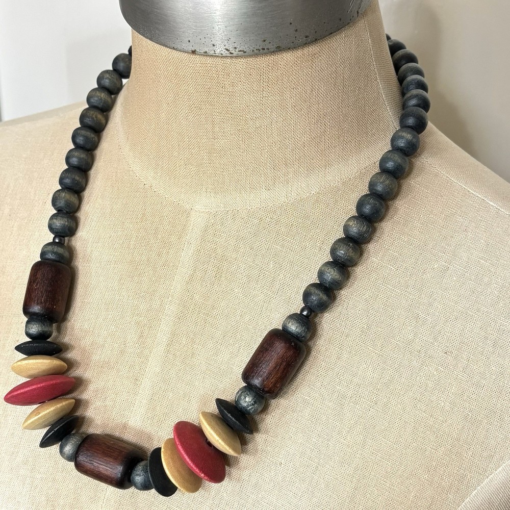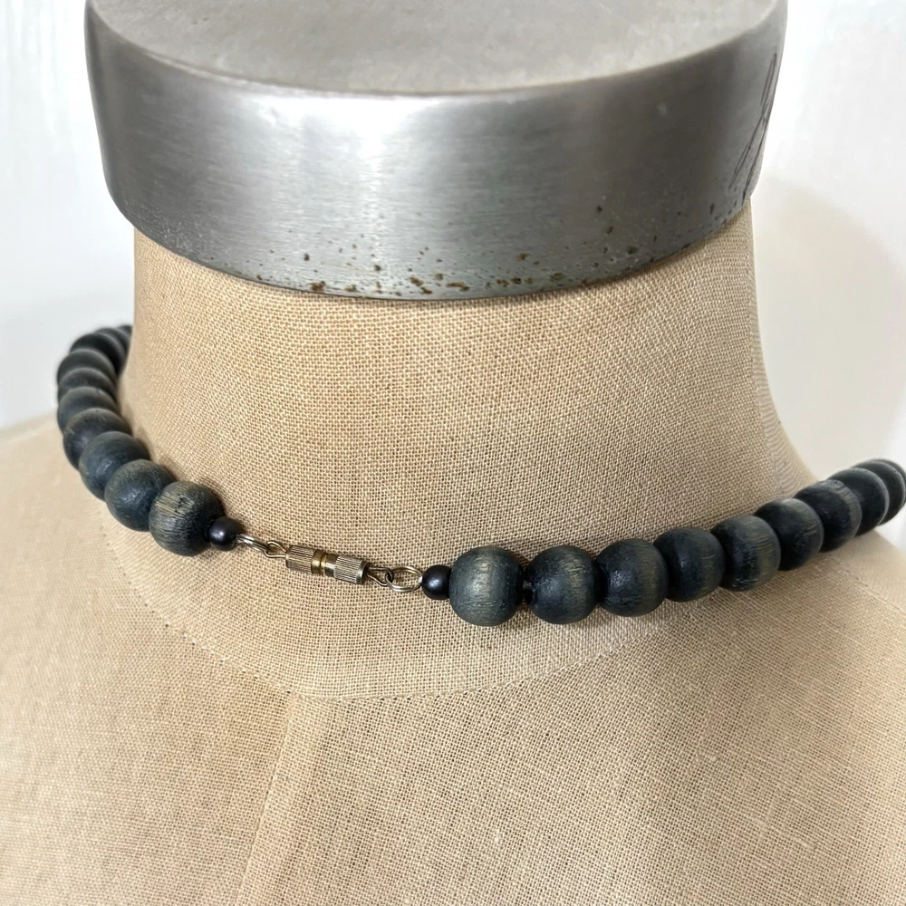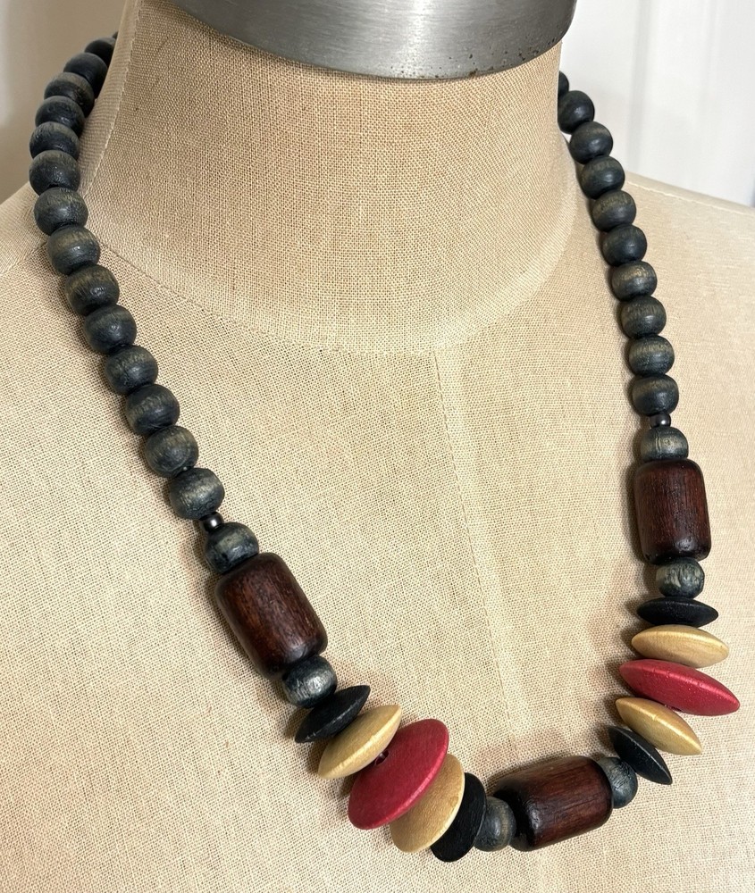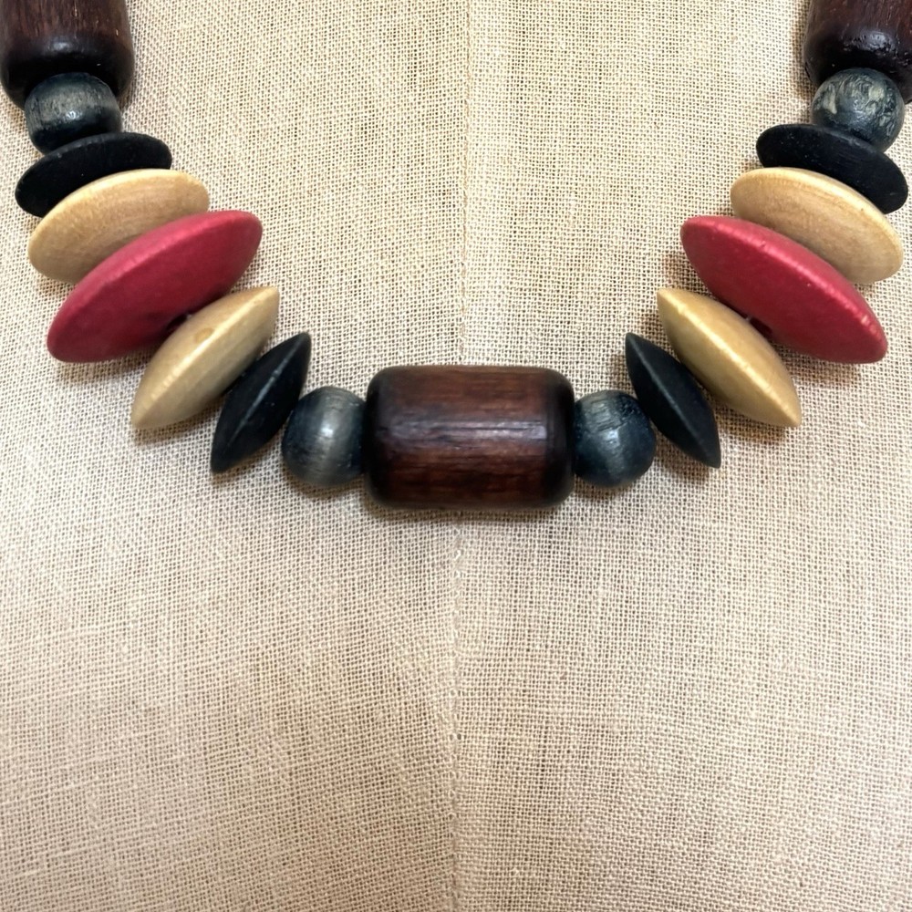 Absolutely love this vintage wooden beaded necklace! The chunky stained beads have a rich, warm look, and the 24" length sits perfectly. The barrel clasp is sturdy and adds a nice retro touch. It's in excellent condition—feels like a true '70s treasure. Would definitely buy again!