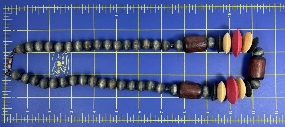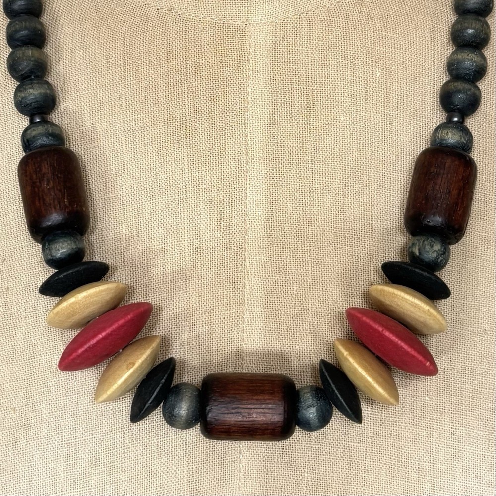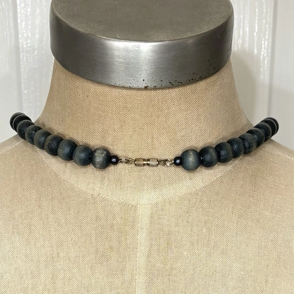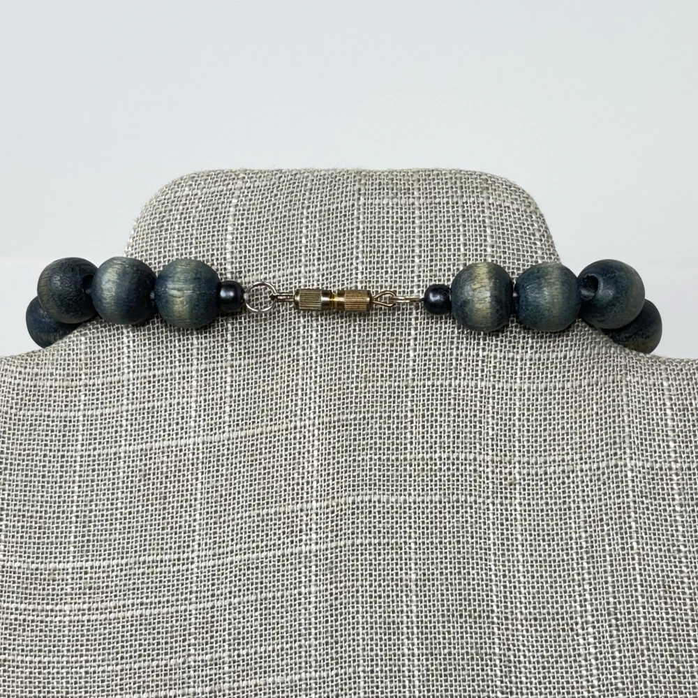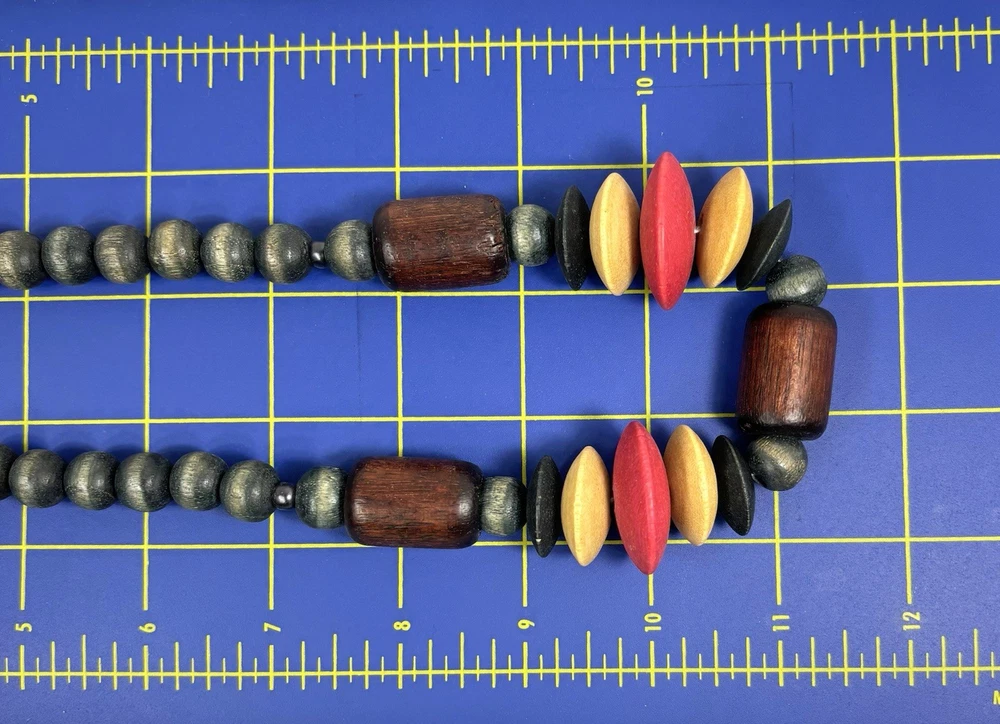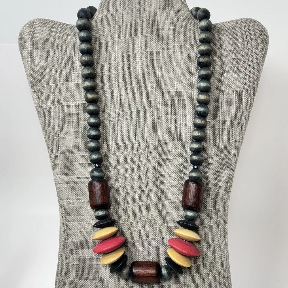 Absolutely love this vintage wooden beaded necklace! The chunky stained beads have a rich, warm look, and the 24" length sits perfectly. The barrel clasp is sturdy and adds a nice retro touch. It's in excellent condition—feels like a true '70s treasure. Would definitely buy again!