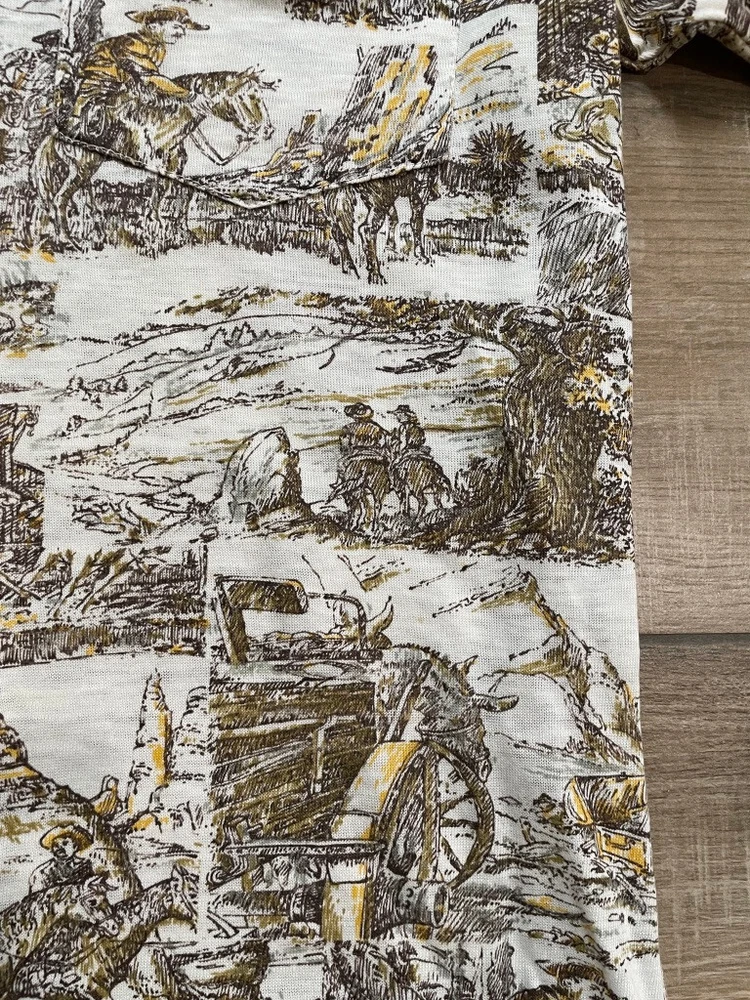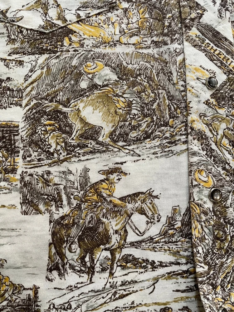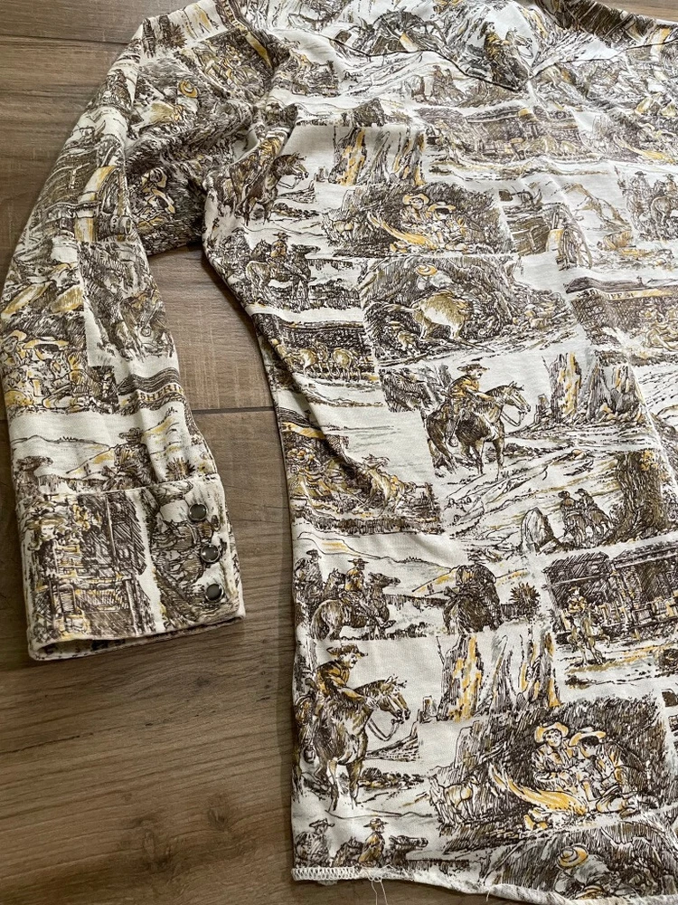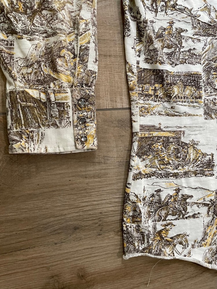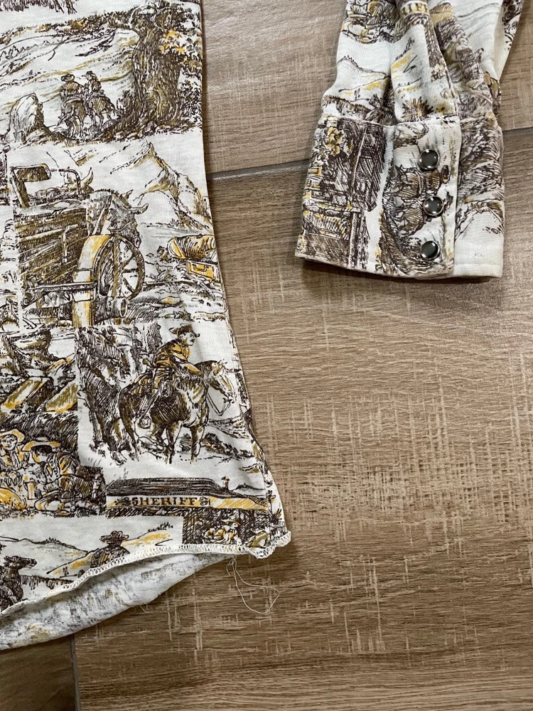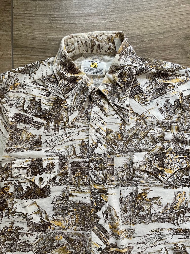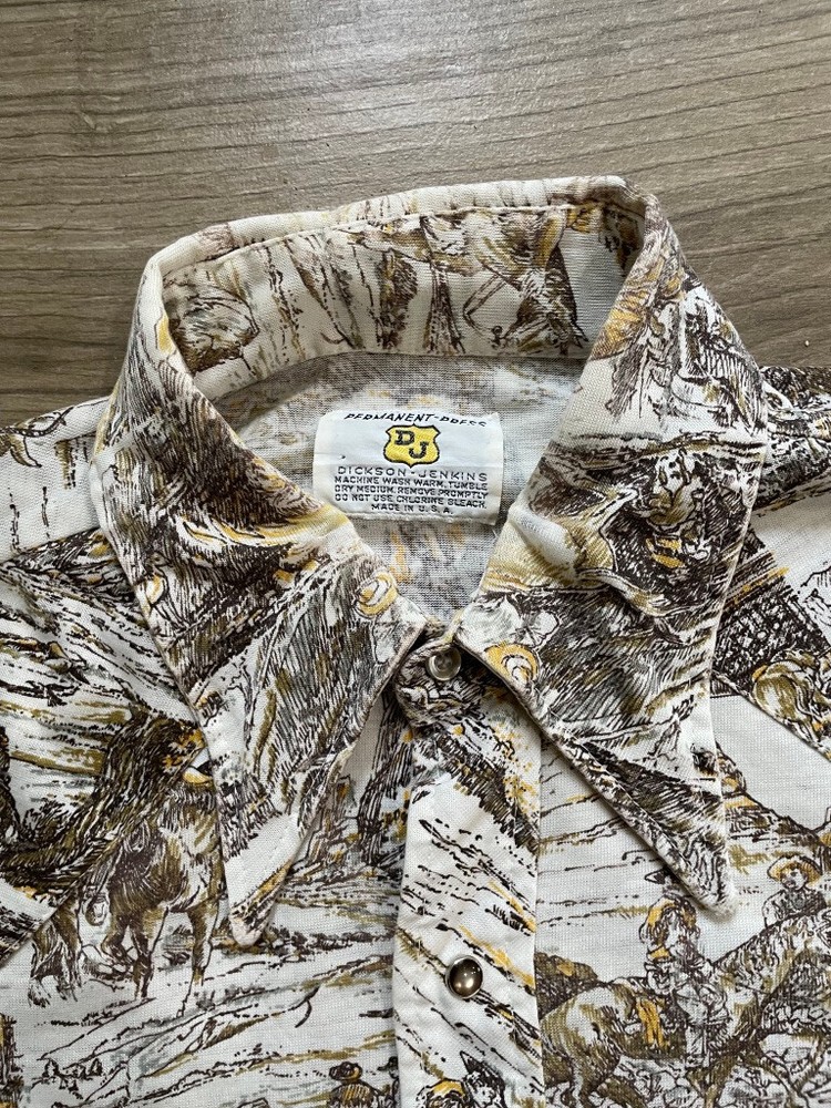 Dickson-Jenkins Vintage USA Pearl Snap Shirt Permanent Press Rare 70s Graphic Cowboy Print Style: Snap close, collared, long sleeve, Yoke trim with snap pockets Fabric: Permanent Press poly Color: Tan, brown with fabulous Western and Cowboy graphic scenes Approximate flat measurements: Pit to pit 21 1/2", Length back neck to hem 27", Sleeve 20" Condition: Preowned vintage with general wear- no spots or holes. Tag size: no tag - presume Medium per chest measurements shown in photos and listed above however sleeves are short Cleaned per Ebay Standards