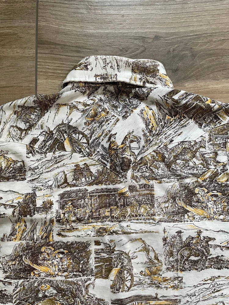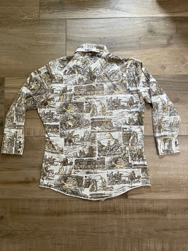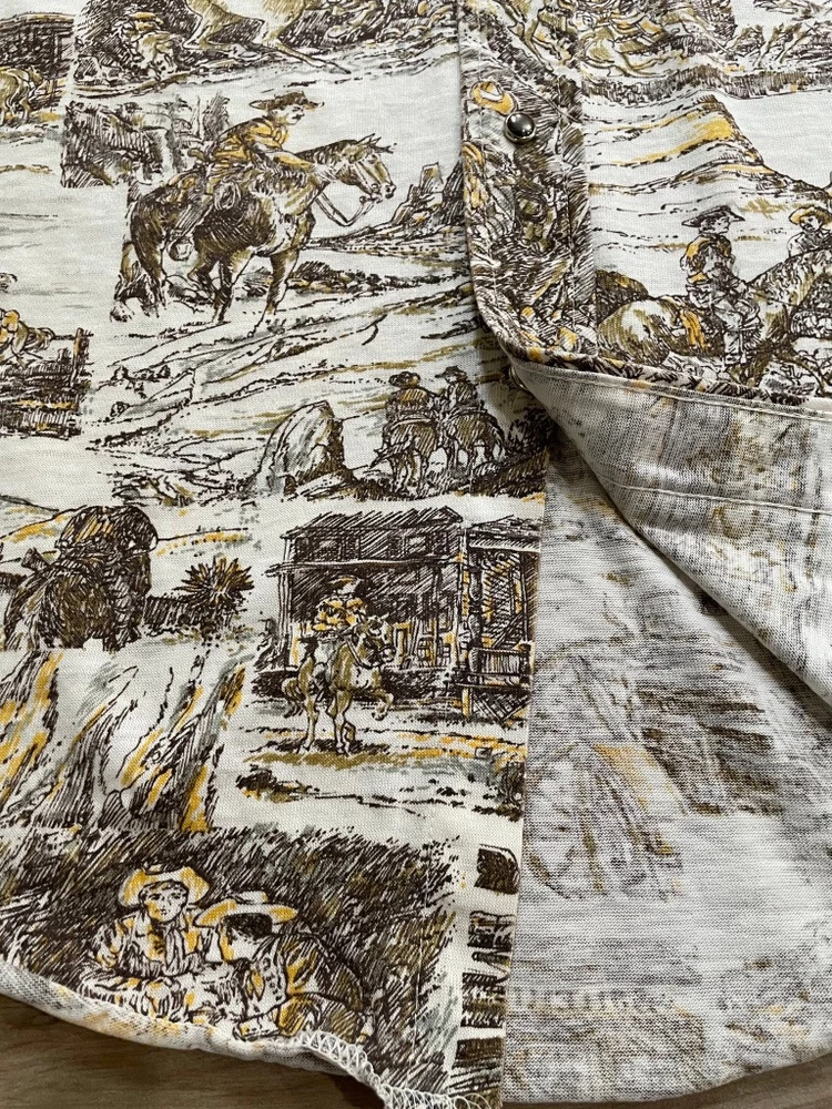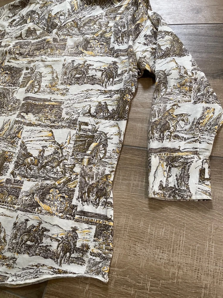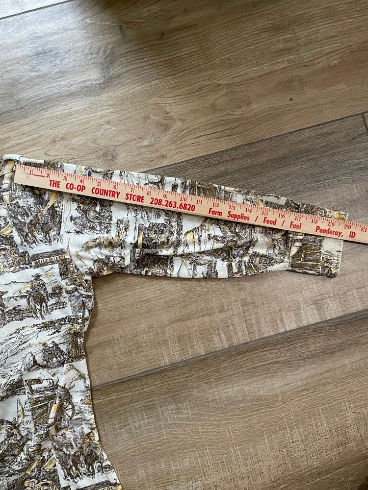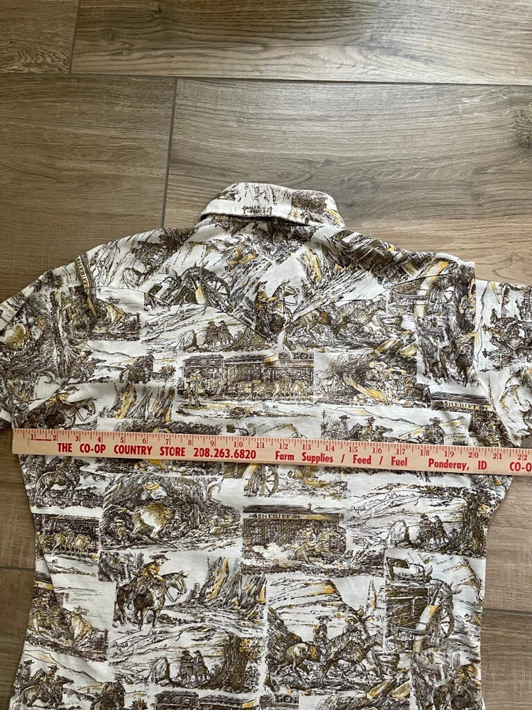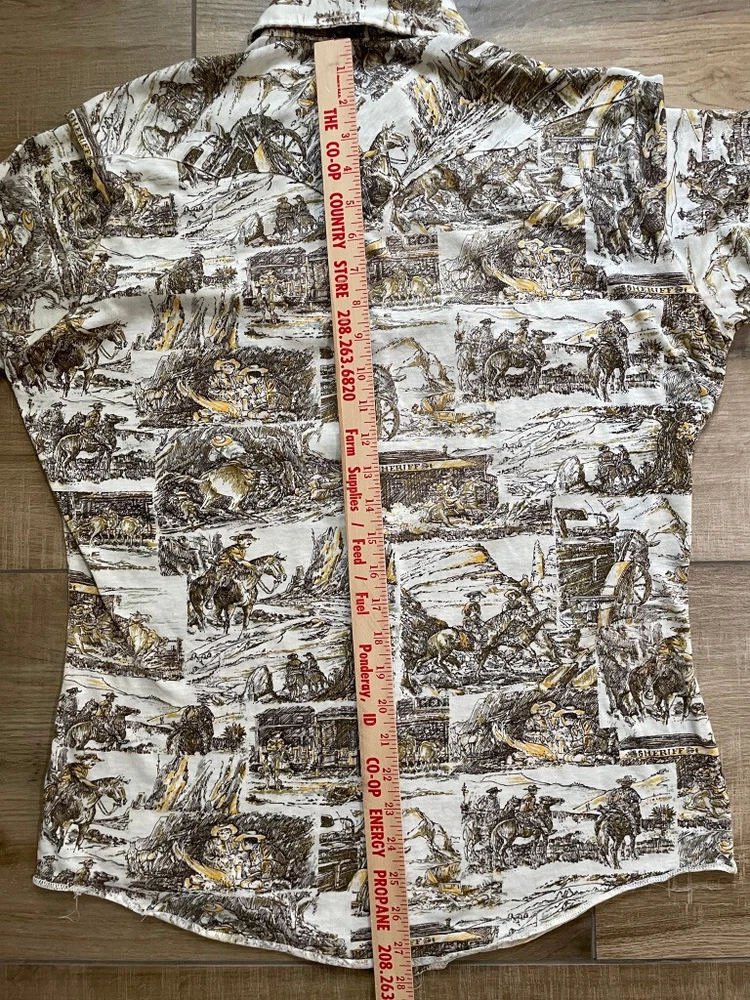 Dickson-Jenkins Vintage USA Pearl Snap Shirt Permanent Press Rare 70s Graphic Cowboy Print Style: Snap close, collared, long sleeve, Yoke trim with snap pockets Fabric: Permanent Press poly Color: Tan, brown with fabulous Western and Cowboy graphic scenes Approximate flat measurements: Pit to pit 21 1/2", Length back neck to hem 27", Sleeve 20" Condition: Preowned vintage with general wear- no spots or holes. Tag size: no tag - presume Medium per chest measurements shown in photos and listed above however sleeves are short Cleaned per Ebay Standards