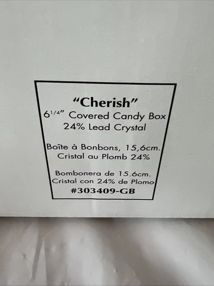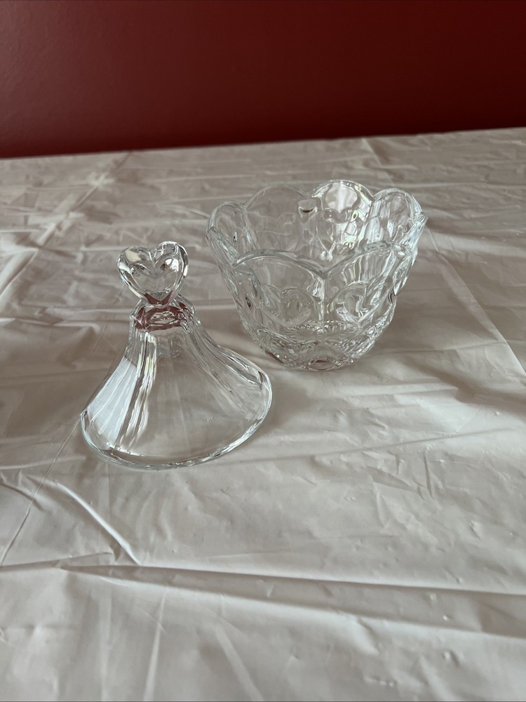This vintage 1970's Fifth Avenue Crystal Cherish Pattern Candy Dish with Heart Lid is a charming piece of decorative cookware. The round candy dish features a beautiful heart pattern, adding a touch of love to any space. Made of crystal with a glossy finish, this original piece from the 1970s is a unique addition to any collection. The candy dish has a diameter of 4.25 inches and a single compartment, making it both functional and stylish for displaying candies or small treats. Taken out of box only to use as display. Box is damaged as seen in photos the tab was ripped off.
