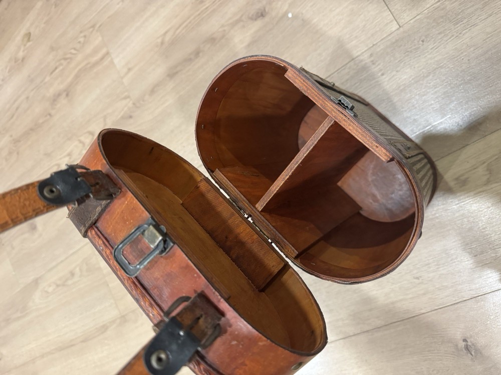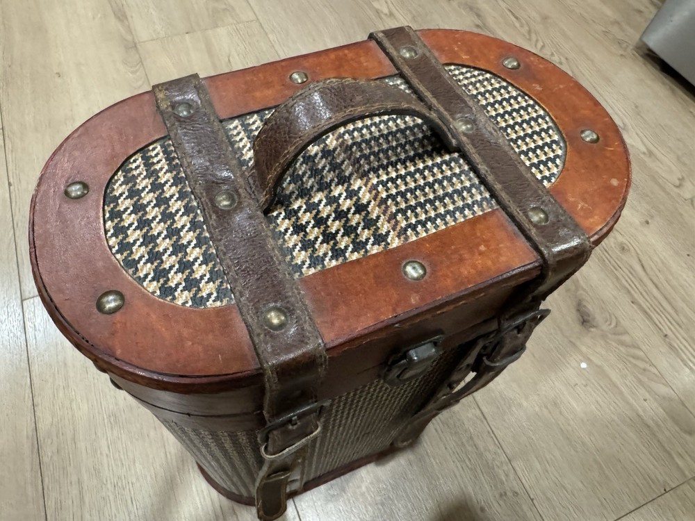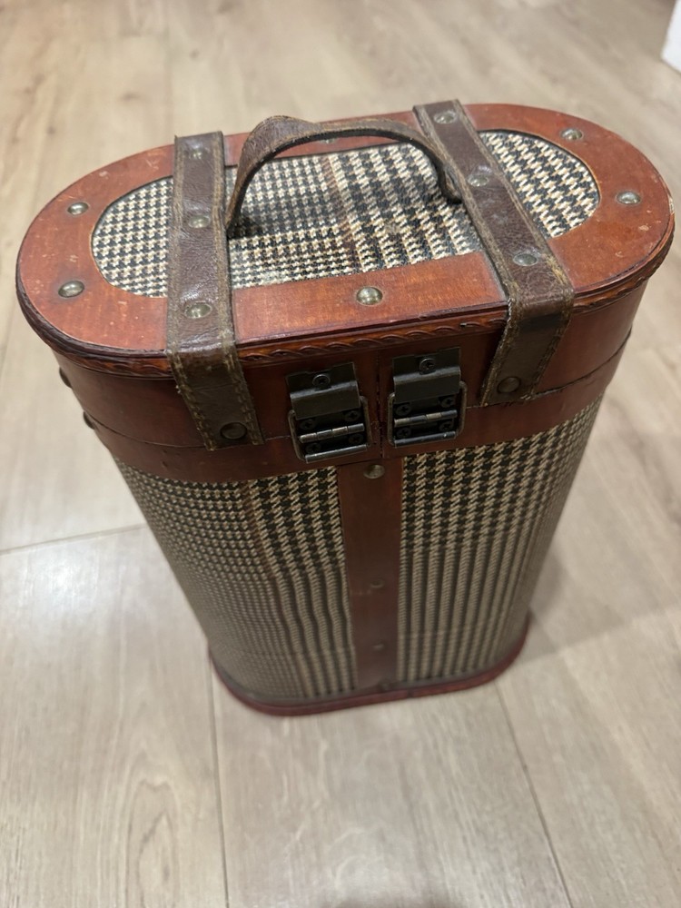 $ 105.58Wine Box Carrier Wood Brass Hardware Leather Like Handle Storage Gift Decor 14”