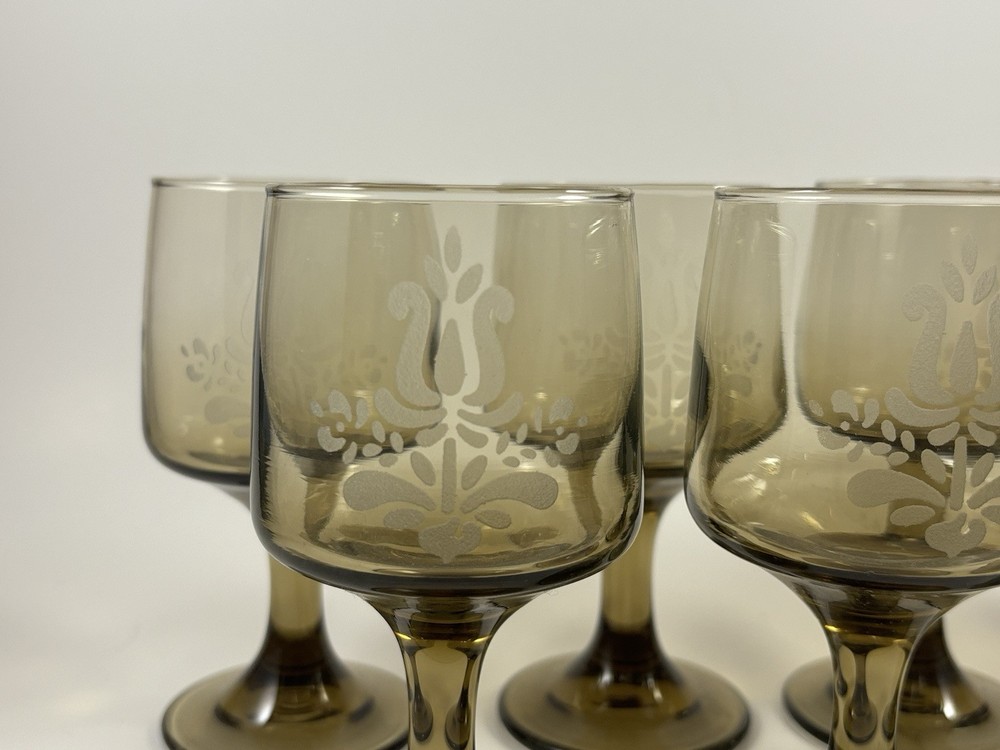 HomeVintage 1970s Pfaltzgraff Village Brown Glass Pedestal Wine Glasses Set of 7