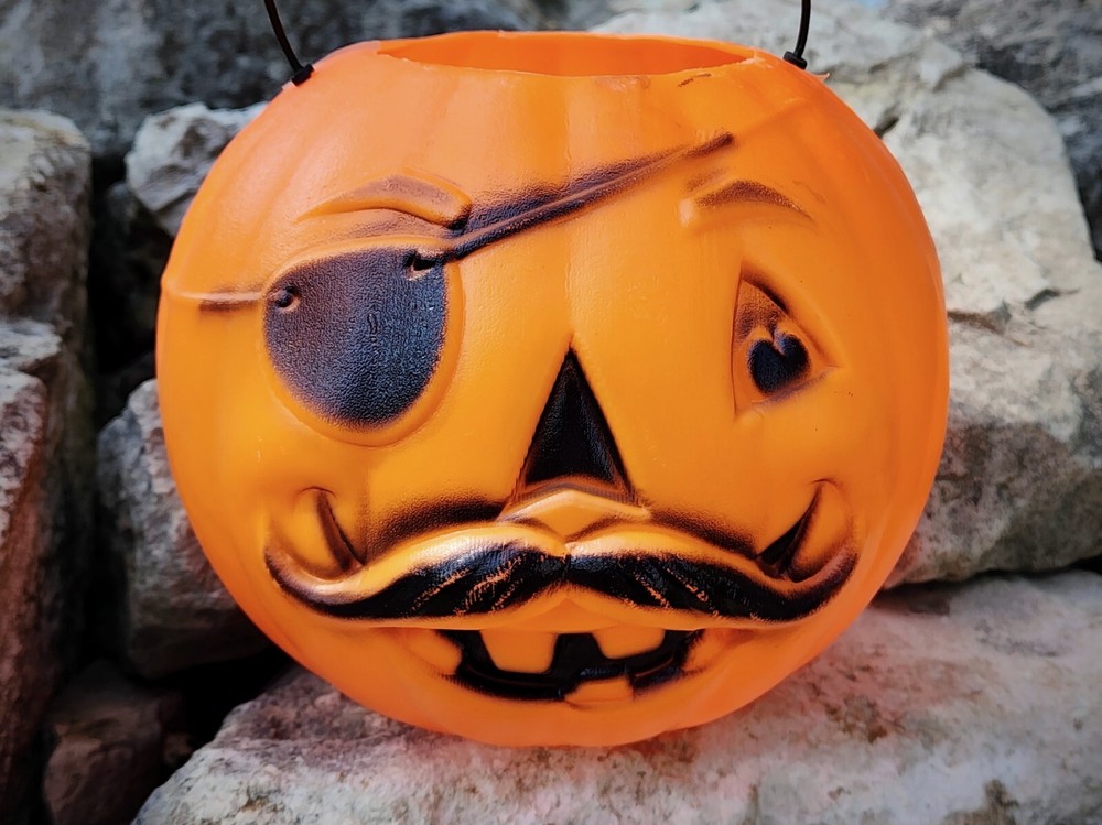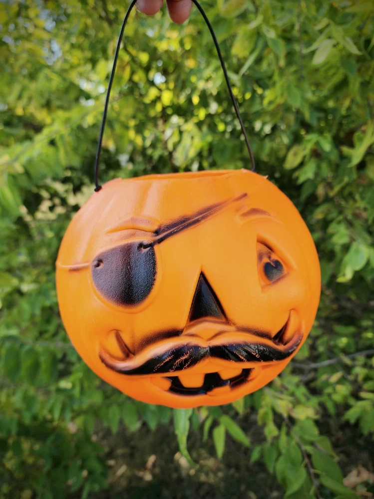 This vintage blow-mold candy bucket is in solid shape for its age. Made in the 1970s by General Foam Plastics, the pirate face 'Jack O Pail' with the handle intact, is hard to find. There are no dents or damage to this bucket, and it is in excellent vintage condition. See photos. Measures roughly 8" wide, 7" tall *** *** *** DEFIANT SNAILS All items are sold 'As Is.' I do my best to accurately describe each listing and will happily answer any questions prior to purchase. Most of my items are pre-owned, vintage, or antique. Expect signs of wear/usage, odors, and occasional dirt on any pre-owned and vintage items (though they do get a quick clean up). Any related details will be listed in the description above. Please note that colors can vary slightly from screen to screen.