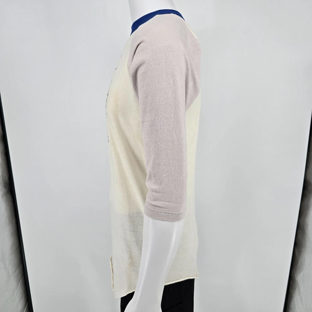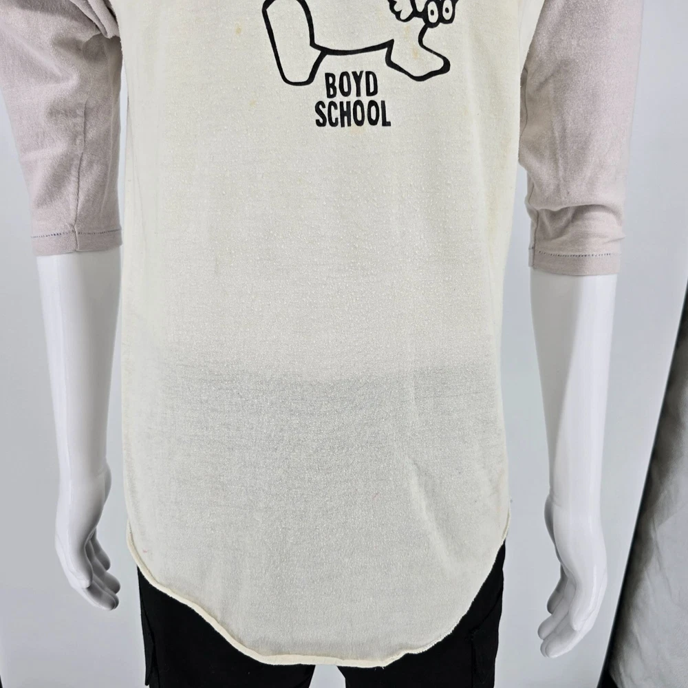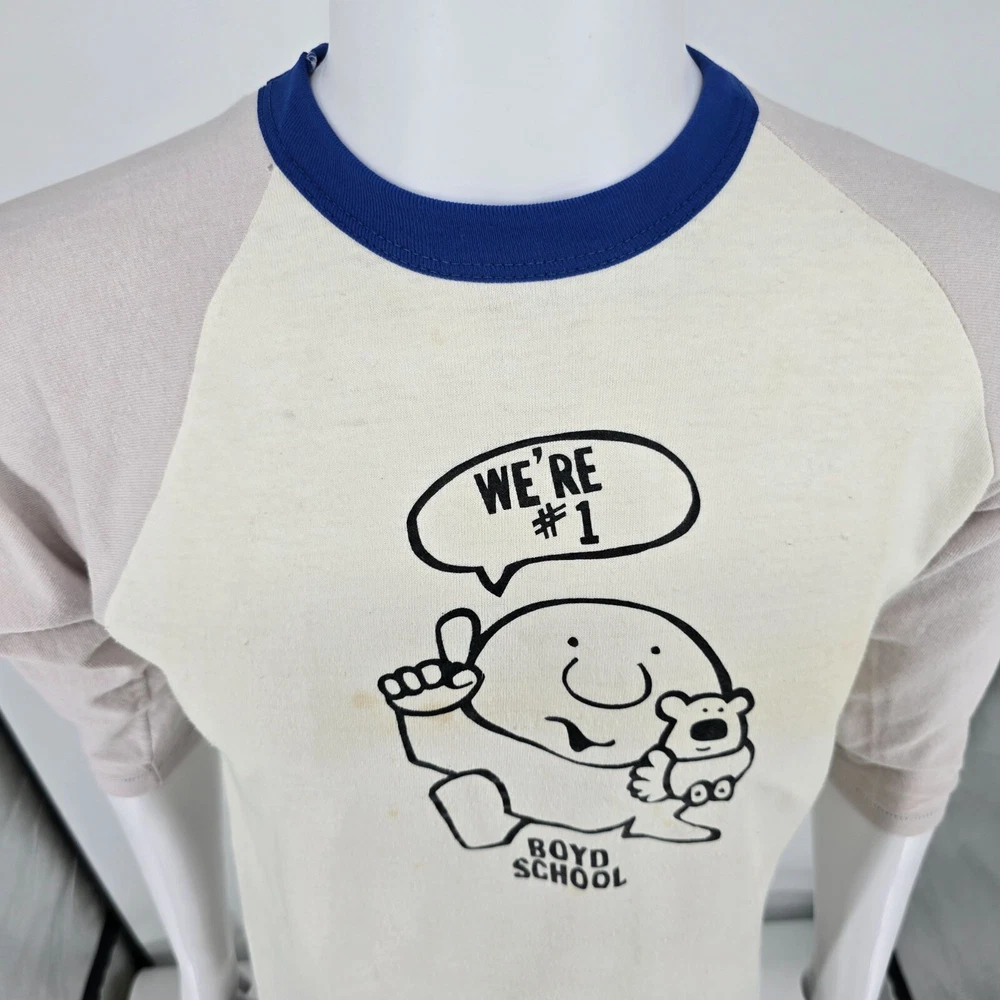 ๐น Item Details: Brand: Russell Athletic Material: 70% Cotton, 30% Polyester Color: Natural/Beige Body with Light Taupe Sleeves and Blue Ribbed Collar Decade of Manufacture: 1970s Country of Manufacture: USA Notable Features: Ringer collar, curved hem, contrasting three-quarter sleeves, single stitch cuffs ๐น Condition Notes: Fair/distressed used vintage condition. Significant spots of yellow and red staining on both the font and the back. Significant areas of discoloration throughout. Moderate to heavy fabric wear throughout. See photos. ๐น Size Notes: Vintage Tag Size: Large Modern Measured Size: Medium ๐น Measurements (Approximate): Chest (pit to pit): 39 inches Collar to Hem: 29 inches at lowest point of scoop, 25 inches at highest part of scoop at hips ๐น Shipping & Returns: Ships worldwide from Lexington, KY. Ships within 3 business days of purchase. Returns accepted within 60 days for domestic orders and 30 days for international orders.