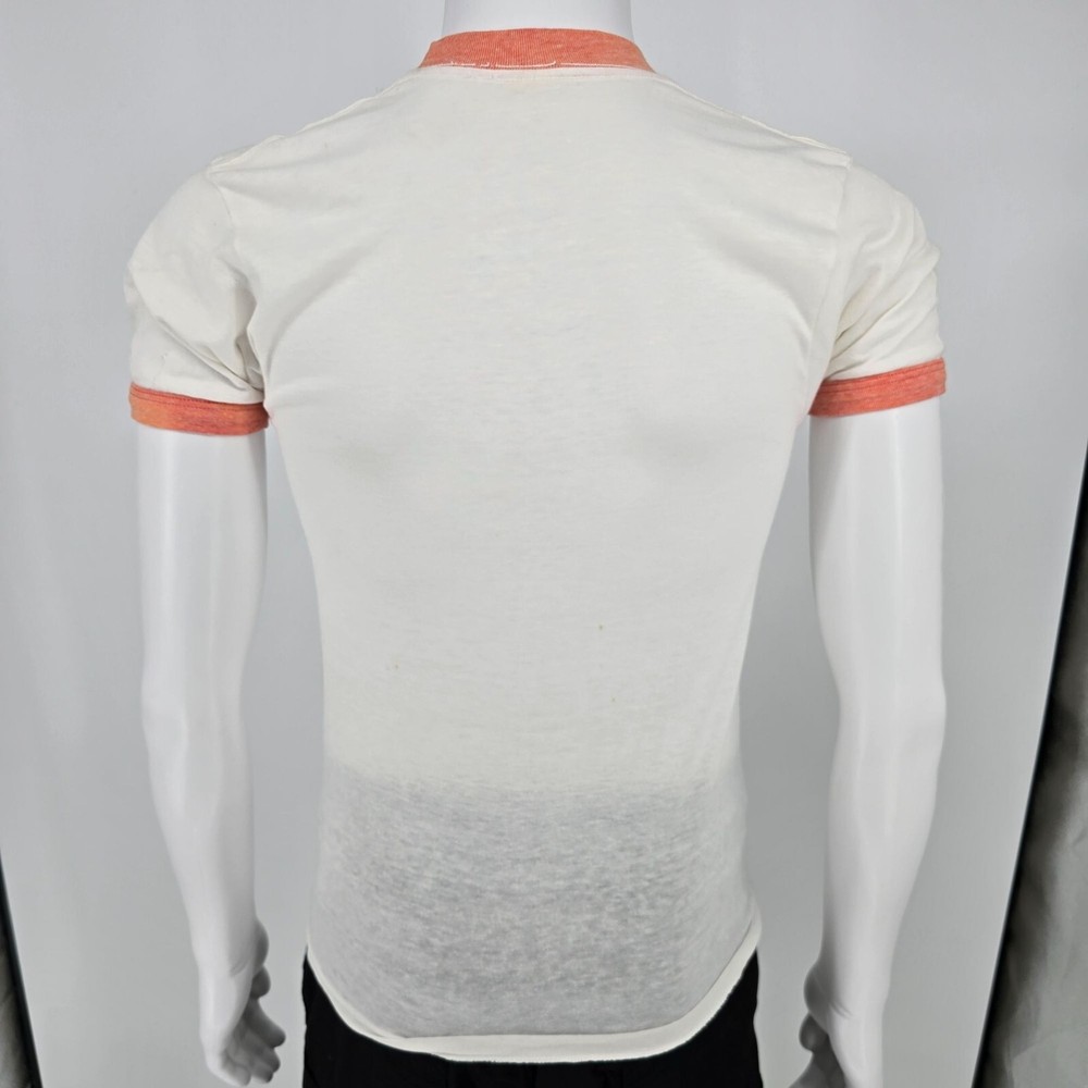 ๐น Item Details: Brand: Unknown (tag illegible) Material: Unknown (likely cotton-poly blend) Color: White with Heathered Orange Ringers Decade of Manufacture: 1970s (most likely date range is late 1970s but early 1980s is also a possibility) Country of Manufacture: Unknown (but almost certainly USA) Notable Features: Ring collar and cuffs, single stitch hem ๐น Condition Notes: Good used vintage condition. Tag illegible. Multiple small stains on back of shirt in middle. Deep vertical fold lines in the middle of both the front and the back of the shirt. Light to moderate fabric wear throughout. See photos for details. ๐น Size Notes: Vintage Tag Size: Unknown Modern Measured Size: Extra Small (32.5) ๐น Measurements (Approximate): Chest (pit to pit): 32.5 inches Collar to Hem: 25.5 inches ๐น Shipping & Returns: Ships worldwide from Lexington, KY. Ships within 3 business days of purchase. Returns accepted within 60 days for domestic orders and 30 days for international orders.