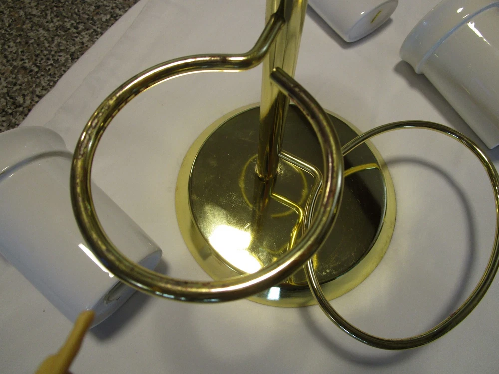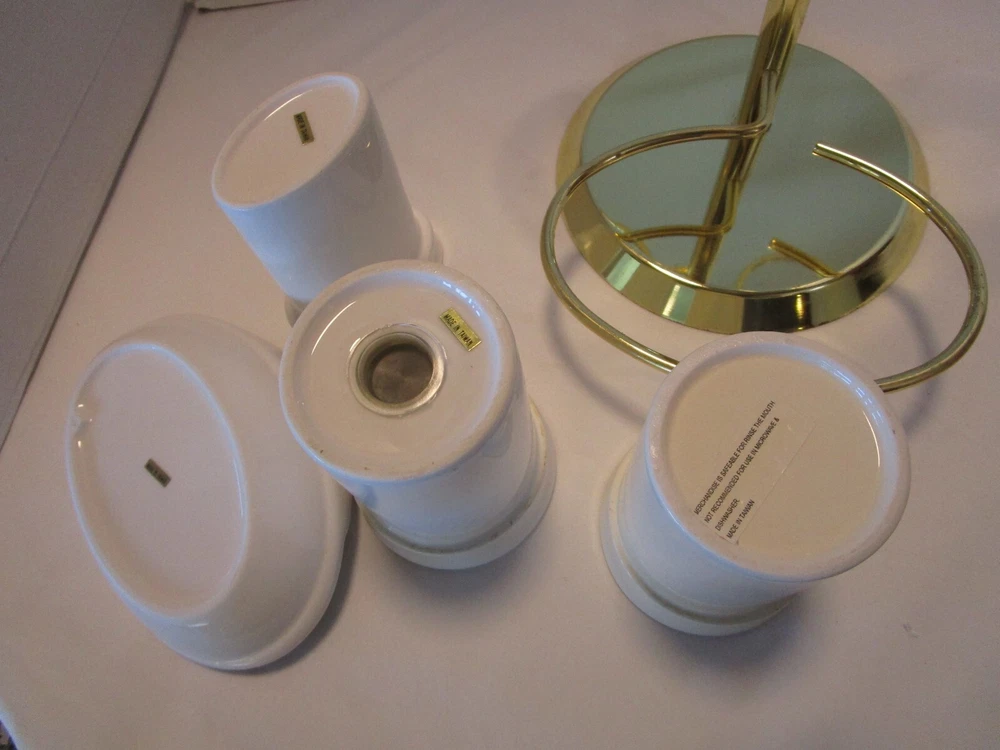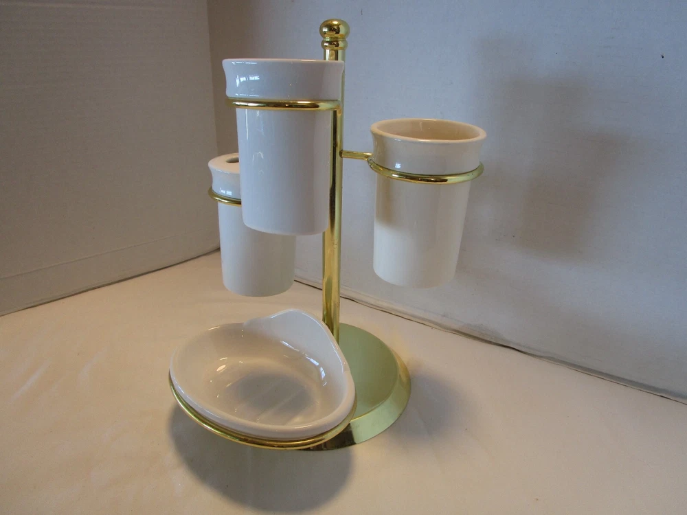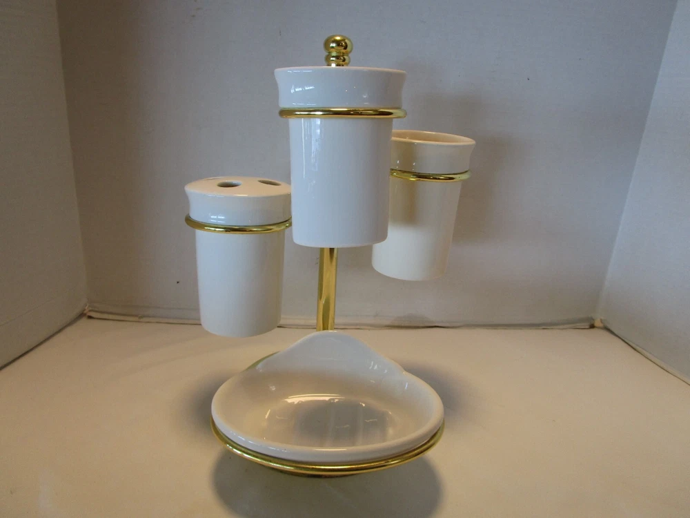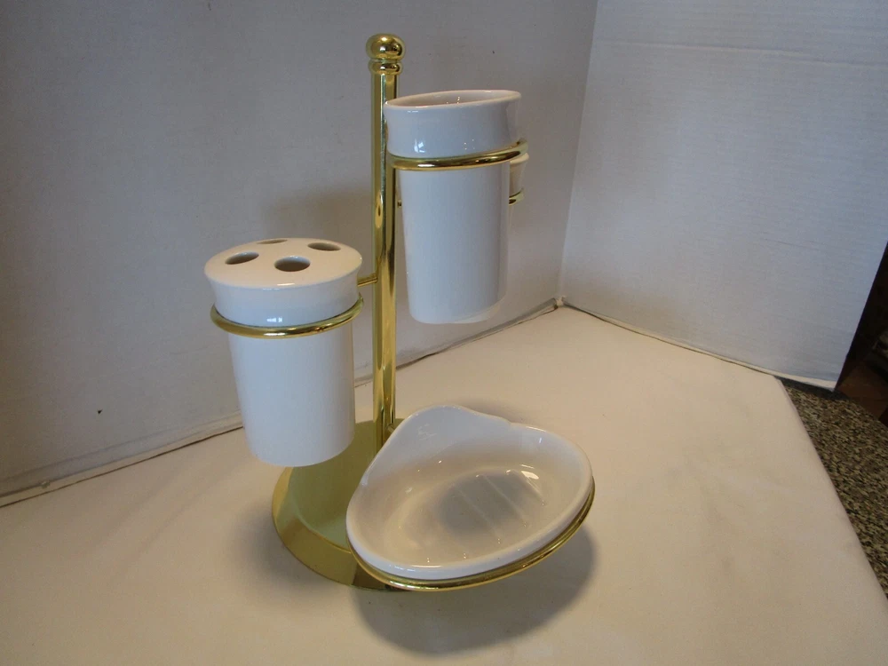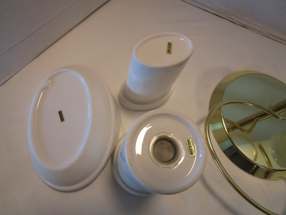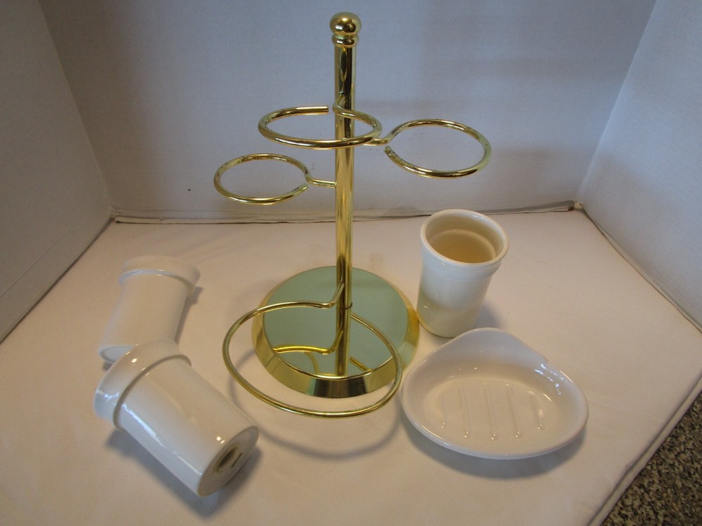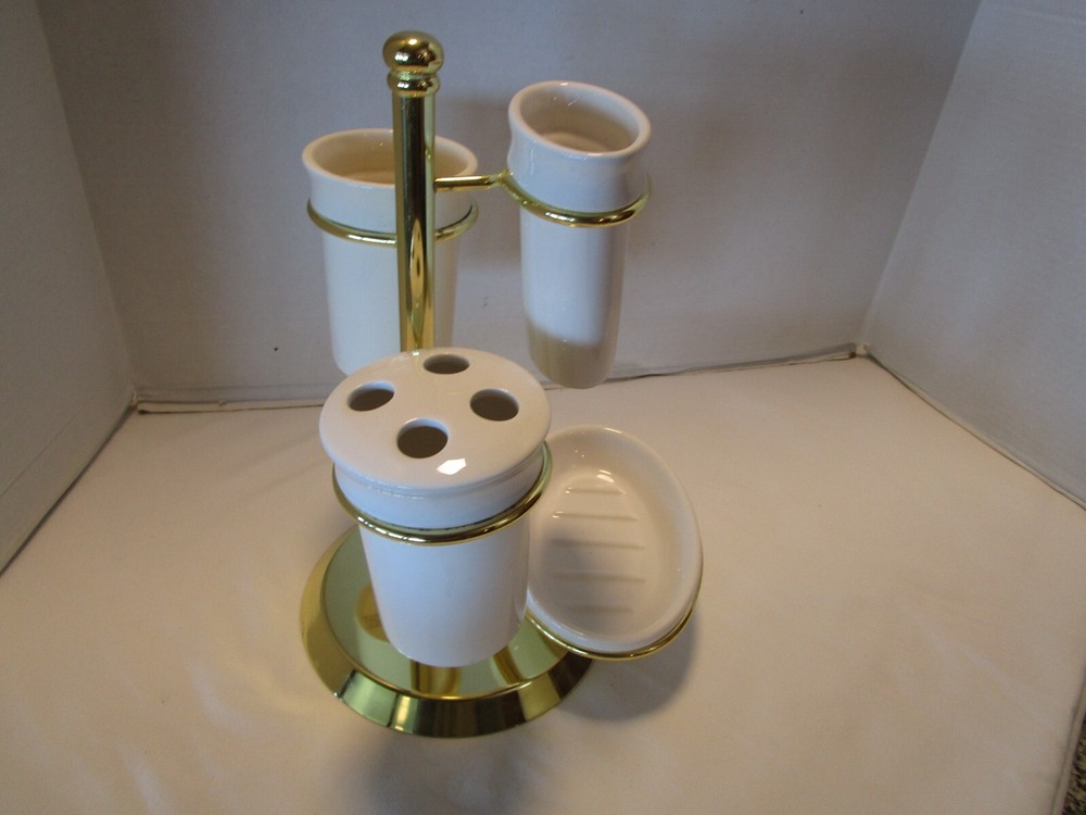 Description: 9/16/12/12/ book # 484 Vintage 1970’s Ceramic bathroom Accessory four piece on a metal gold tone stand – Complete set · Material: Ceramic- white – one glass has darker tone- see pictures · Package Contents: 1 Soap tray, 1 Toothbrush holder, 1 toothpaste tube holder, 1 water glass · One wire metal gold tone holder with adjustable rings-with appropriate wear for its age and use. · Size: the overall it is 12.5’ tall x 9” wide and 8.75” deep. · Some pieces still have foil label – made in Taiwan probably in 1970’s set. Good vintage use condition- ceramic does not have chips, cracks or crazing, the wire stand has minimum wear from age and use, see 2 last pictures. Please zoom and view all pictures for more details as they are part of the description. I DO MY BEST TO DESCRIBE EVERY LISTING BUT I AM NOT AN EXPERT AND ITEMS ARE SOLD “AS IS”. My idea of great/good may be different than yours, so EXAMINE PHOTOS CAREFULLY since they are binding and a supplement to the word description in case I should miss something. If I fail to mention something, it does not qualify as “item not as described” if it shows in my pictures. EACH PHOTO IS WORTH A THOUSAND WORDS AND THEY ARE OF THE EXACT ITEM YOU WILL RECEIVE. RETURN POLICY: Returns are acceptable ONLY if the item is defective, or grossly misrepresented. THIS MEANS I DO NOT ACCEPT RETURNS FOR FIT, SIZING, COLOR ISSUES, OR BUYER'S REMORSE. Please zoom and view all pictures as they are part of the description. Please note: Buyer pays ALL return shipping and fees. · FEEDBACK I do not leave feedback until the end of a transaction. The transaction is considered over once I receive feedback from you confirming that you have received it and expressed satisfaction with it. If you are unsatisfied with your purchase, please contact me before leaving a neutral or negative feedback- so I can fix the issues. Thanks again for shopping at our eBay store and look forward to serve you. ·