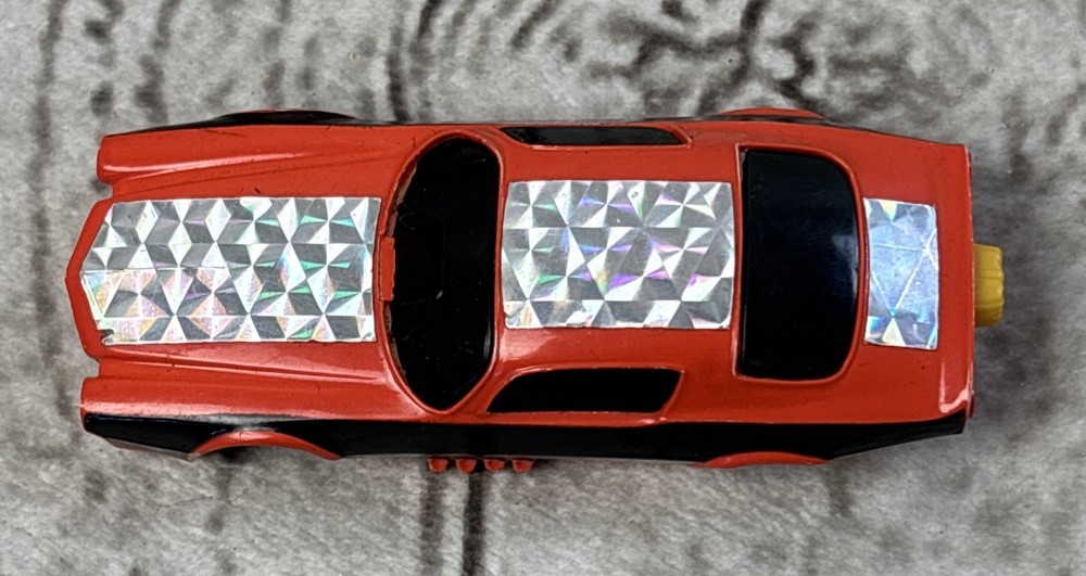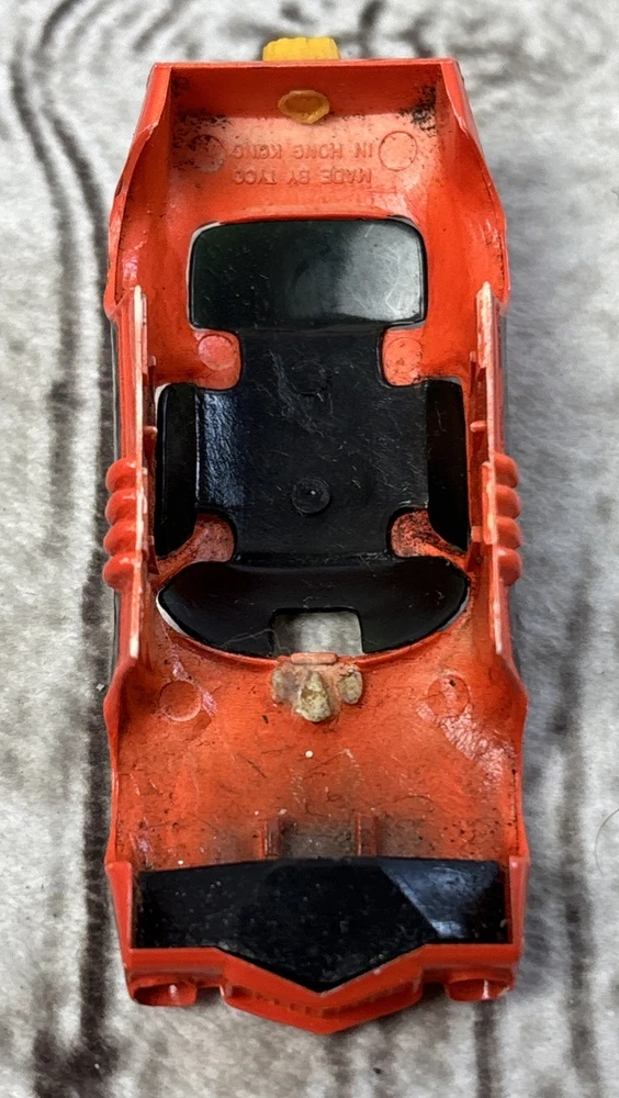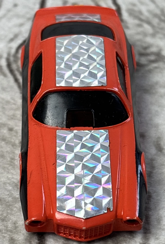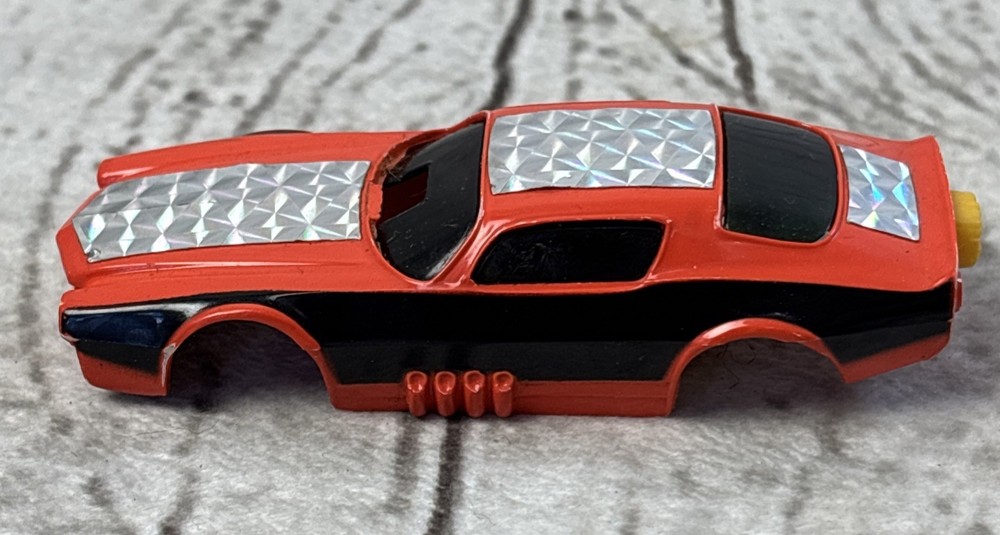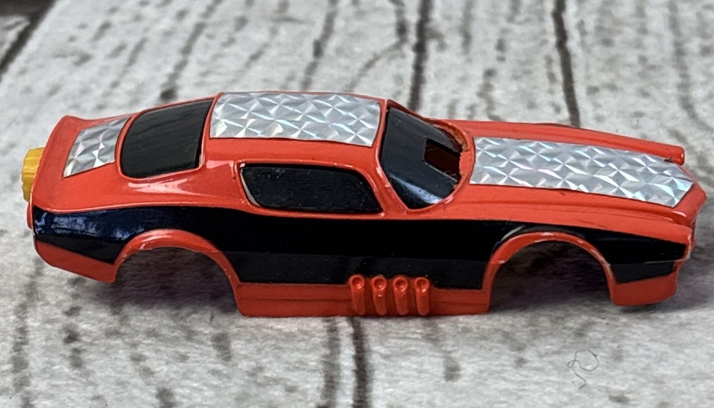 Tyco Pro Orange Chevy Camaro Funny Car HO Slot Car Body 1970s •Vintage Tyco Pro HO slot car body only—no chassis •Orange Chevy Camaro funny car style from the 1970s •Black side detailing with chrome prism foil decals •Yellow parachute-style rear and quad tail lights •Interior and underside marked “Made in Hong Kong” •Preowned with minor wear—great for restoration or parts