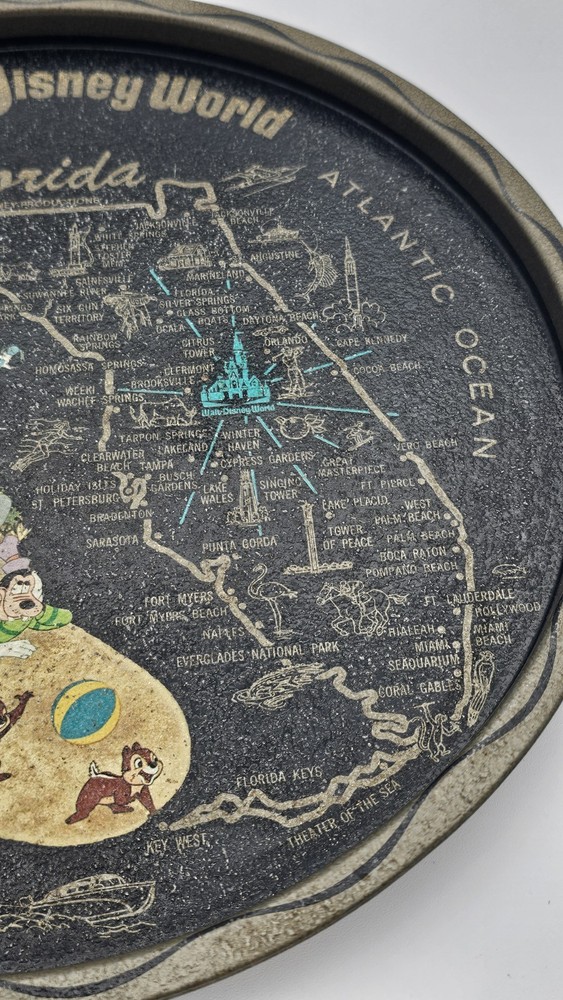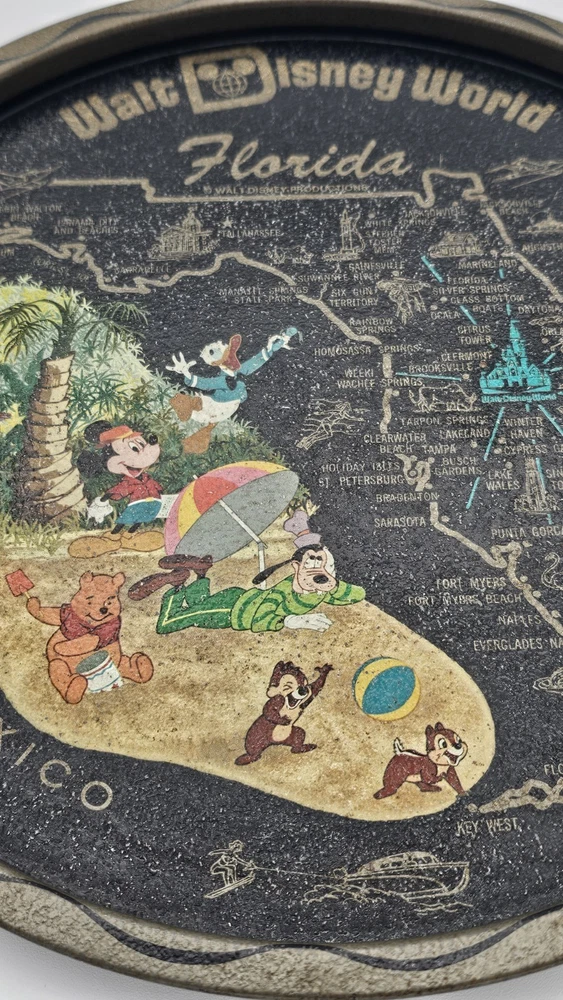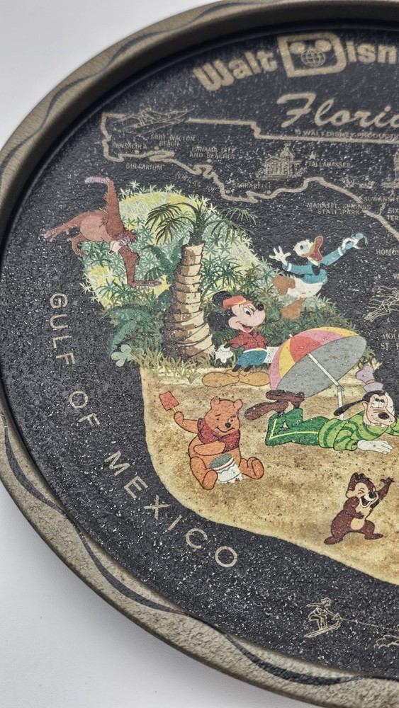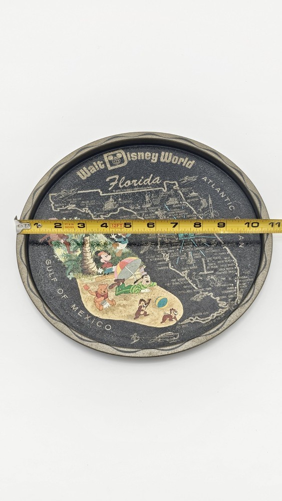 Has some wear due to age and use, the front image has some wear as pictured. The rear has a few marks. Will display nicely. Relive the magic of yesteryear with this classic Vintage Walt Disney World Round Tin Metal Souvenir tray, a nostalgic nod to Florida's enchanting allure. Perfect for collectors and Disney enthusiasts, this 11-inch serving tray showcases the beloved characters of Mickey Mouse and his friends, set against the vibrant backdrop of the iconic Walt Disney World map. Crafted in the United States during the whimsical 1970's, this piece is not just a tray but a slice of Disneyana history. Whether used to serve goodies at your next gathering or displayed as part of your collection, it's a charming tribute to the franchise that has sparked imaginations for generations. Disclaimer: This is to be considered in acceptable condition with wear including scuffs, marks, nicks, tarnishing, discoloring, stains, dings, etc. These are used and are NOT mint. If any of this is unacceptable to you, please do NOT purchase this. Please review the photos/listing again before purchasing. This would make an amazing gift or addition to a collection and at an amazing price!!! Be sure to check out my eBay store! I have thousands of eclectic and cool collectibles, all at amazingly low prices!!! PLEASE READ: Please be aware that most of our items come from estate sales and other secondary owners. This means that the item(s) might have been exposed to smoke/pets/etc. Please take this in to consideration before bidding. We've done our best to include as many pics as possible to show the item's condition. Again, all items are sold as is. If an item states: "Sold for parts/Non Working/As-is", it means just that. SHIPPING: Please confirm that your address is correct. I will only ship to the address that is associated with your paypal/ebay account. Buyer pays all shipping costs unless "Free Shipping" is offered. After receiving cleared payment I will ship within three business days, holidays and weekends excluded. I pack all items as securely and safely as possible. I sometimes use recycled materials including cardboard boxes, bubble wrap and/or styrofoam packing peanuts. FEEDBACK: Your feedback is important to us. If your business with us is satisfactory, please leave a positive and we will do the same for you. Should there be any problems with this transaction please contact us and we will do our very best to correct them. RETURNS: Are accepted unless otherwise noted. Lastly, thank you for looking at my listing and have a great day!!!!!