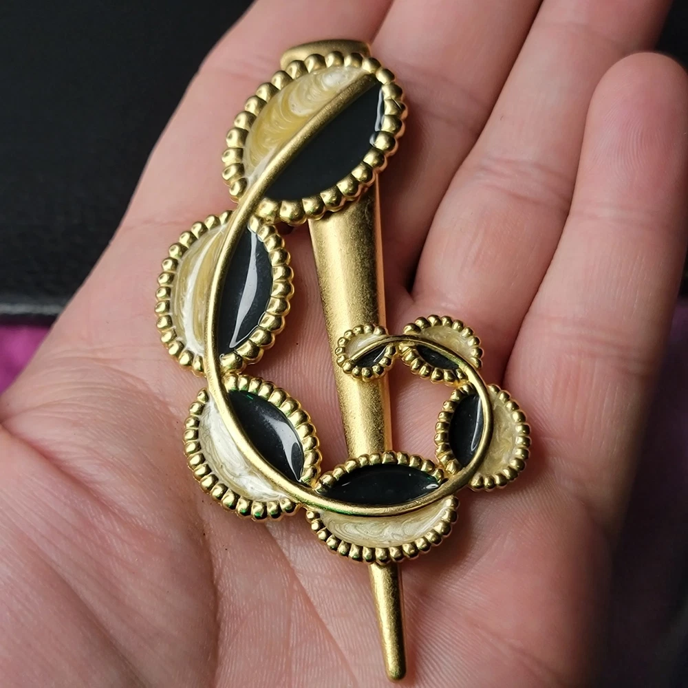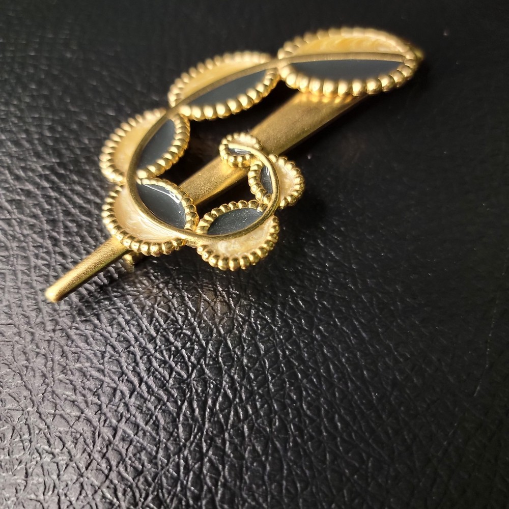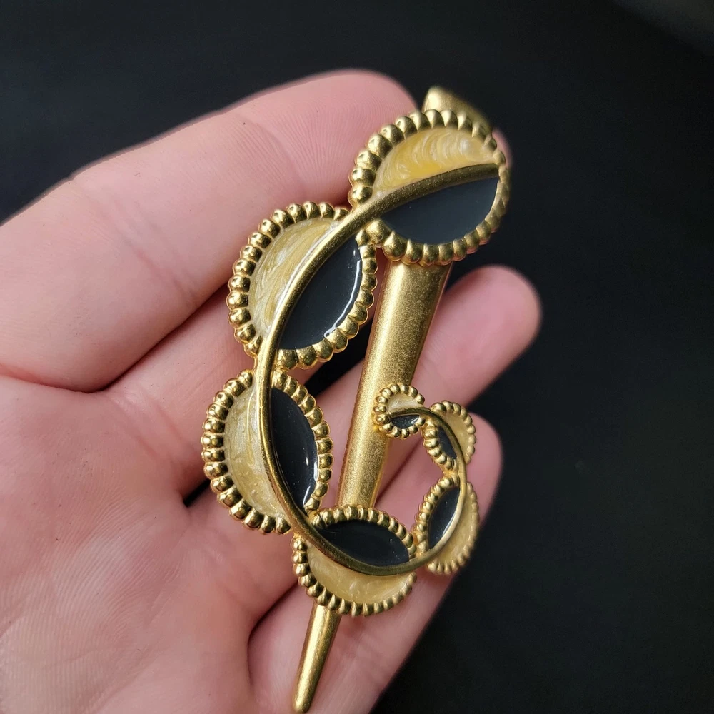 The product is a vintage 1970s MONET for YSL gold enamel modernist designer runway brooch. This brooch features a modernist design in gold enamel, typical of the YSL fashion house from that era. The brand and material suggest a high level of quality and craftsmanship, making it a unique and eye-catching accessory for any vintage jewelry collection.