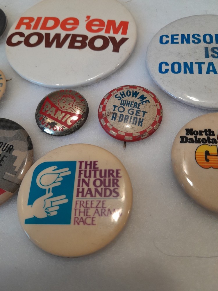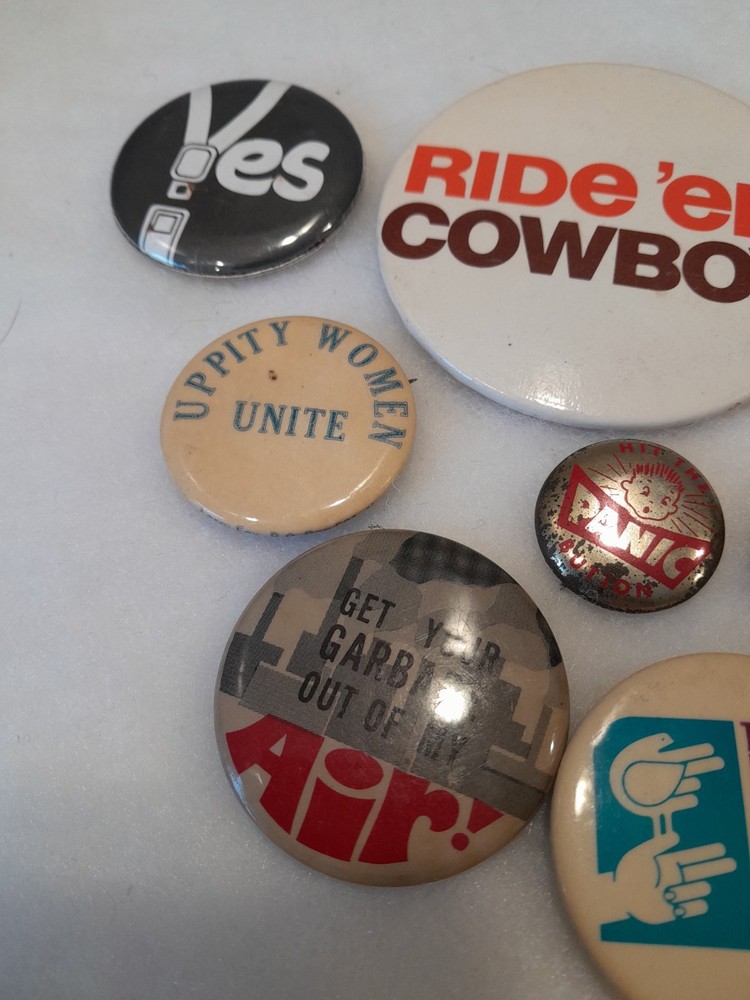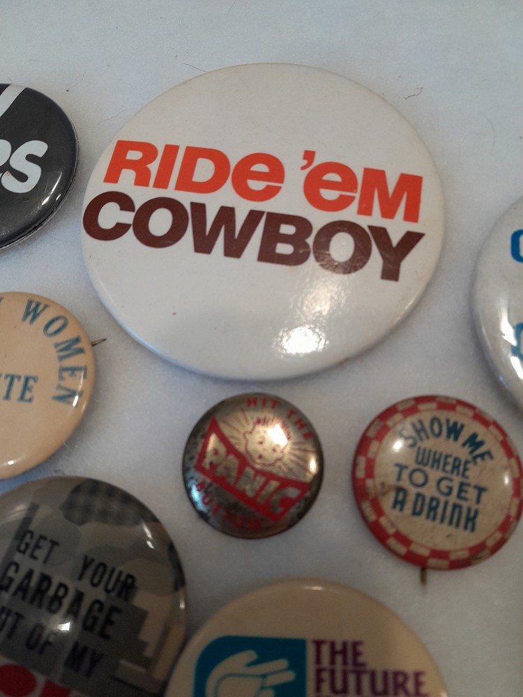 This lot of 9 vintage 1970s-1980s pinback buttons features cowboy, nukes, pollution, and women-themed designs. Made in the United States, these collectible pinbacks offer a nostalgic glimpse into the pop culture and social issues of the era. Perfect for collectors or vintage enthusiasts looking to add unique and quirky pieces to their collection." All great condition