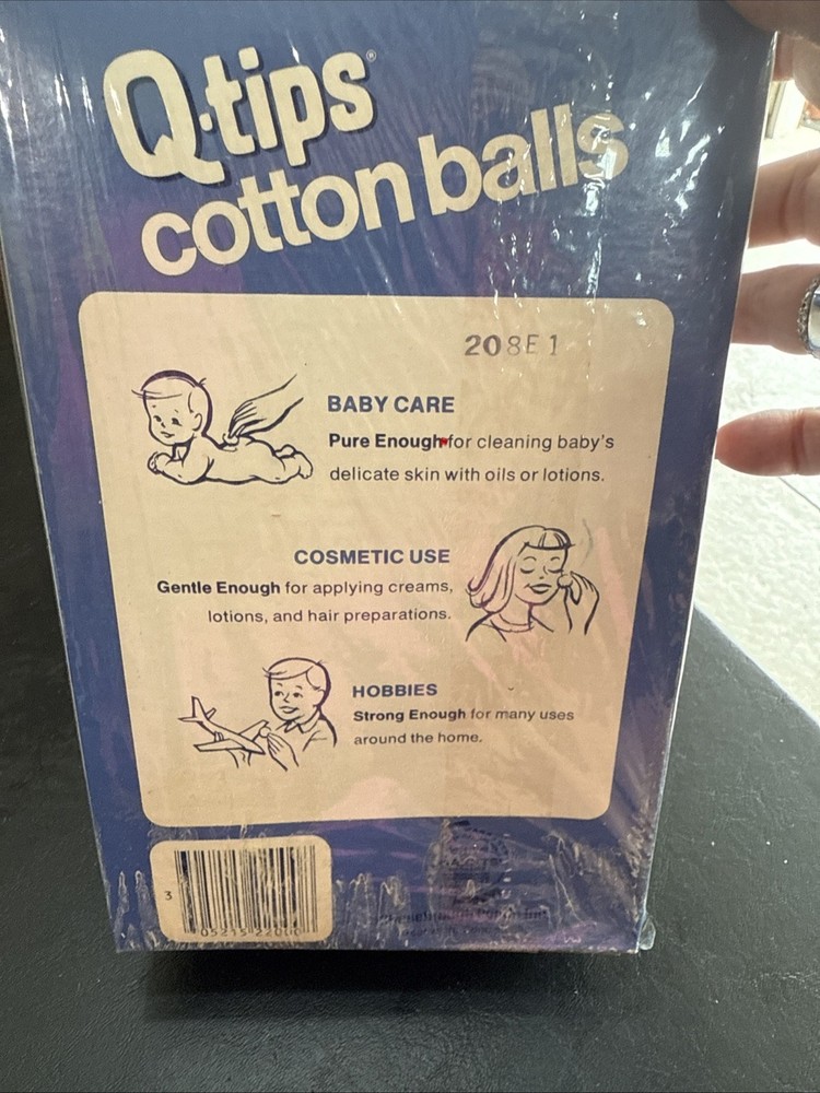 The product is a vintage 1970-80 Q-tip cotton ball box that is fully sealed. This collectible advertising item is from the United States and features a blue color, making it a unique movie prop or cultural artifact. The original box with the Q-tips brand logo embodies the theme of health and beauty, adding a nostalgic touch to any collection related to vintage health and beauty products.