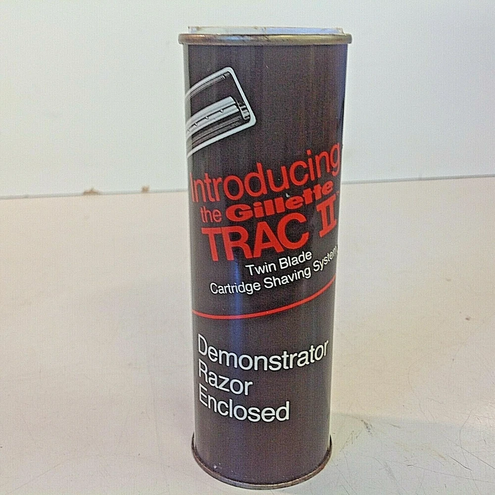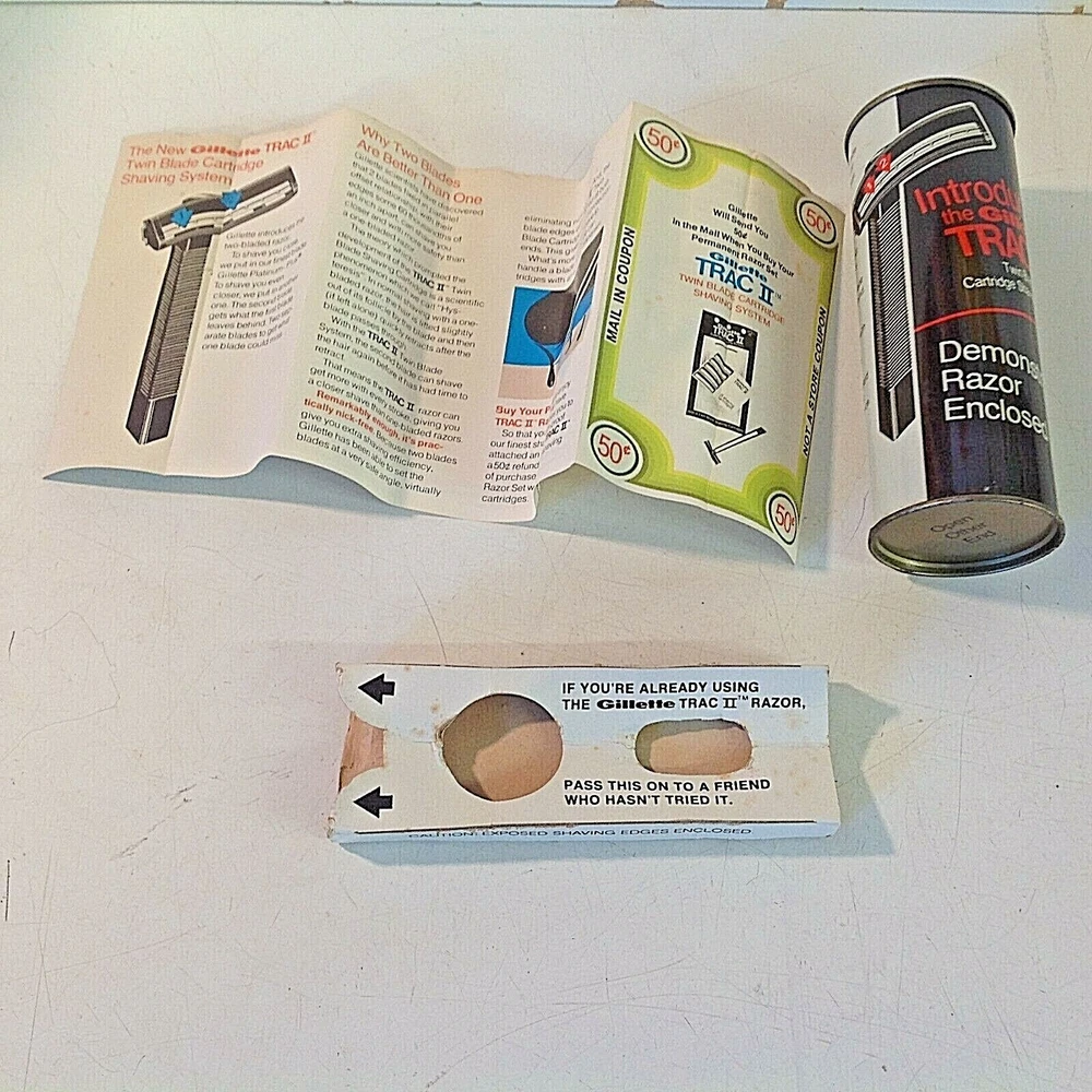 You are bidding on this Vintage 1972 Gillette Trac II Demonstrator Razor w/Can Coupon Booklet Twin Blade This is a vintage used item, in good used condition, with some signs of age/wear; there is rubbing/scuffing to surface of can, mild residue along/about base/top rims, canister has been opened, with no lid and slight misshaping, while paper coupon and insert box bear rubbing/scuffing, creasing/crinkling and mild fading. Overall razor quality is good, smooth/clean, with good preservation of plastic and metal still clean/sharp, and appears unused. There are no excessive nicks, chips, cracks, breaks, stains, residue or repairs. The razor measures approx 4.75" x 1.5", while can measures approx 5.75" tall, with 1.75" wide mouth and base. Thanks for looking and please see our other items up for auction. LOTS more in our EBay store, all items BIN and most with Make Offer options. Auction style items transfer to Ebay store in the event of ending without bids. Michigan residents will pay 6% sales tax. PLEASE NOTE WE WILL NOT END AUCTIONS EARLY!! ALSO, Please understand that we will not adjust product prices on international shipping in order for you to pay a cheaper Customs Fee - by doing that if there is an issue with you receiving this this or any of our items or it arrives damaged - I would only be able to claim what is on the Customs paperwork. ALL CUSTOMS FEES WILL BE PAID BY BUYER - WE WILL NOT BE RESPONSIBLE FOR ANY CUSTOMS FEES. It is also fraud to alter federal paperwork. All returns must be returned in the same condition in which it was received.