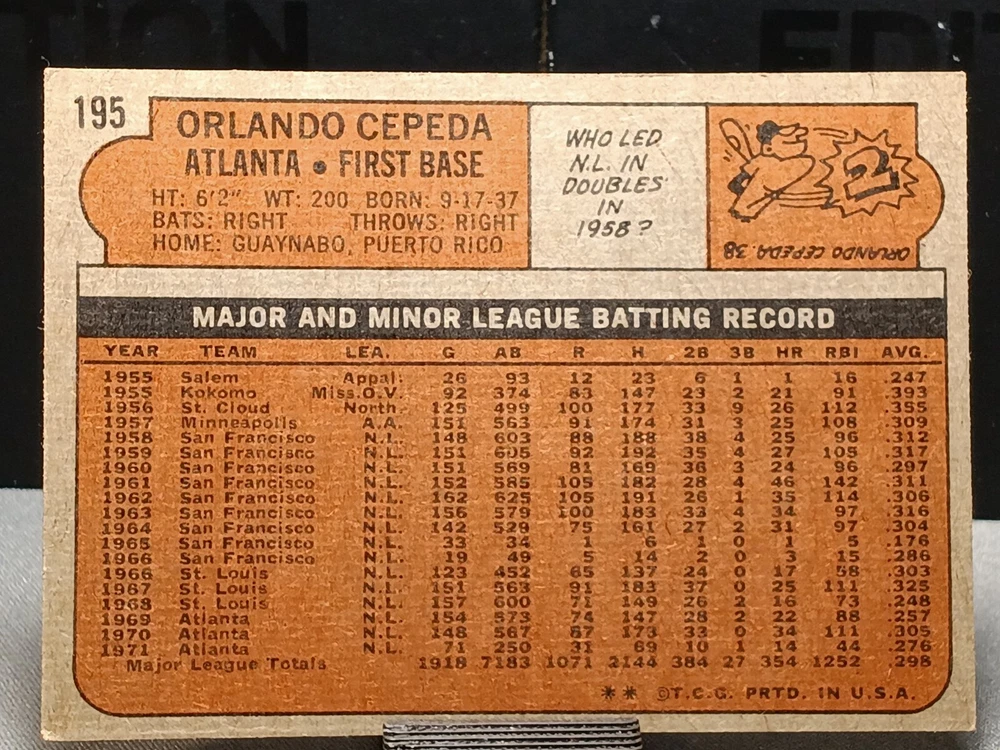 This vintage 1972 Topps baseball trading card features Orlando Cepeda, a former Major League player for the Atlanta Braves. The card is made of high-quality card stock with a thickness of 20 Pt. and is an original, not a licensed reprint. It belongs to the base set of 1972 Topps cards and has the card number 195. The front of the card displays a full-color image of Orlando Cepeda in his Atlanta Braves uniform, while the back provides information about his career and stats. This card is a must-have for any baseball fan or collector, especially those who appreciate vintage cards from the Post-WWII era. Add it to your collection today!