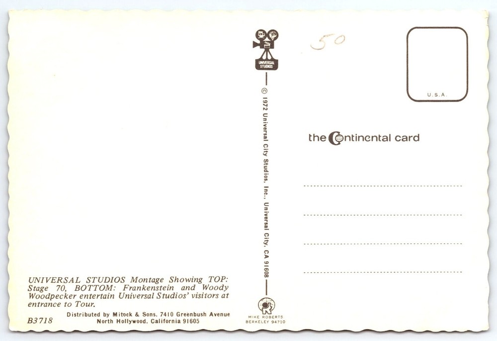 This vibrant 1972 postcard from Universal Studios in Universal City, California captures a lively scene at the entrance to the park's famous tour. It prominently features iconic characters Frankenstein and Woody Woodpecker entertaining children, with a colorful backdrop including film production equipment and classic amusement park elements. The postcard offers a nostalgic glimpse into the golden era of studio tours and character meet-and-greets that defined mid-century theme park experiences. Printed as a continental size (6 x 4 inches) with scalloped edges, this postcard was distributed by Mitock & Sons and bears the distinctive logo of Universal Studios and The Continental Card brand. The card is a paper stock postcard typical of early 1970s production, showcasing bright lithographic color printing and a montage style composition. It holds collectible appeal for fans of vintage amusement park memorabilia, classic film history, and character-themed souvenirs. SHIPPING COST: ALL ORDERS ARE EXPIDITED, ORDERS ARE TYPICALLY SHIPPED WITHIN TWO HOURS OF MY RECEIPT OF PAYMENT UNLESS I AM OUT OF TOWN SOURCING NEW ITEMS OR MY STORE IS IN VACATION MODE BOTH OF THESE MITIGATING FACTORS ARE RARE. SEE MULTIPLE SCANS OF ITEM. Please use eBay magnifier for a more detailed view of the item. CONDITION: Moderate wear and some soiling. Combined shipping always available on multiple items. PLEASE USE THE E-BAY SHOPPING CART AS IT MAKES COMBINED SHIPPING EASIER TO SEE. Thank you! I have a great passion for collecting postcards, photographs and ephemera. My store offers many rare and hard to find items as well as always being able to guarantee their authenticity as vintage and genuine. Each week I will be posting rare, unusual, high-quality and unique items for the advanced, intermediate and beginning collector. Our items are ALWAYS vintage. Please bookmark our store and I look forward to helping you build your collections!