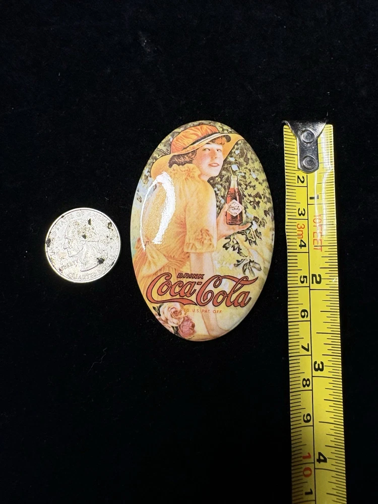 The Vintage 1973 Coca-Cola Oval Pocket Mirror is a collectible advertising piece featuring the iconic Coca-Cola brand. This original multi-color sign from the United States embodies the theme of soda and serves as a nostalgic reminder of a bygone era. Perfect for Coca-Cola enthusiasts or collectors of vintage memorabilia, this pocket mirror is a unique and classic piece that captures the essence of 1970s advertising.