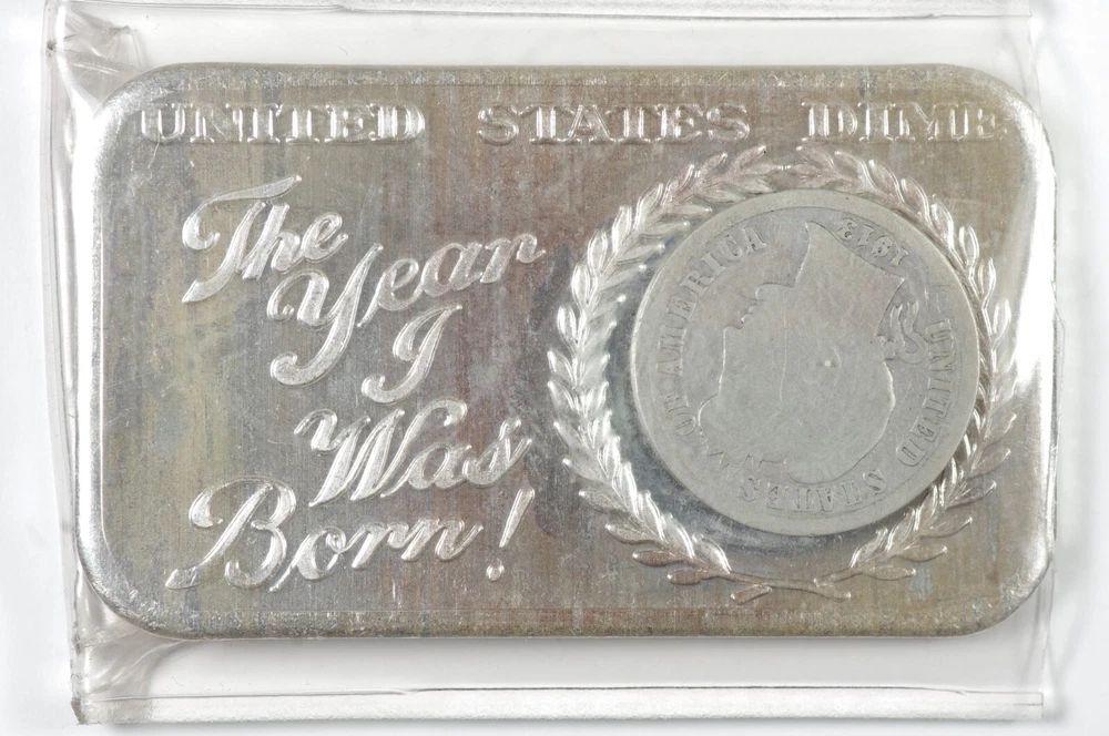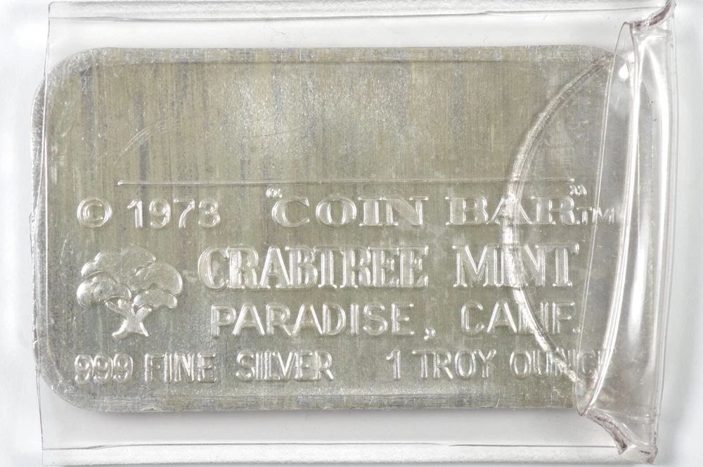 Vintage 1973 "Coin Bar" Crabtree Mint 1 Troy Oz .999 Fine Silver Art Bar [17B25] Note, the dime looks like it was originally glued to the bar, but it has since disconnected and is loose. You will receive the exact item(s) shown in the photos. *Shipping is always combined when multiple lots are purchased on the same invoice. The shopping cart should combine automatically at checkout, or we will send an invoice. Please message us if you have any questions or issues. Returns are easy and free if you are unsatisfied with your purchase for any reason. Satisfaction and authenticity guaranteed. Be sure to check out our other listings!